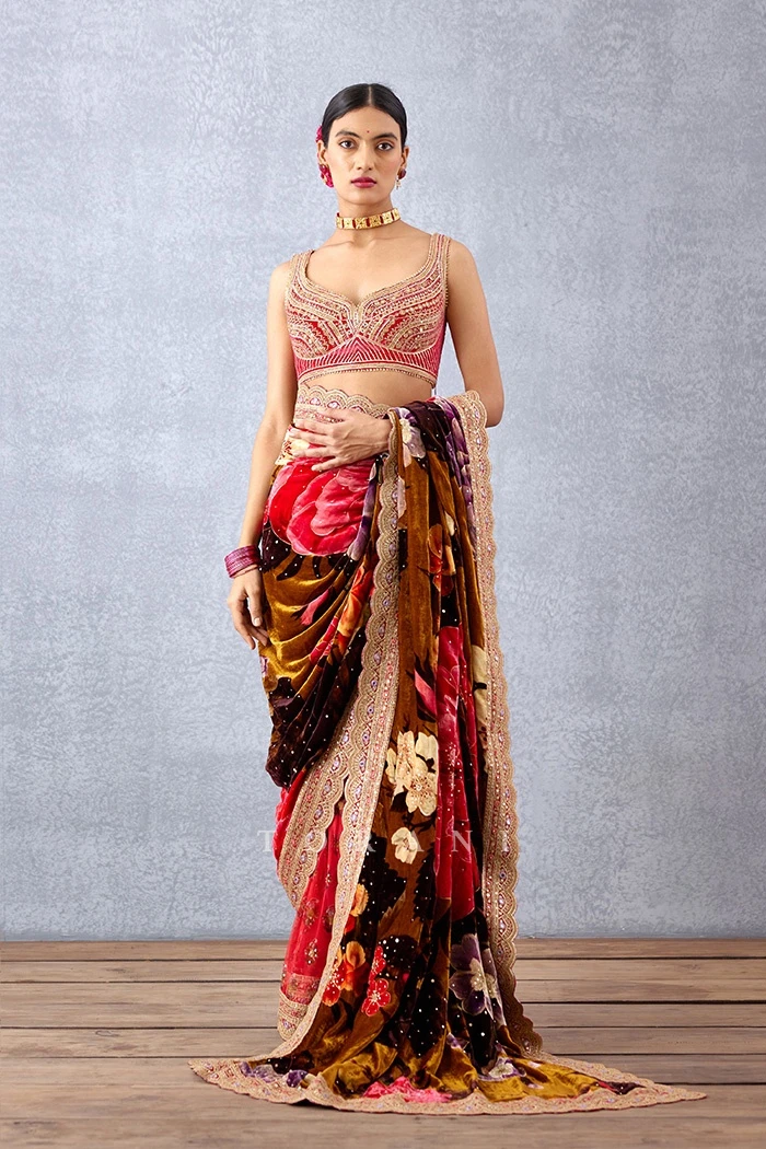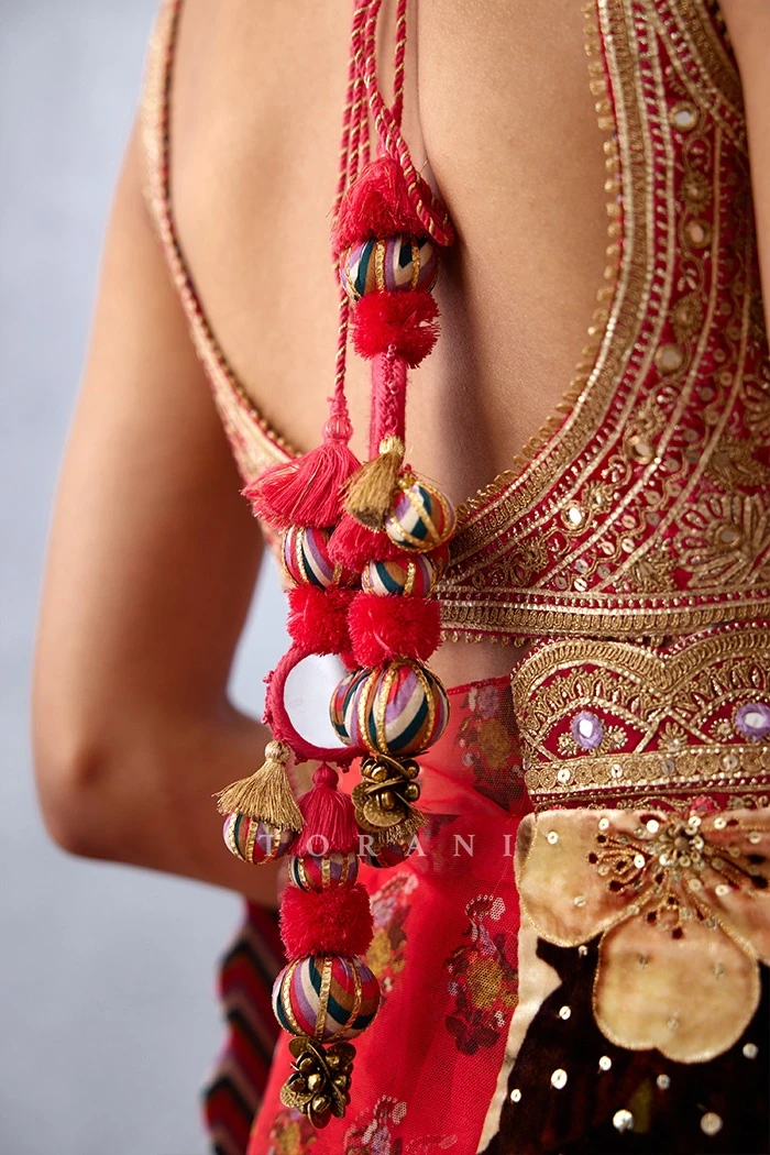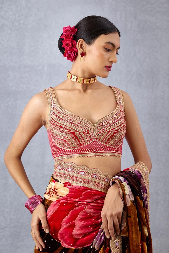 - Ochre yellow heavy hand embroidered choli in silk velvet and chevron lining with back tassels