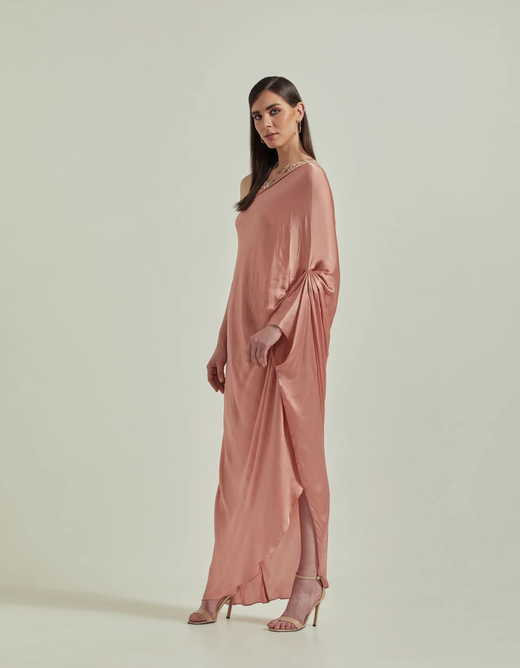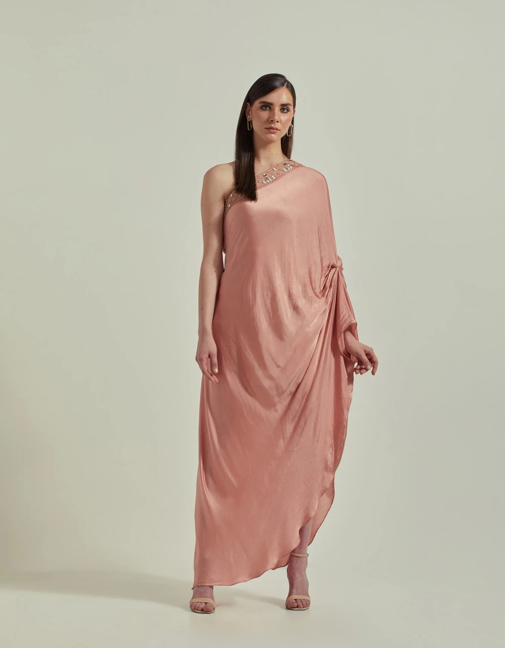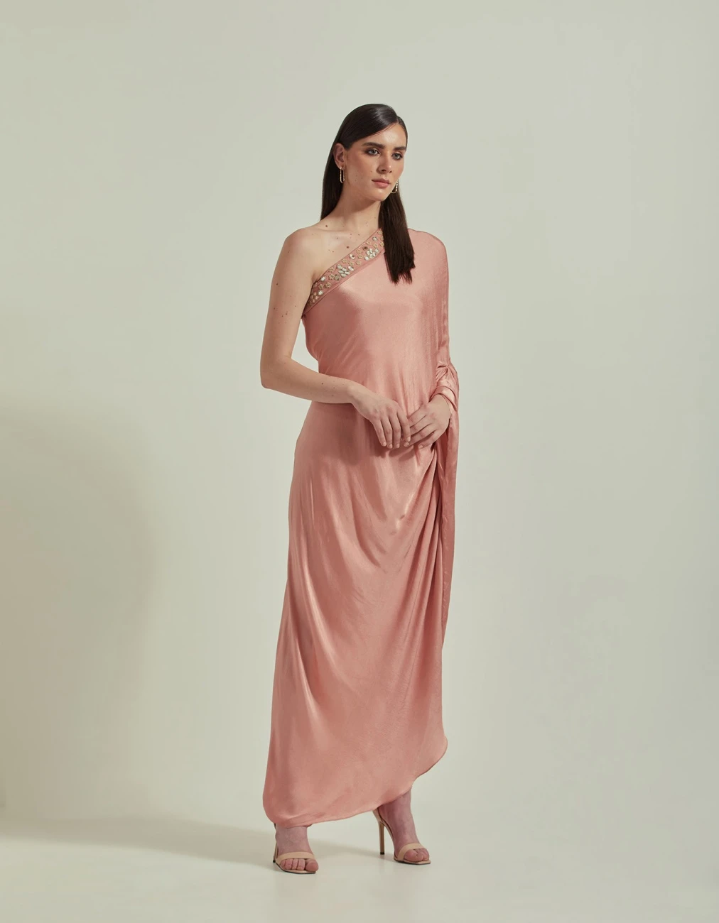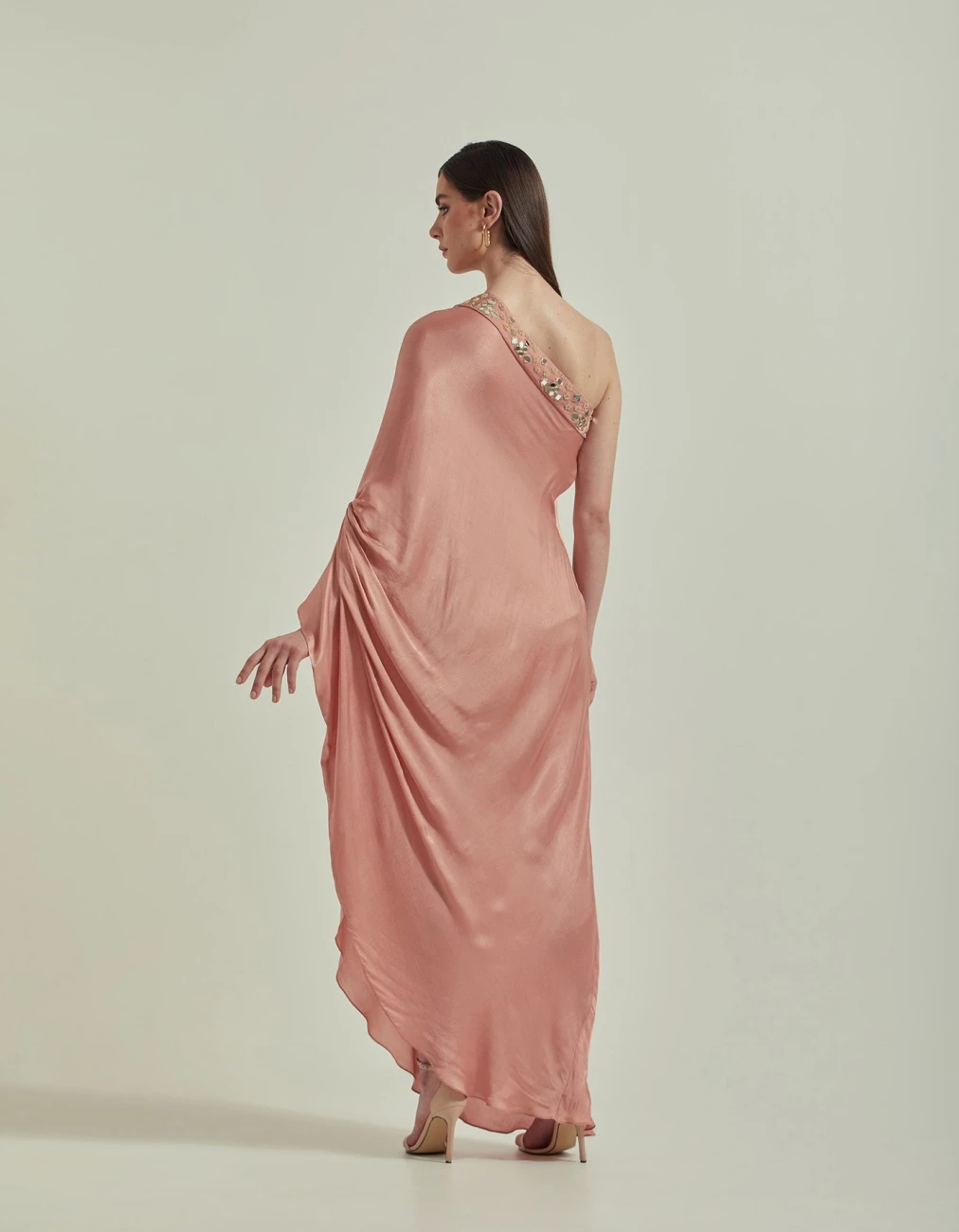 Amber Peach One Shoulder Mirror Work Embellished Dress