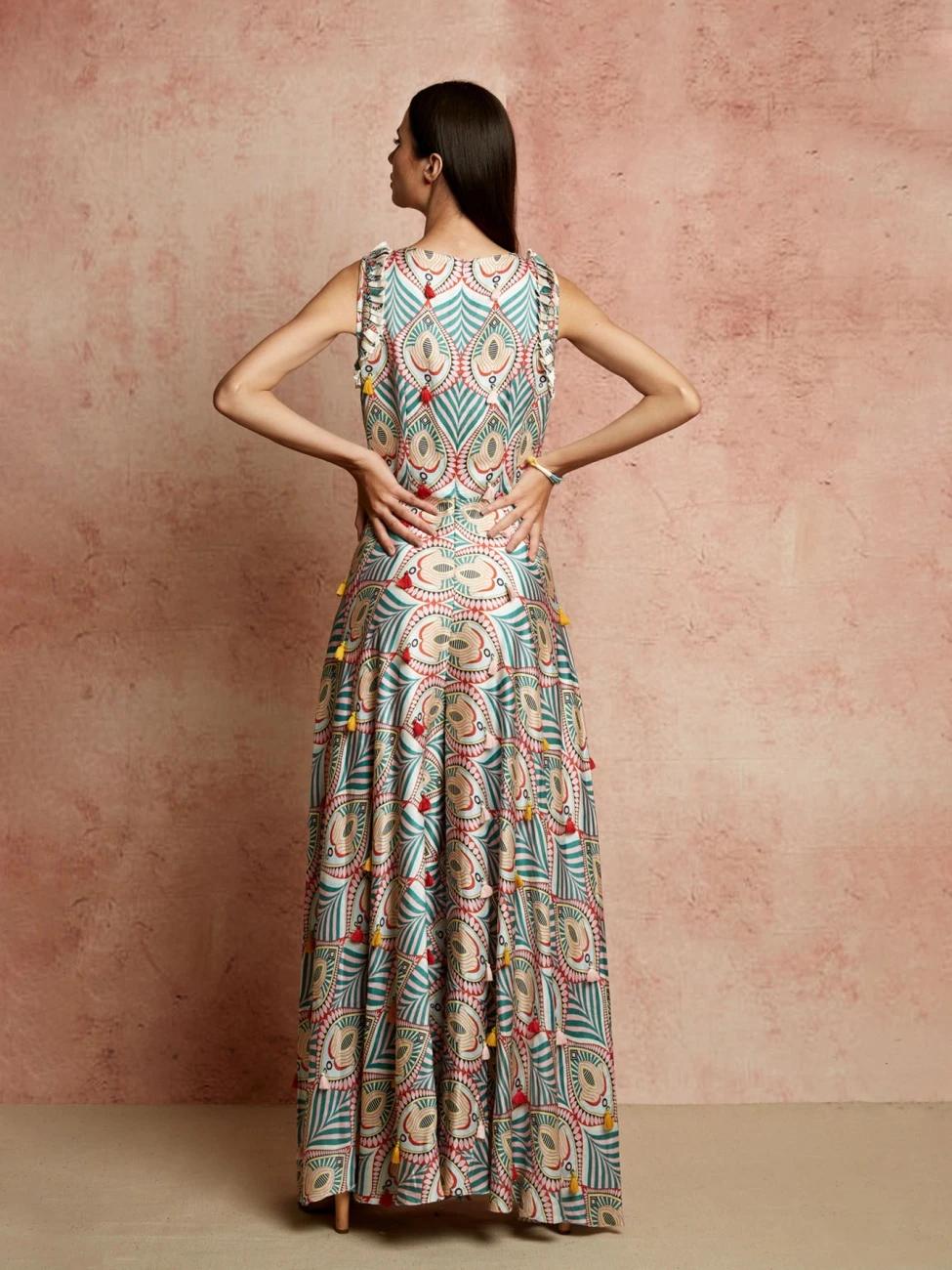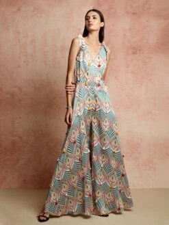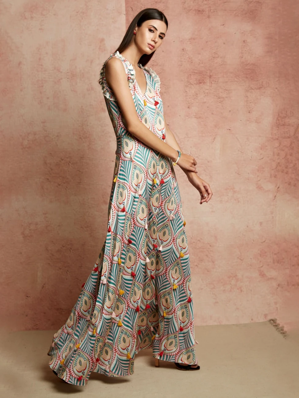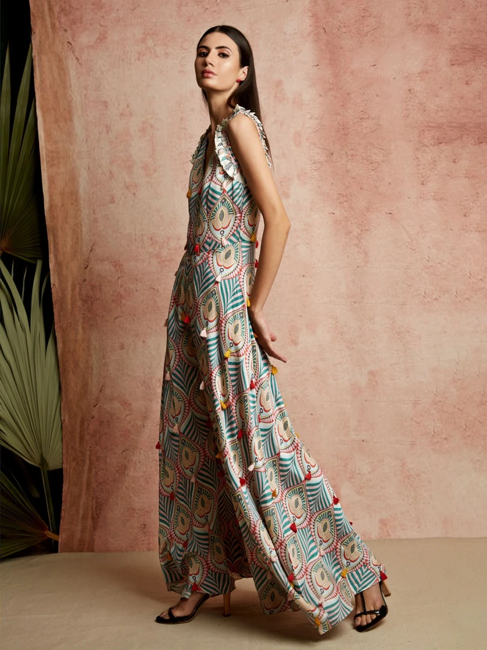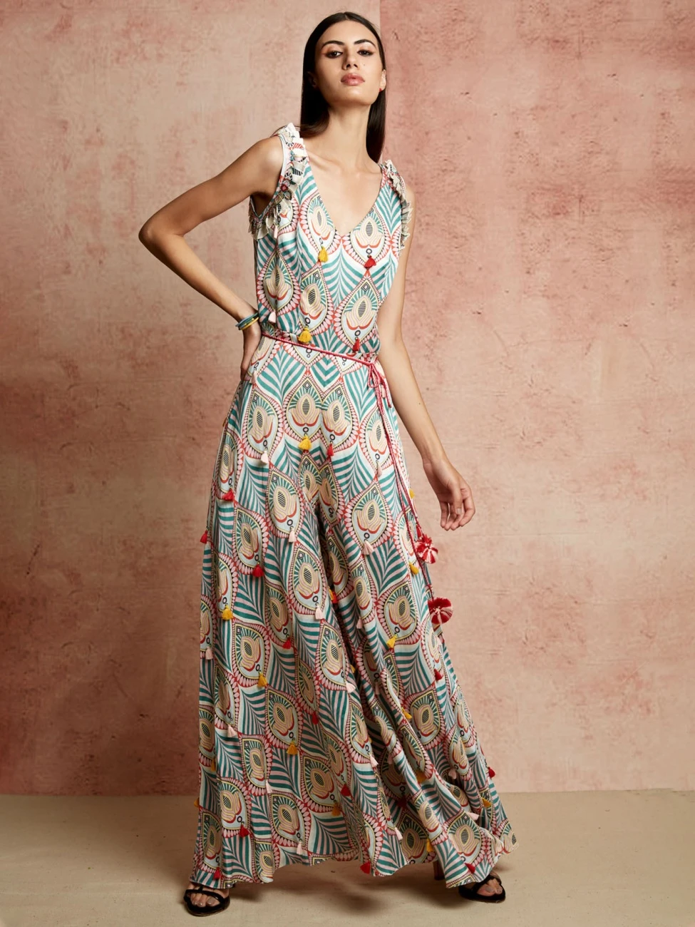 - This is a beautifully printed jumpsuit , adorned with colourful beads and tassels