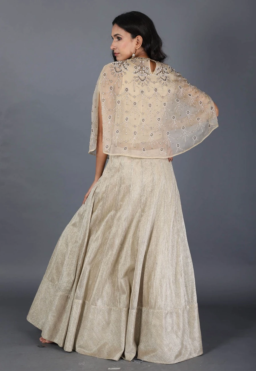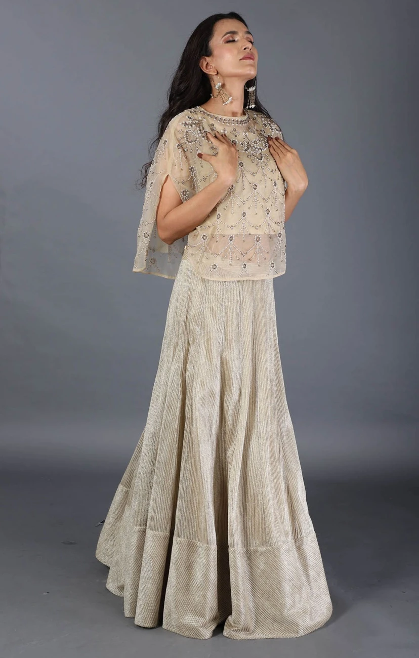 - Beige hand embroidered circular cape paired with textured lehenga skirt