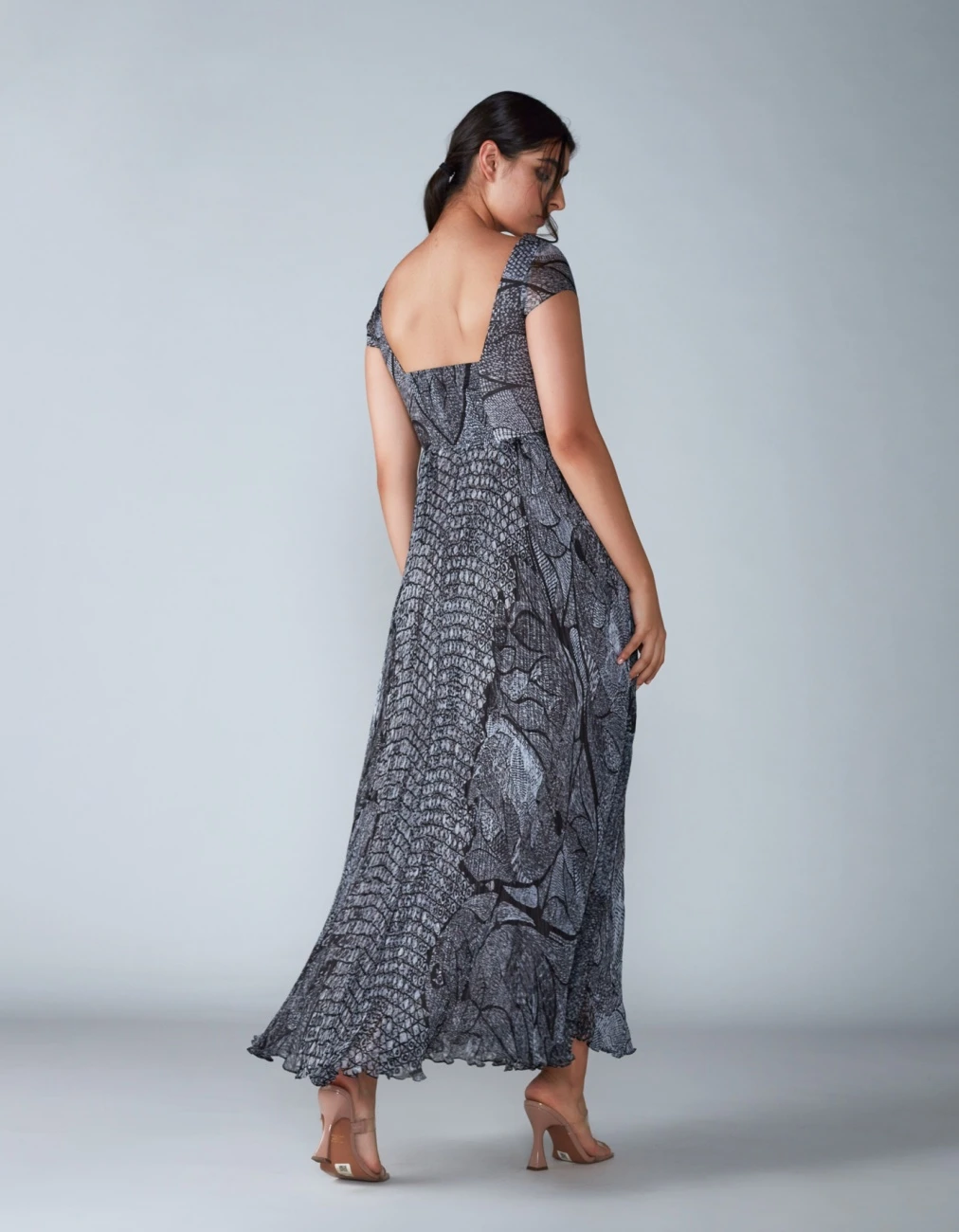 - Abstract tile print hand micro pleated dress with cap sleeves