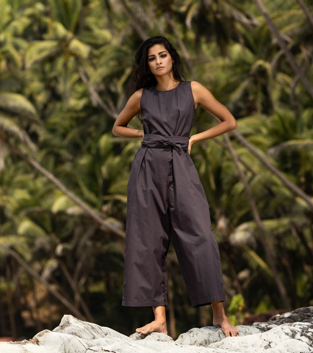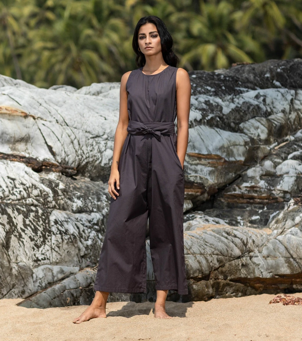 - A solid sleeveless black jumpsuit with relax fit bottom and waist belt adjuster to define your own look