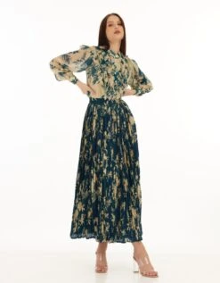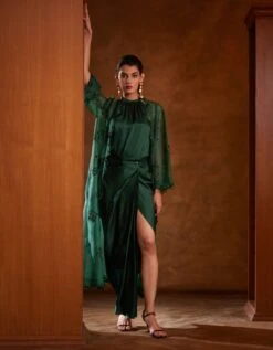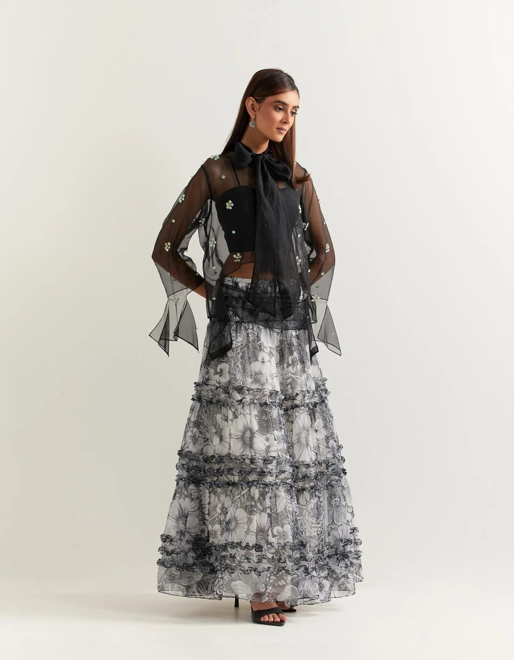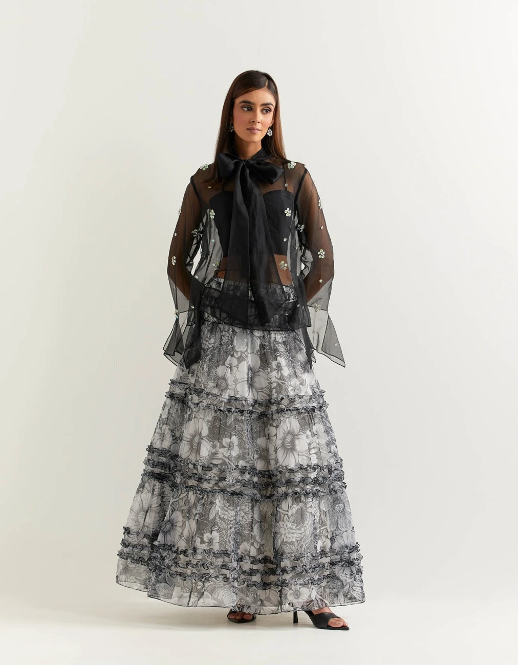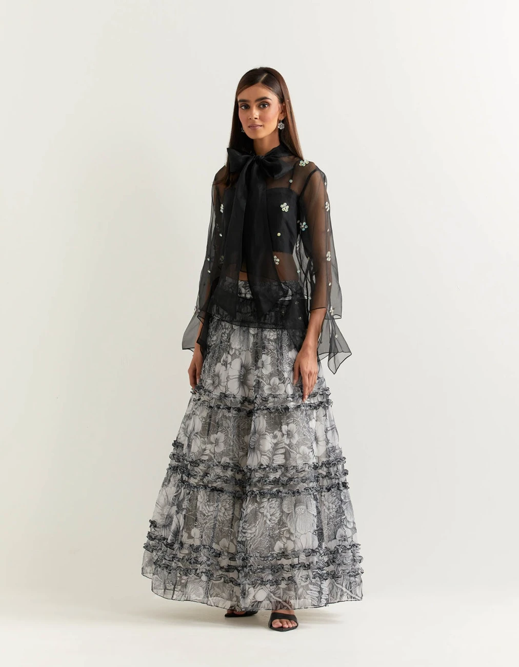- Peplum organza embellished top paired with tiered georgette printed skirt