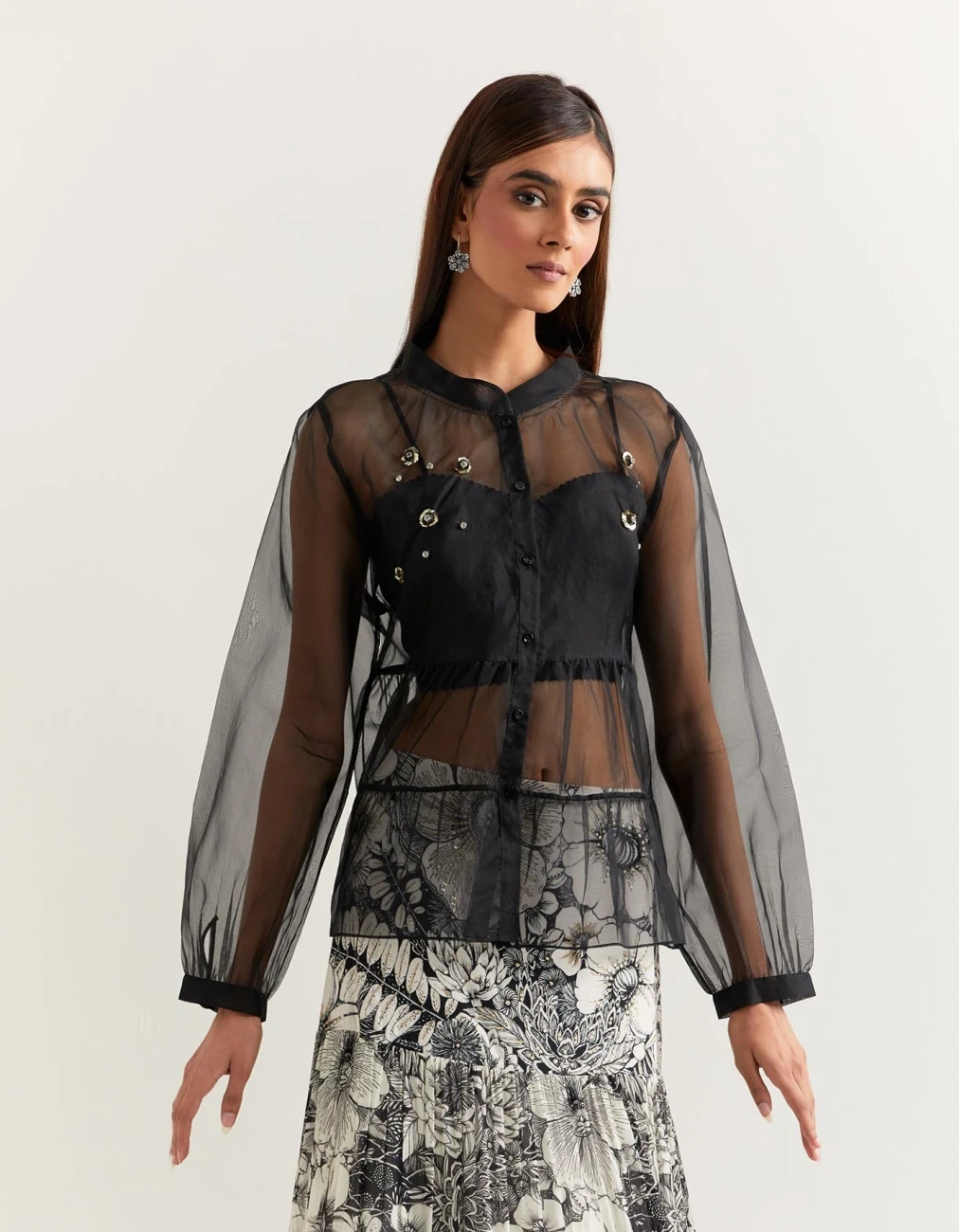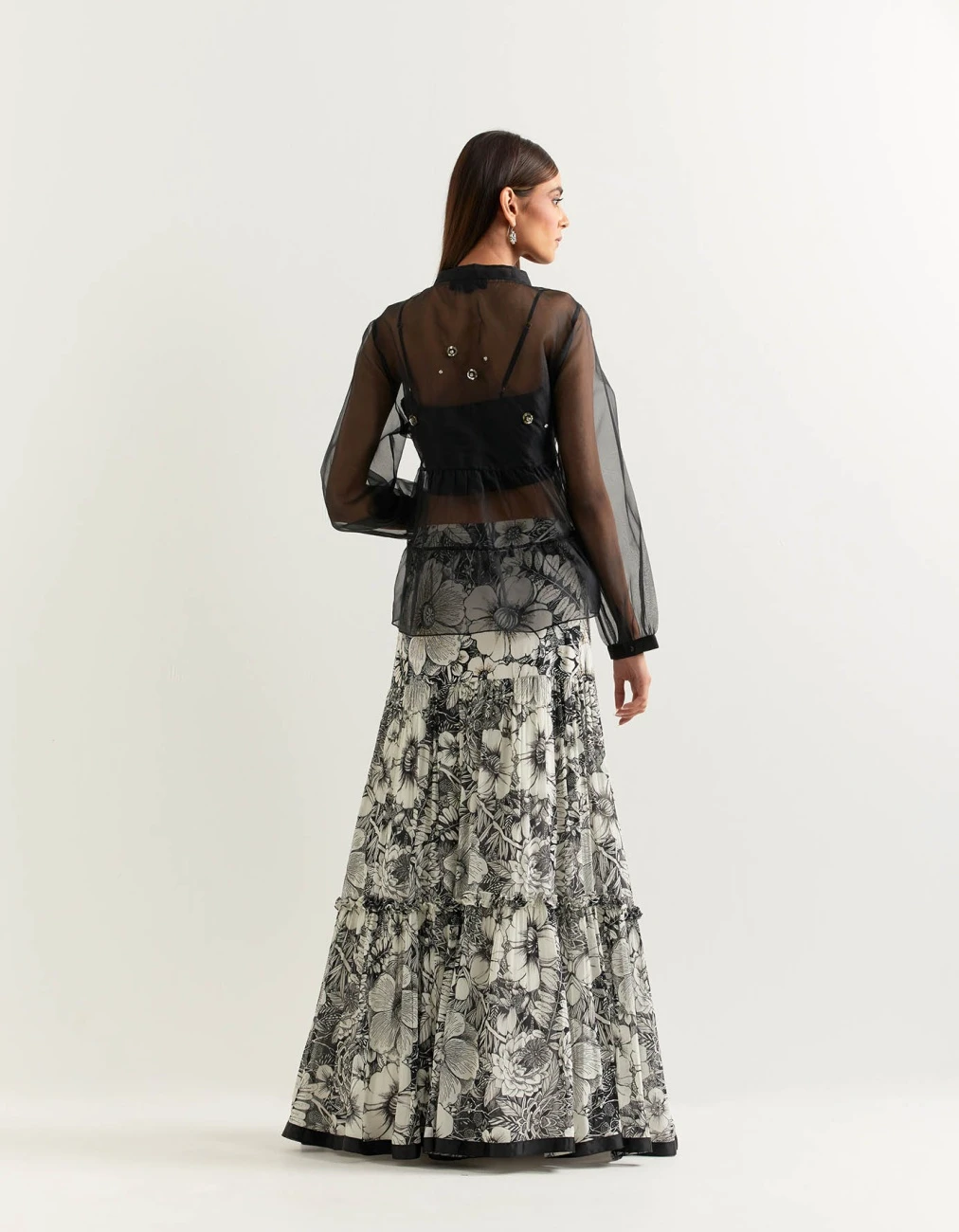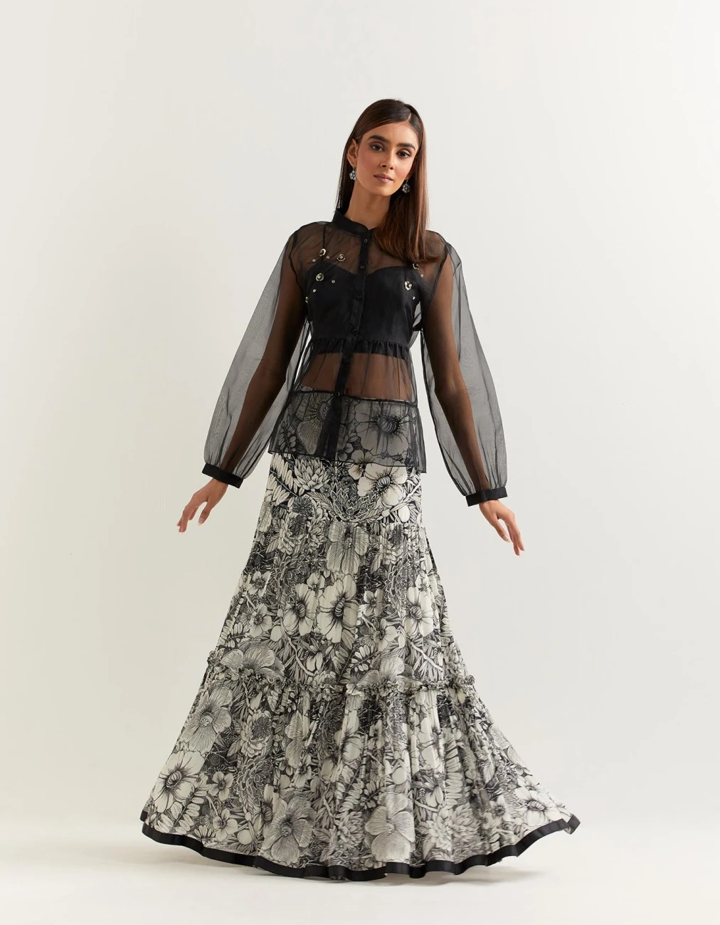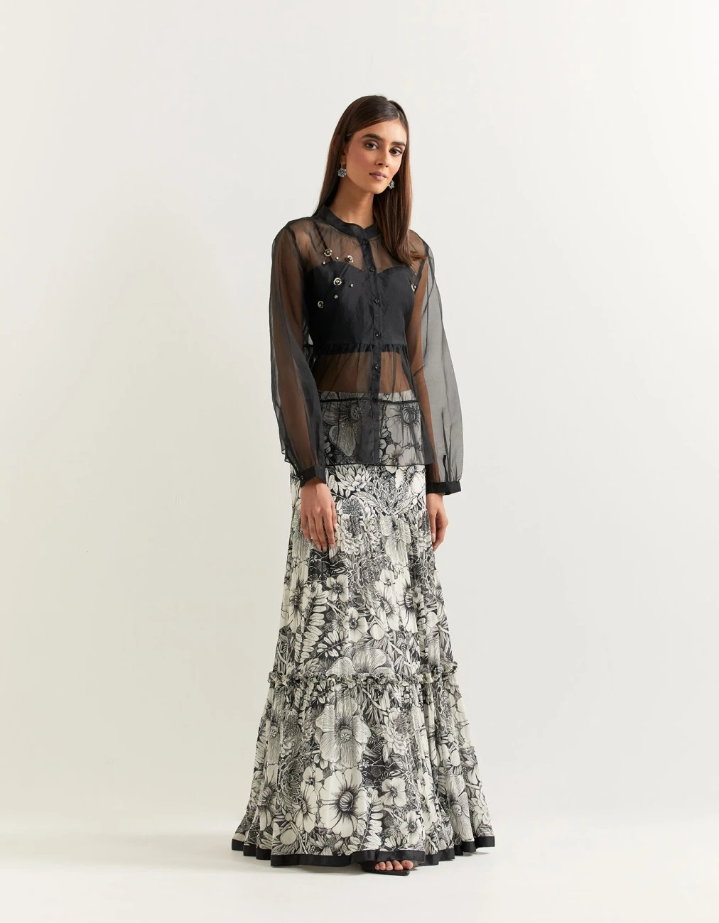 - Peplum organza embellished top paired with tiered georgette printed skirt