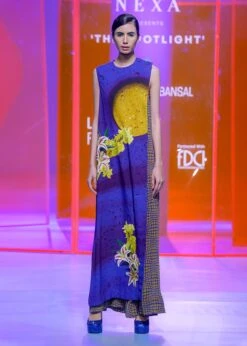 - Oriental Blue, Moon And Flower Print, Embroidered Cape With One Side Closure Paired With Dot Illusion Printed Jumpsuit