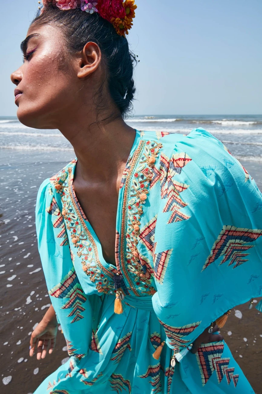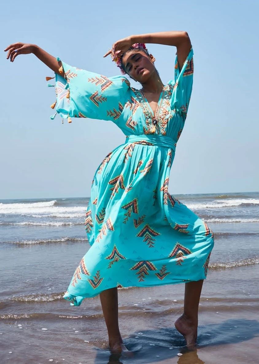 - This crepe dress with a hand embellished neckline to the neatly pleated waist belt is trimmed with fun tassels at neck and sleeves