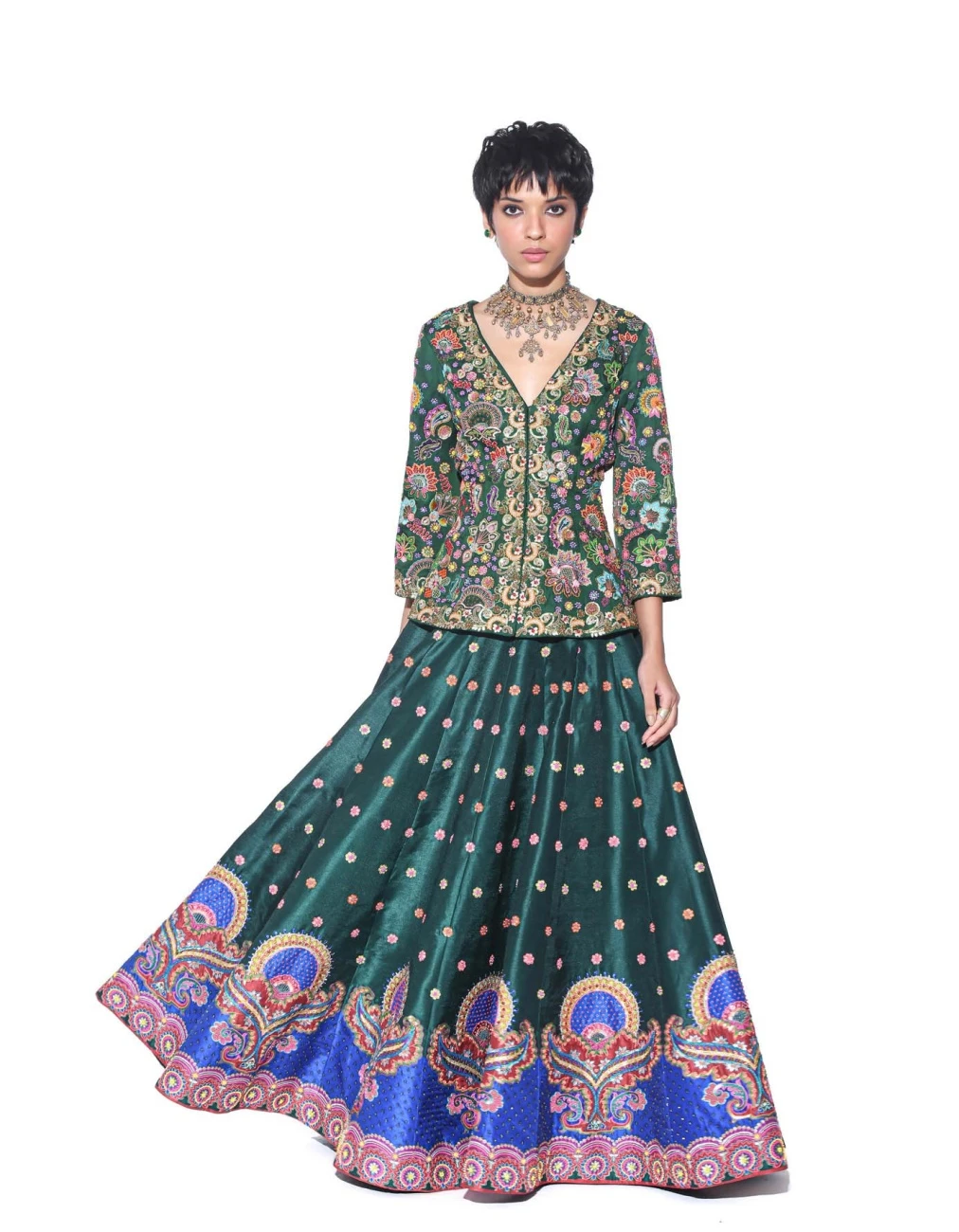 - Bottle green heavy hand embroidery peplum top paired with bottle green hand embroidered lehenga
