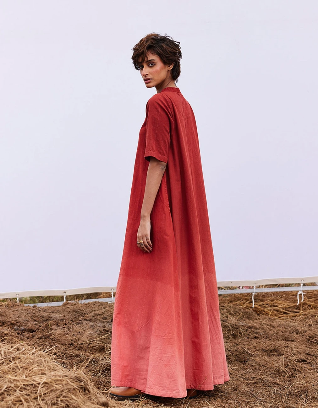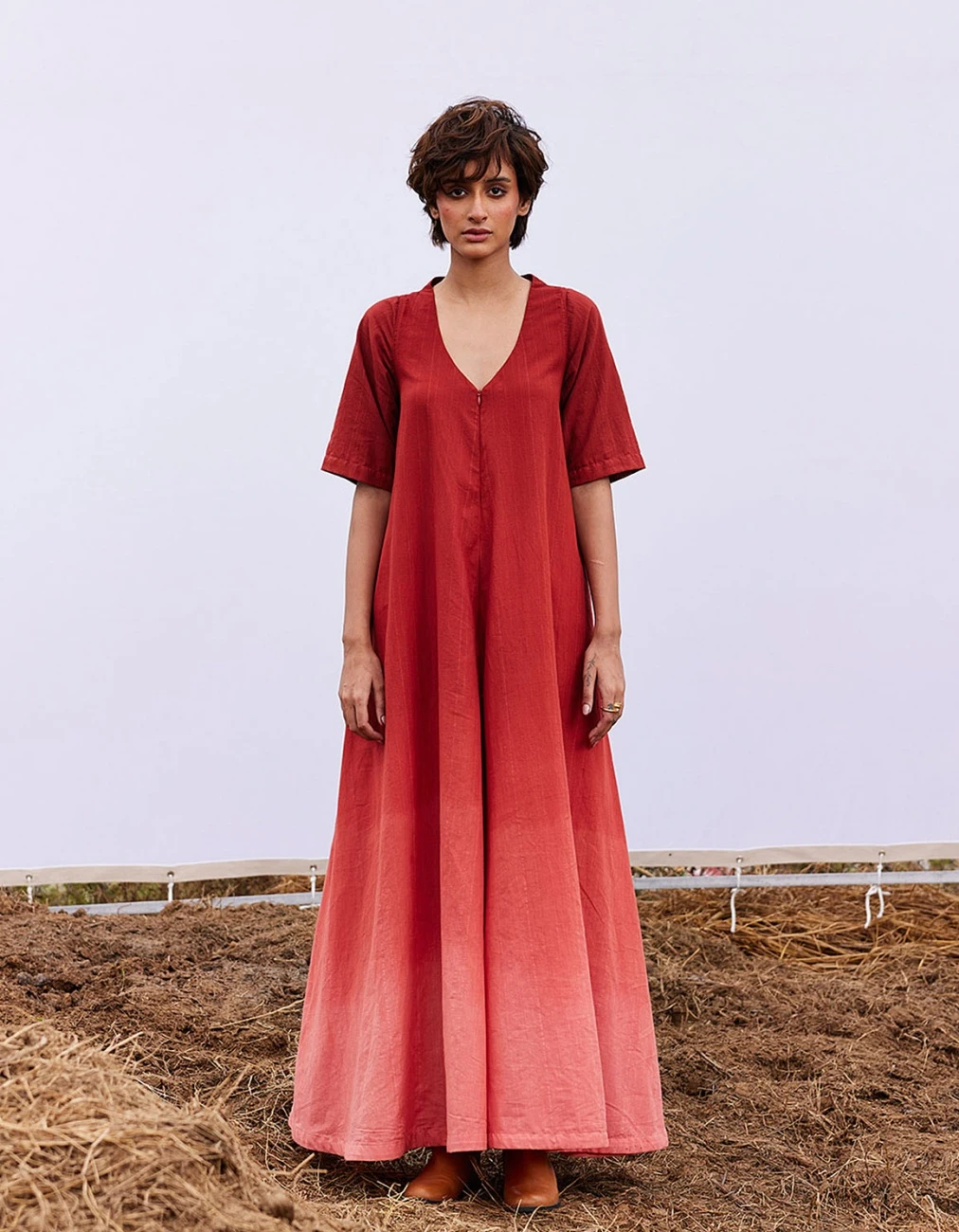 - Featuring an ombre brick red khadi jumpsuit with front zip opening and a v neckline