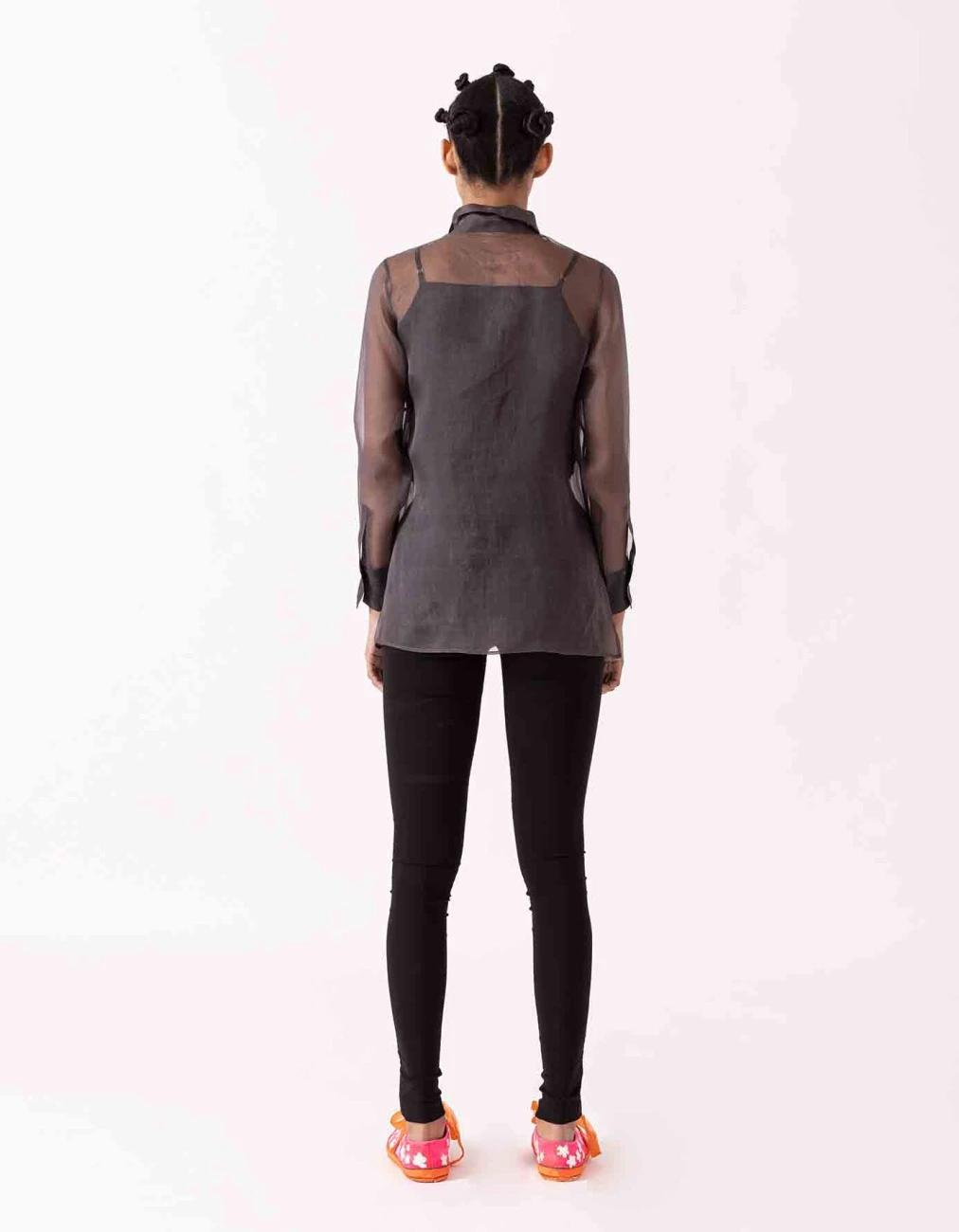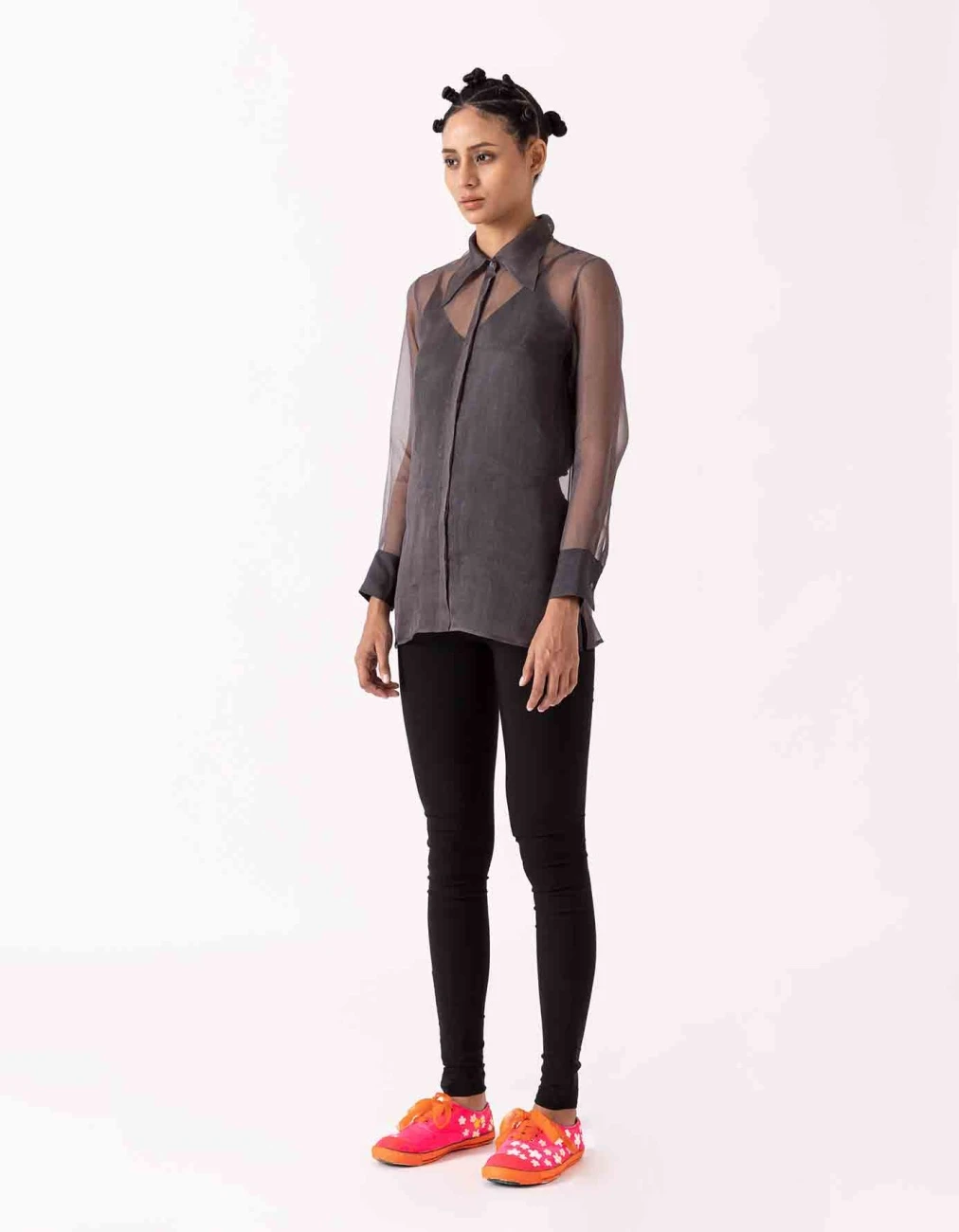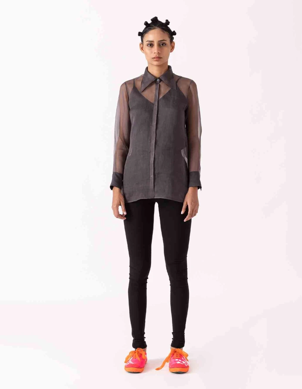 - Elle an elegant sheer organza shirt with exaggerated collar in shade of charcoal