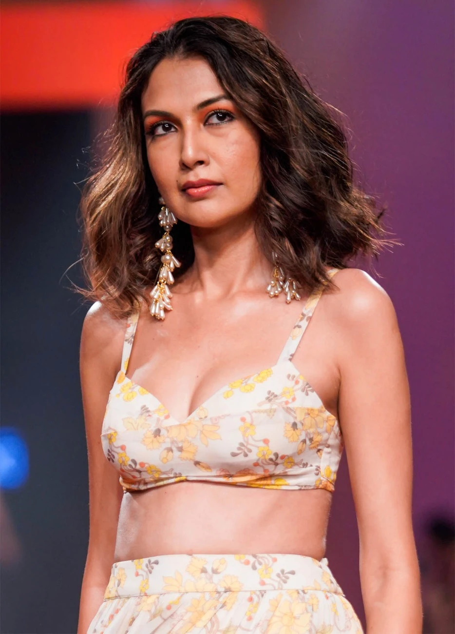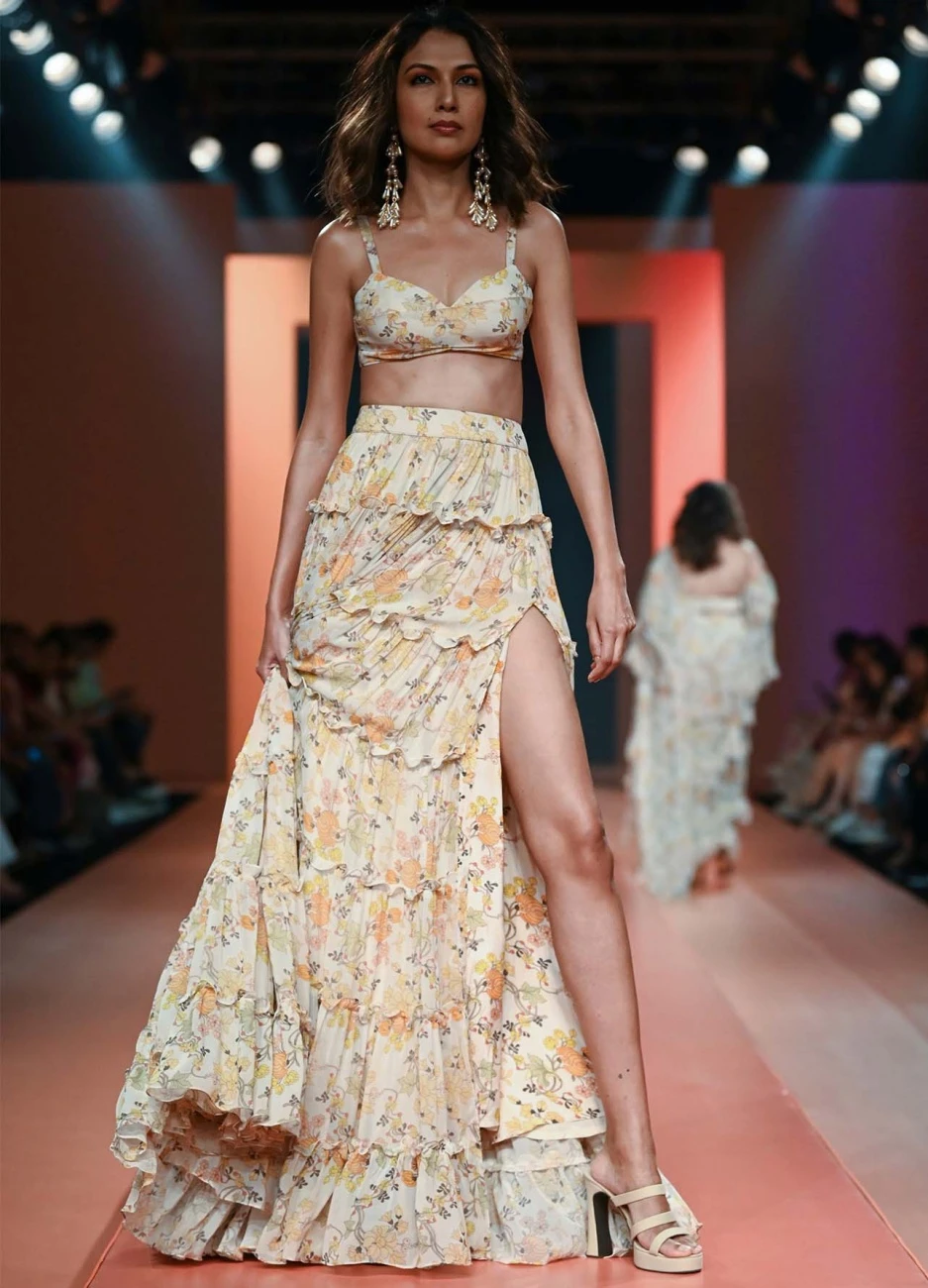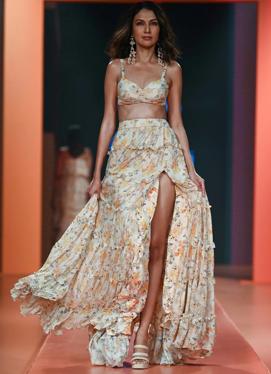 - Coconut and mango floral print tiered skirt and blouse set