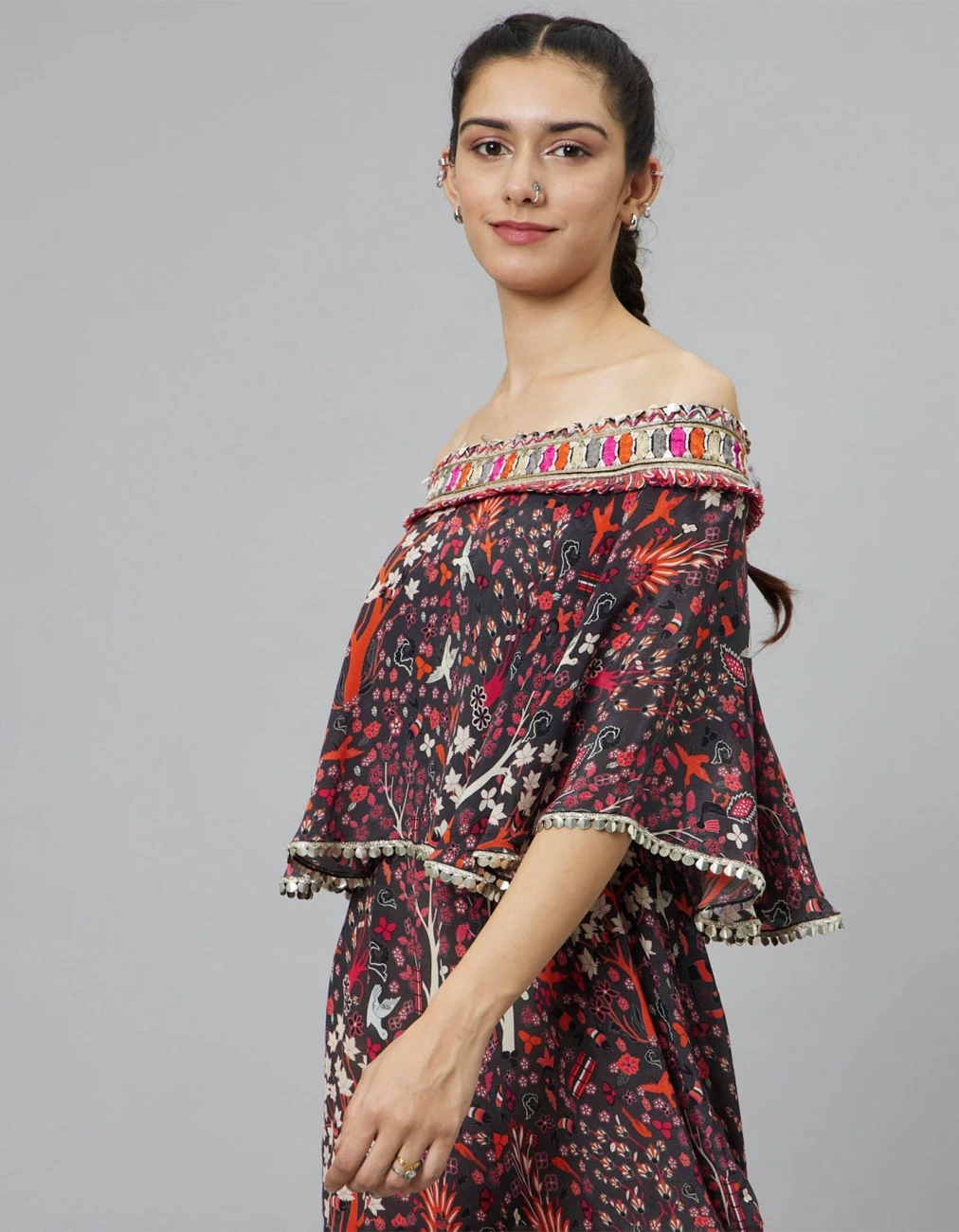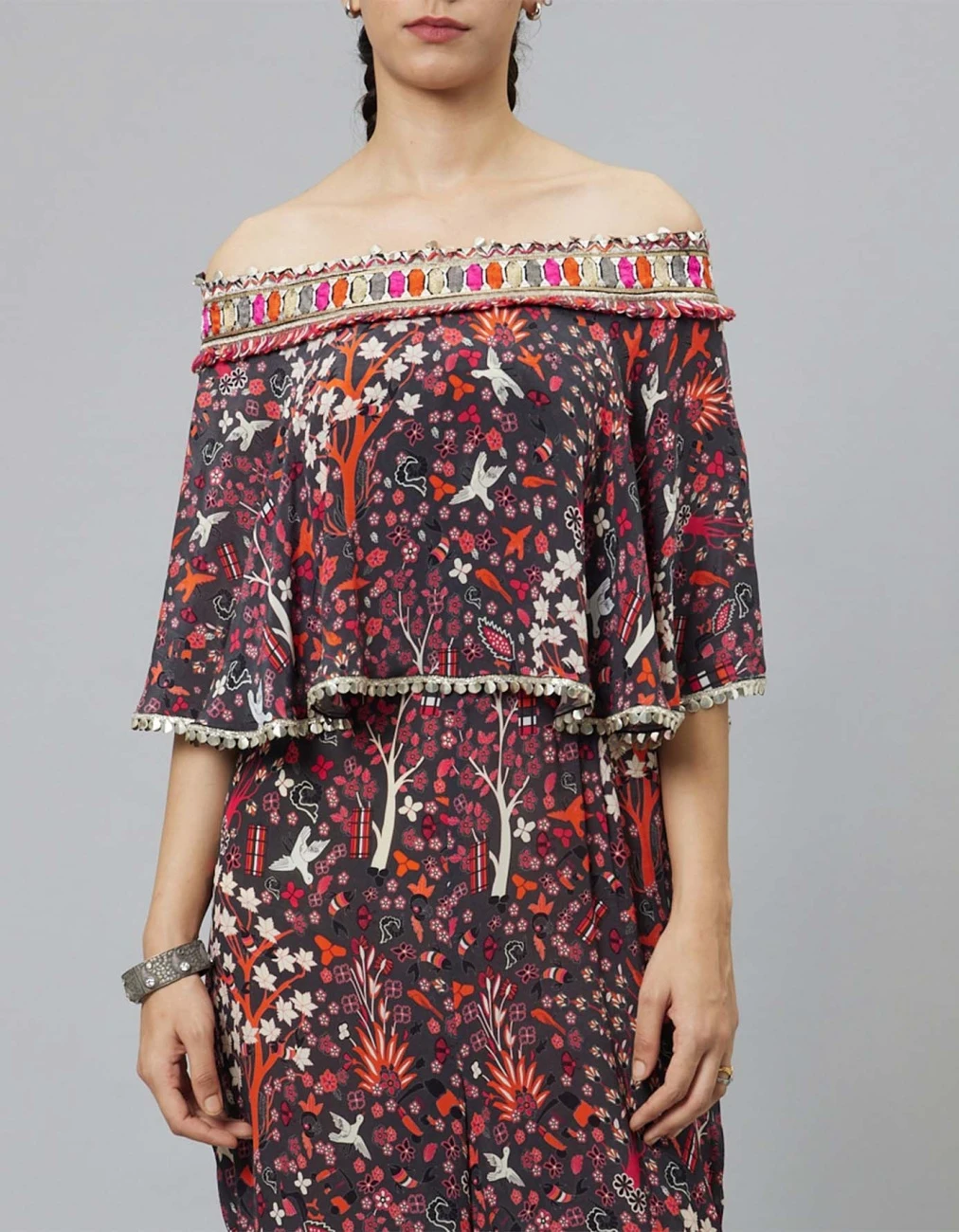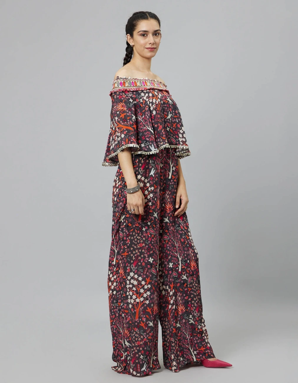 - Concrete Jungle Print Off-Shoulder Jumpsuit With Attached Cape