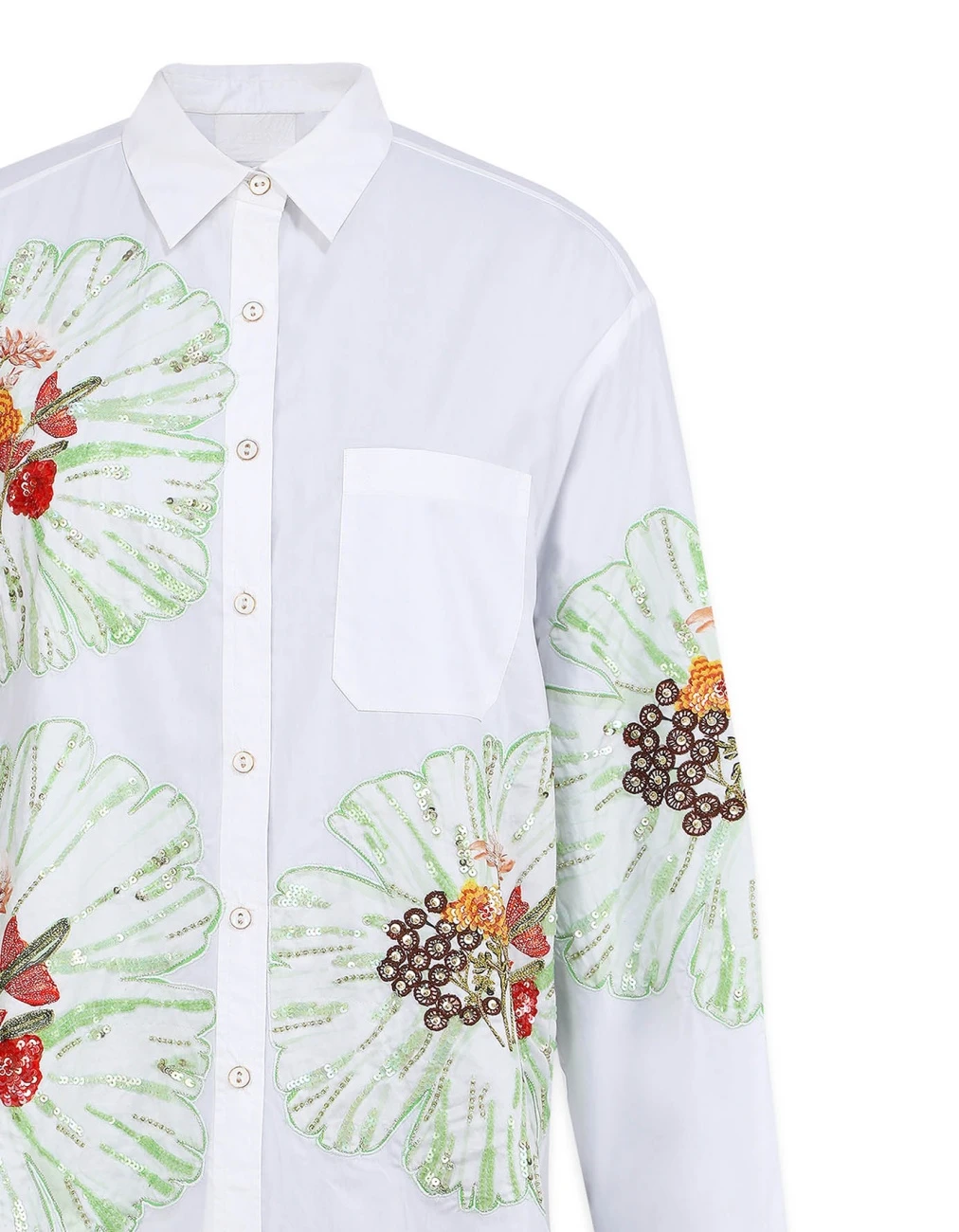 - White Cotton Poplin Carnation Embroidered Oversized Shirt
