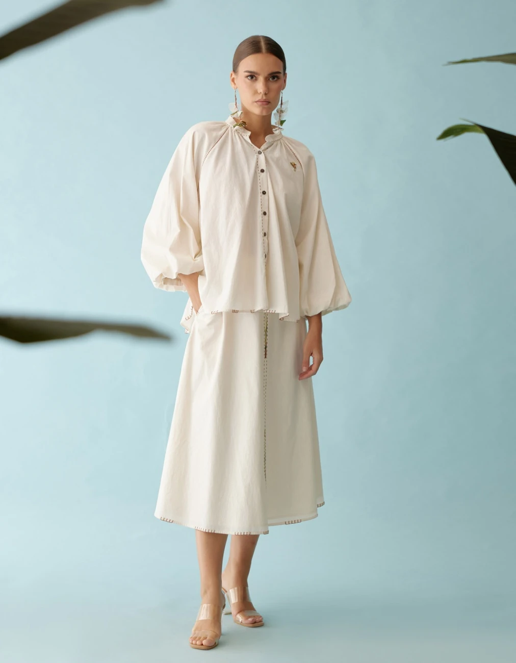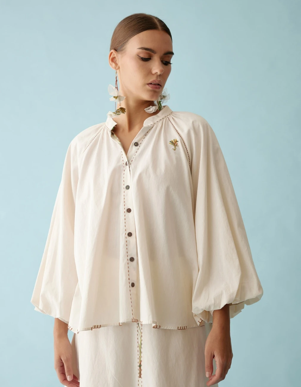- Cream raglan sleeves shirt with hand-stitched details and banana tree applique