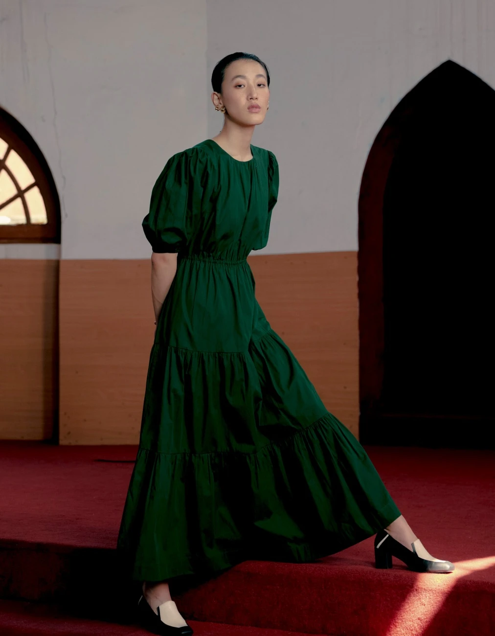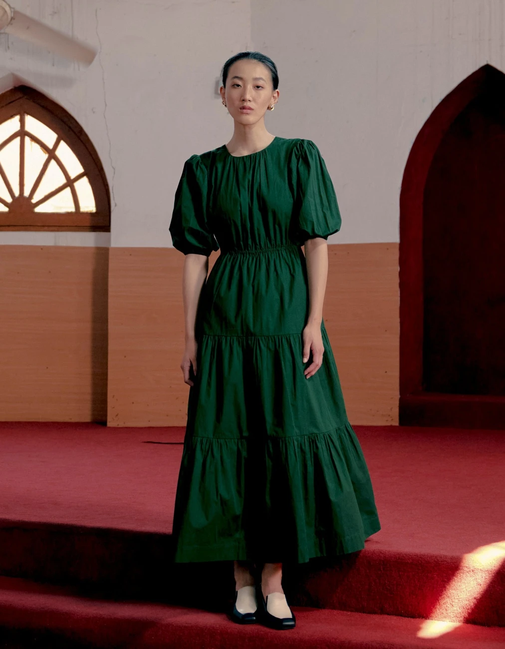 - Made from 100% pure cotton fabric in an emerald green jewel tone and an empire dress silhouette.