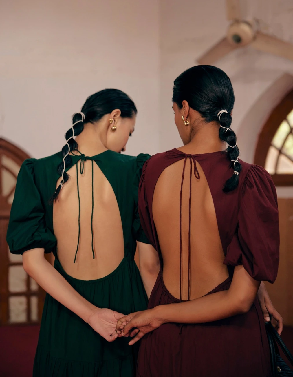 - The Audrey dress features a gathering at the back with a zip fastening and wooden button details.