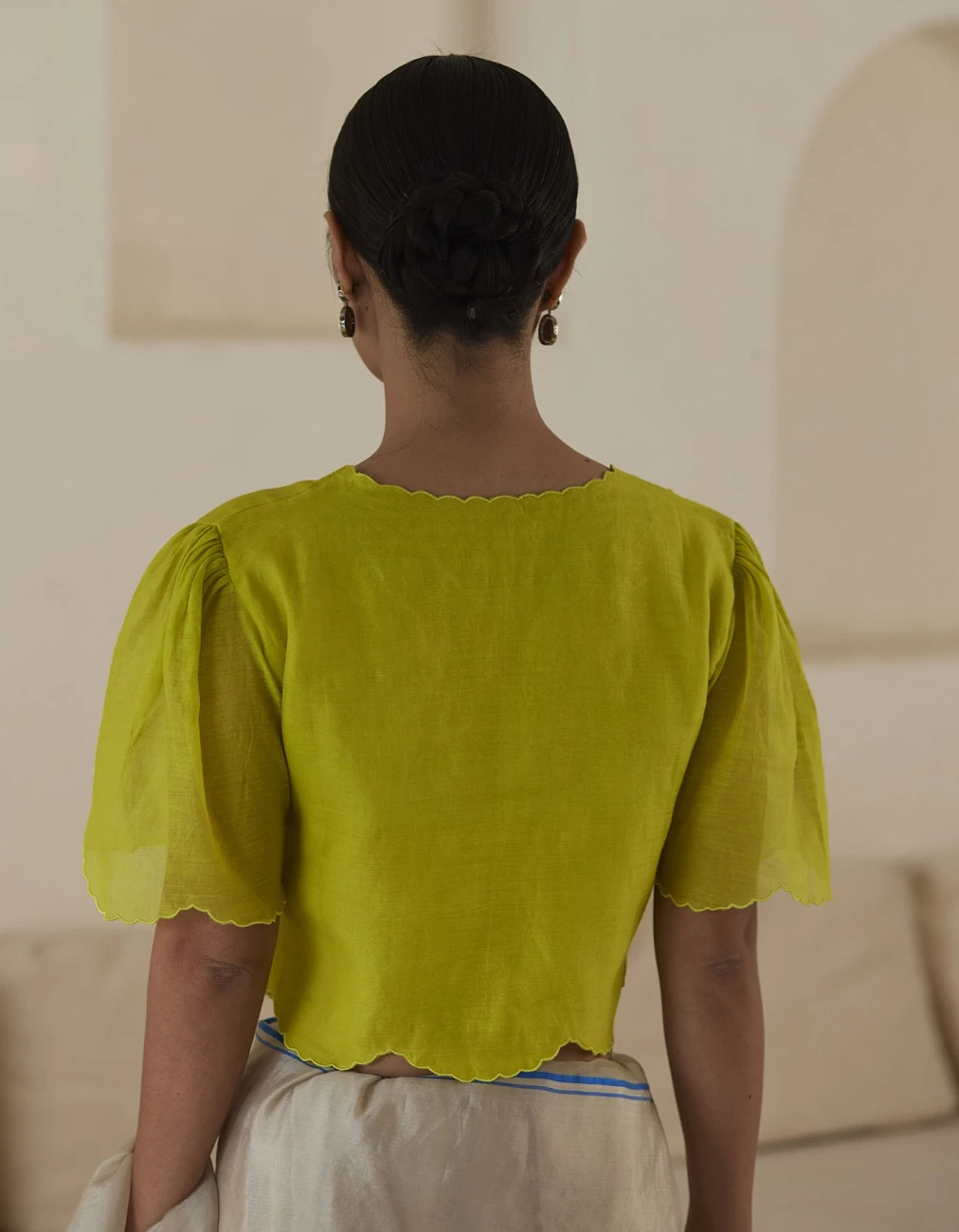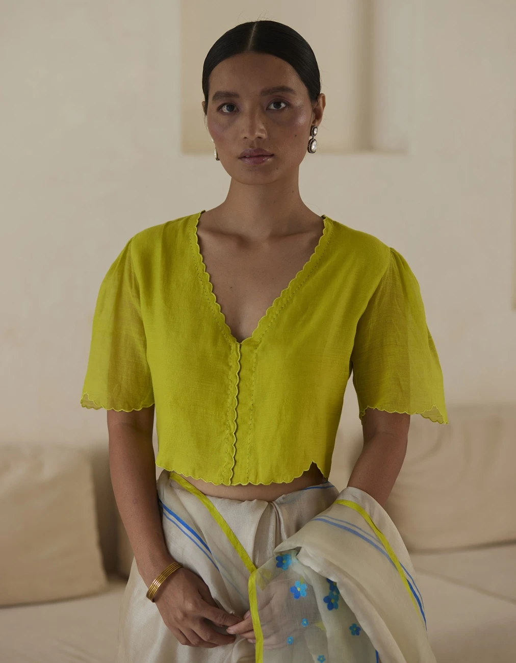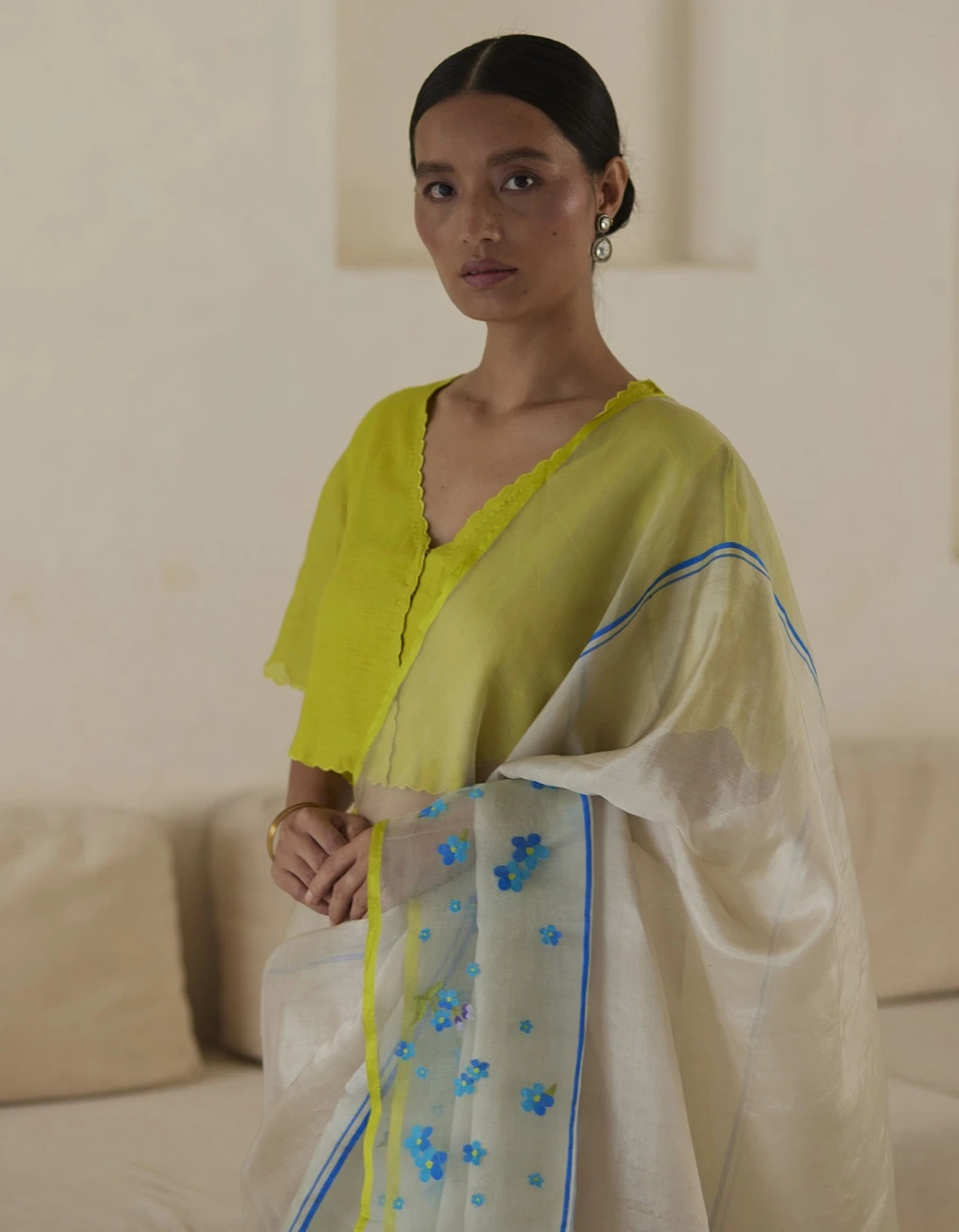- The Fleeting Moments blouse is crafted in handwoven silk khadi, featuring scalloped embroidery edges all over