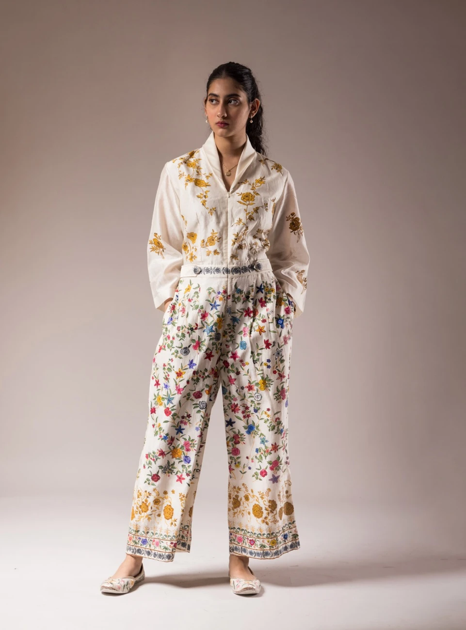 - Full handpainted jumpsuit on ivory silk chanderi