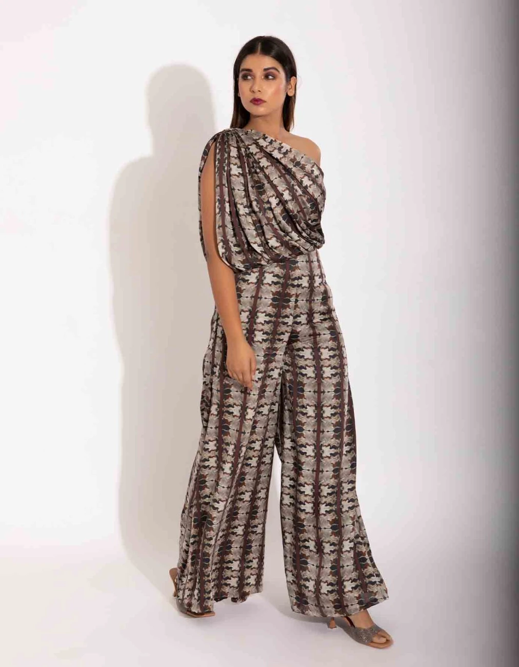 - digitally printed georgette satin jumpsuit with a hand draped bodice
