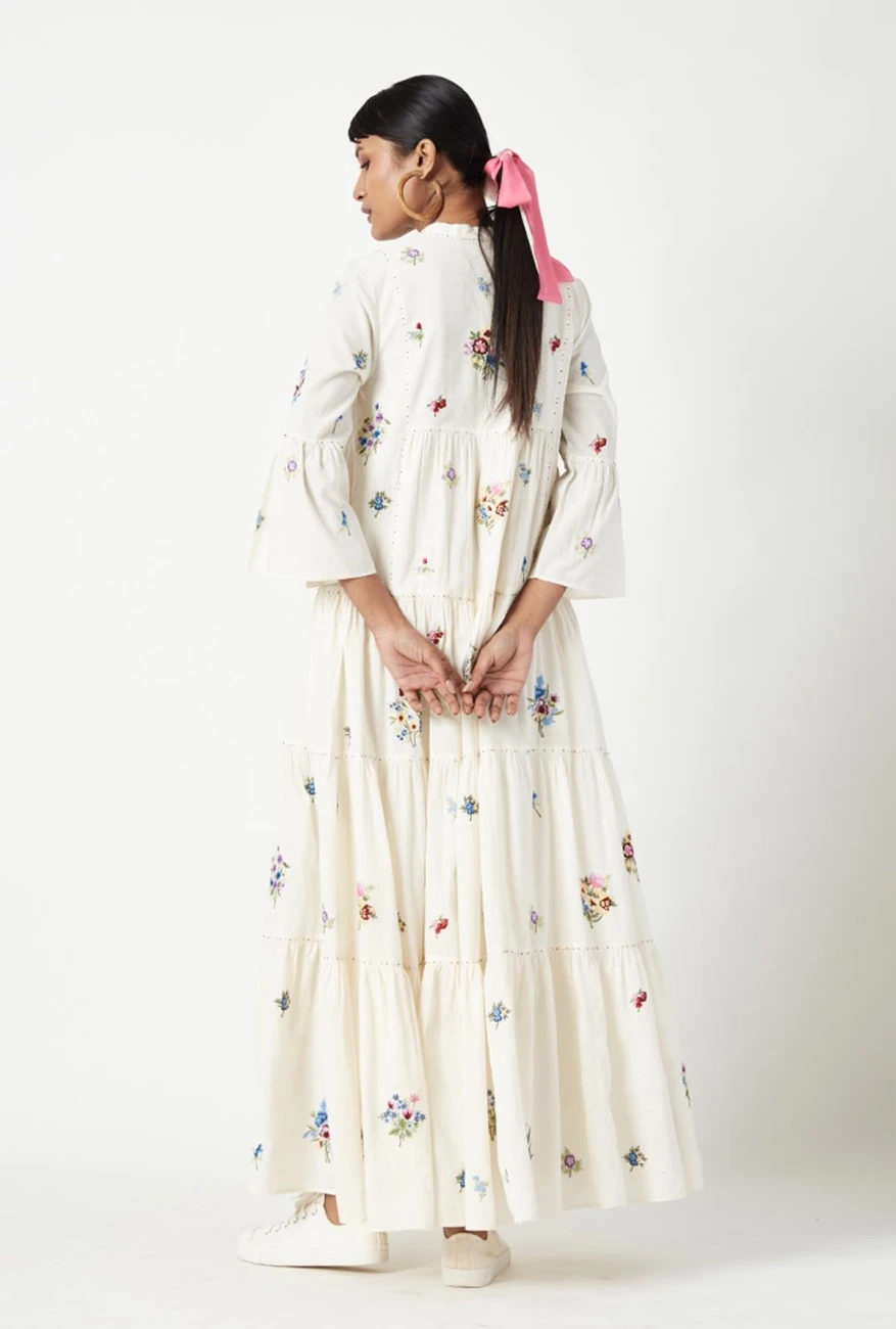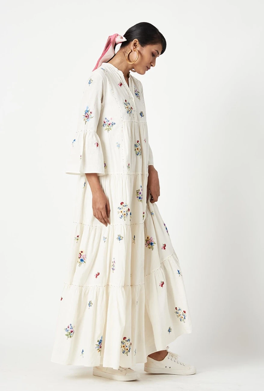- Band collar with all-over multi embroidered dress and gentle gathers