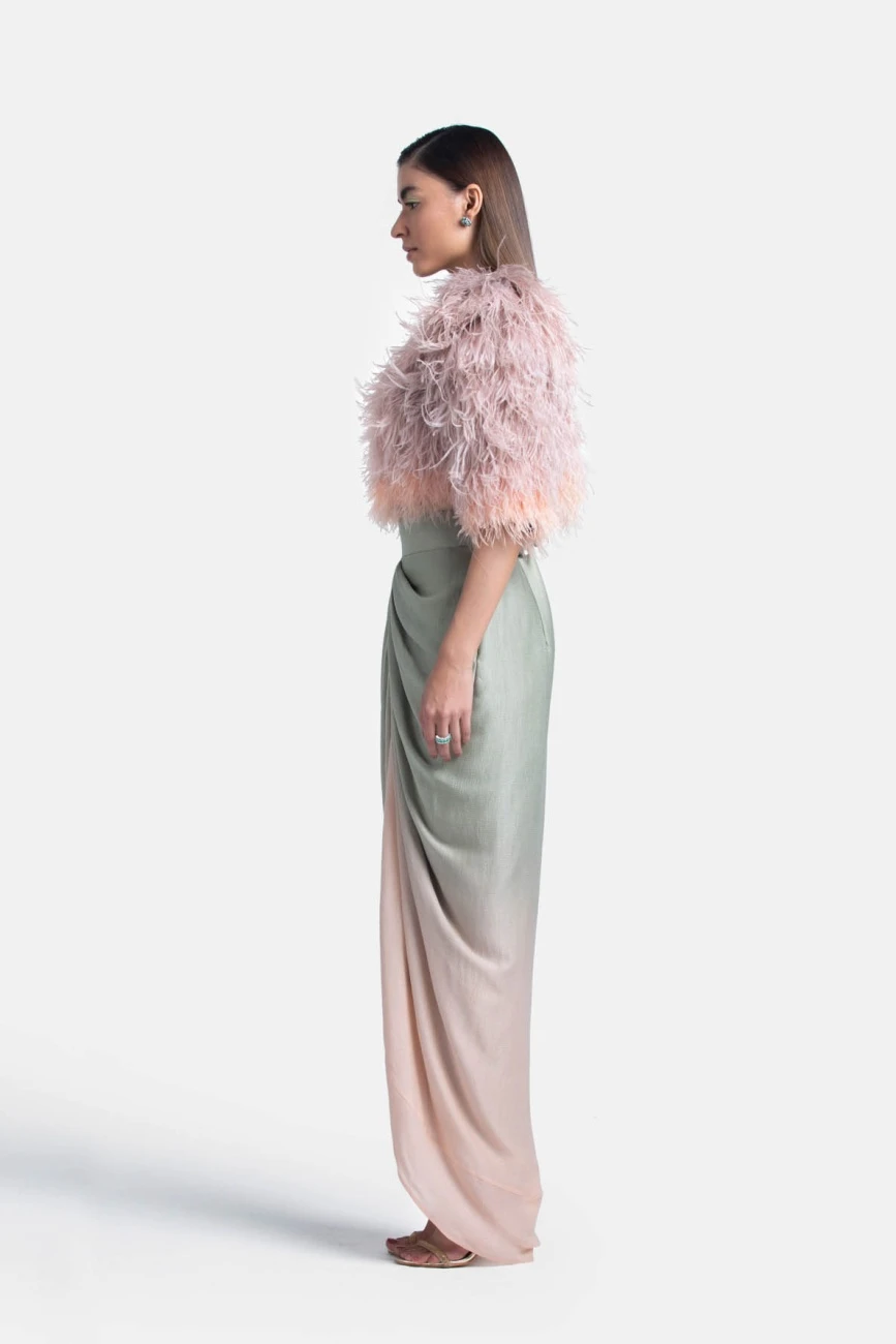 - Straight fit ombre finish skirt with a front drape detail and a slightly longer back