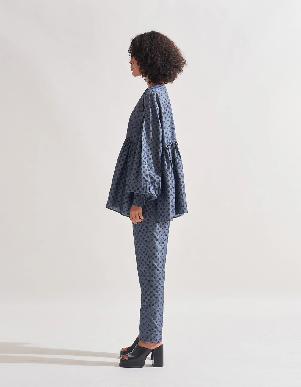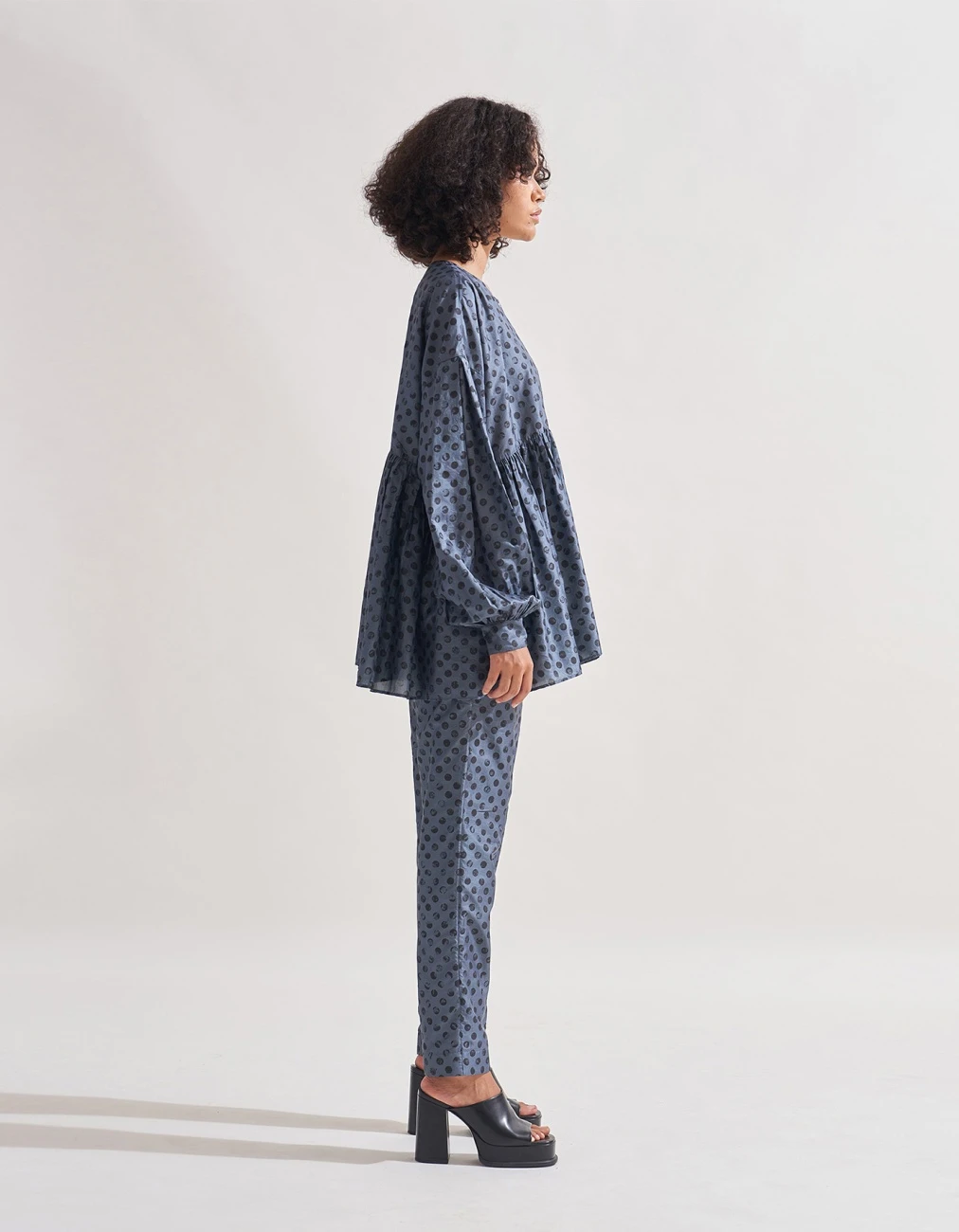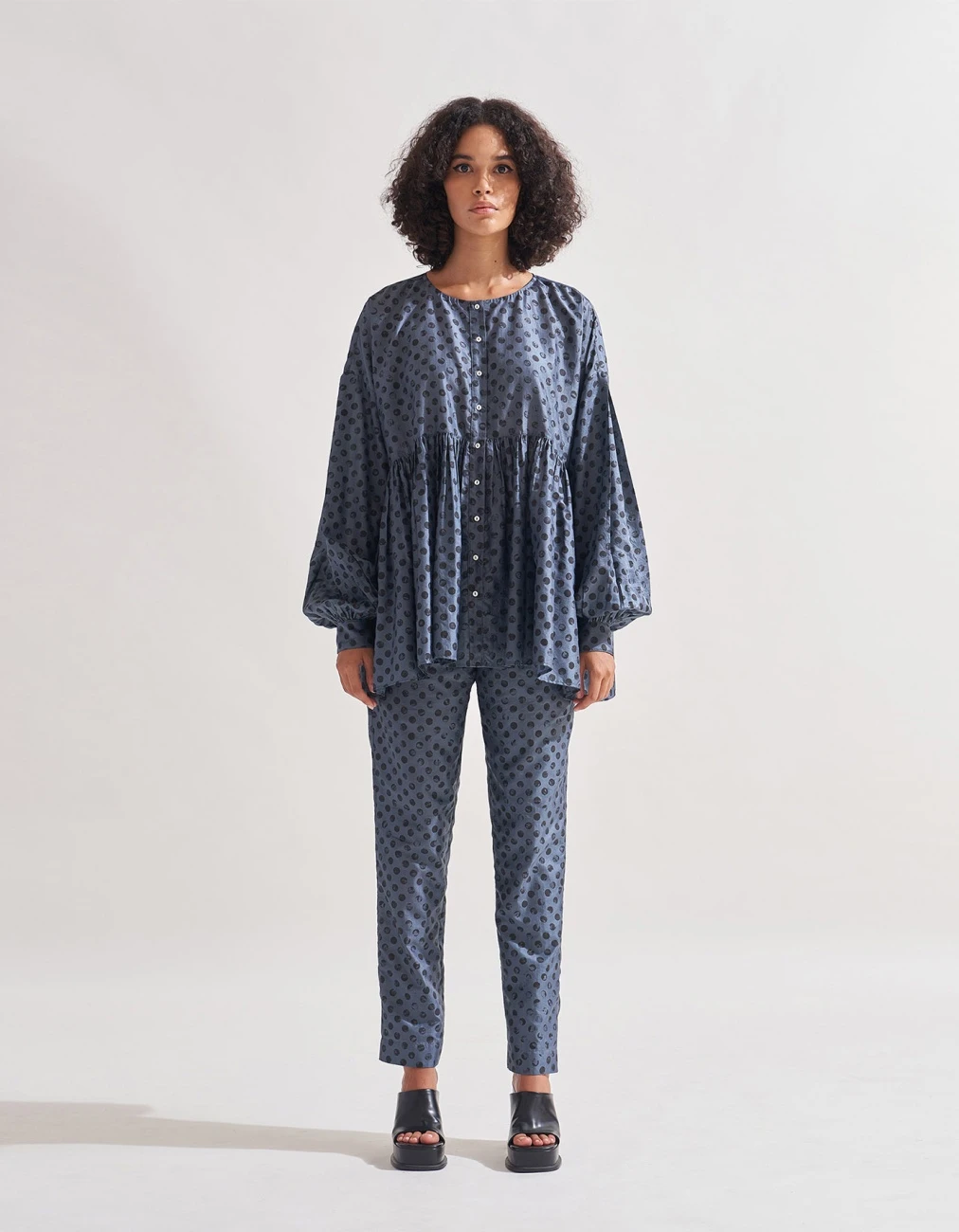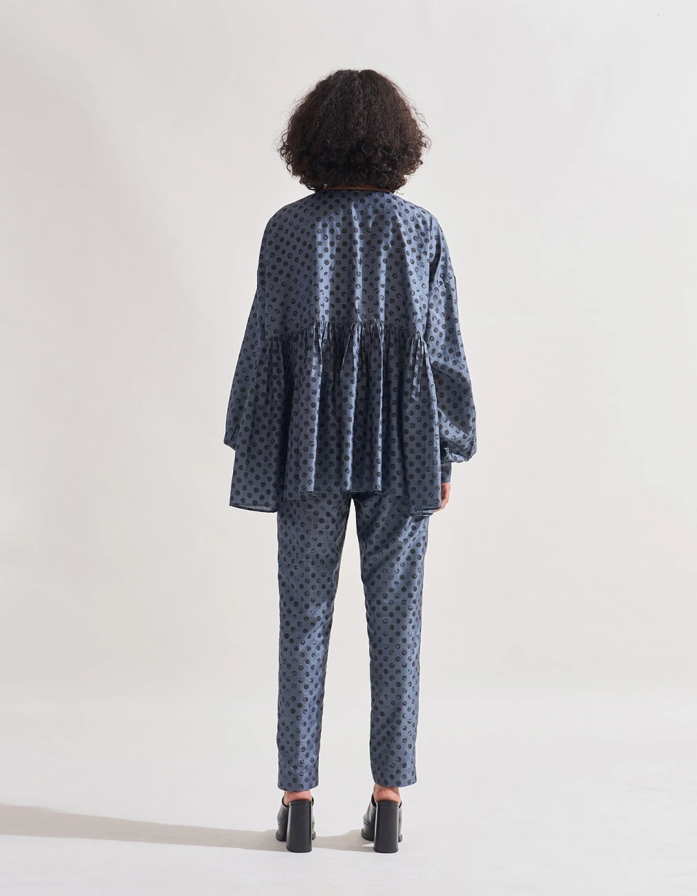 - Silk button-down tiered shirt with hand-block polka dot print patterning