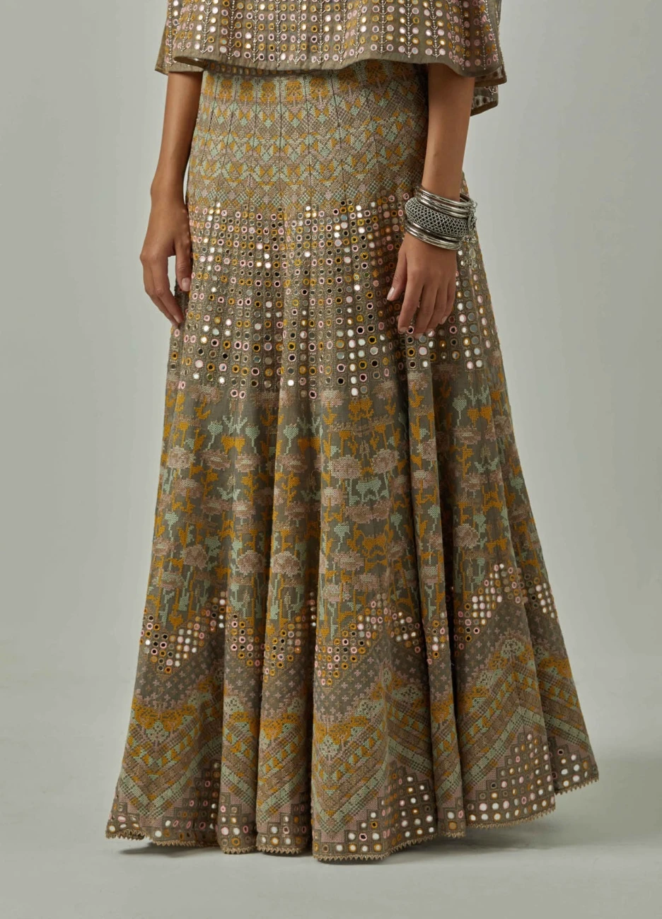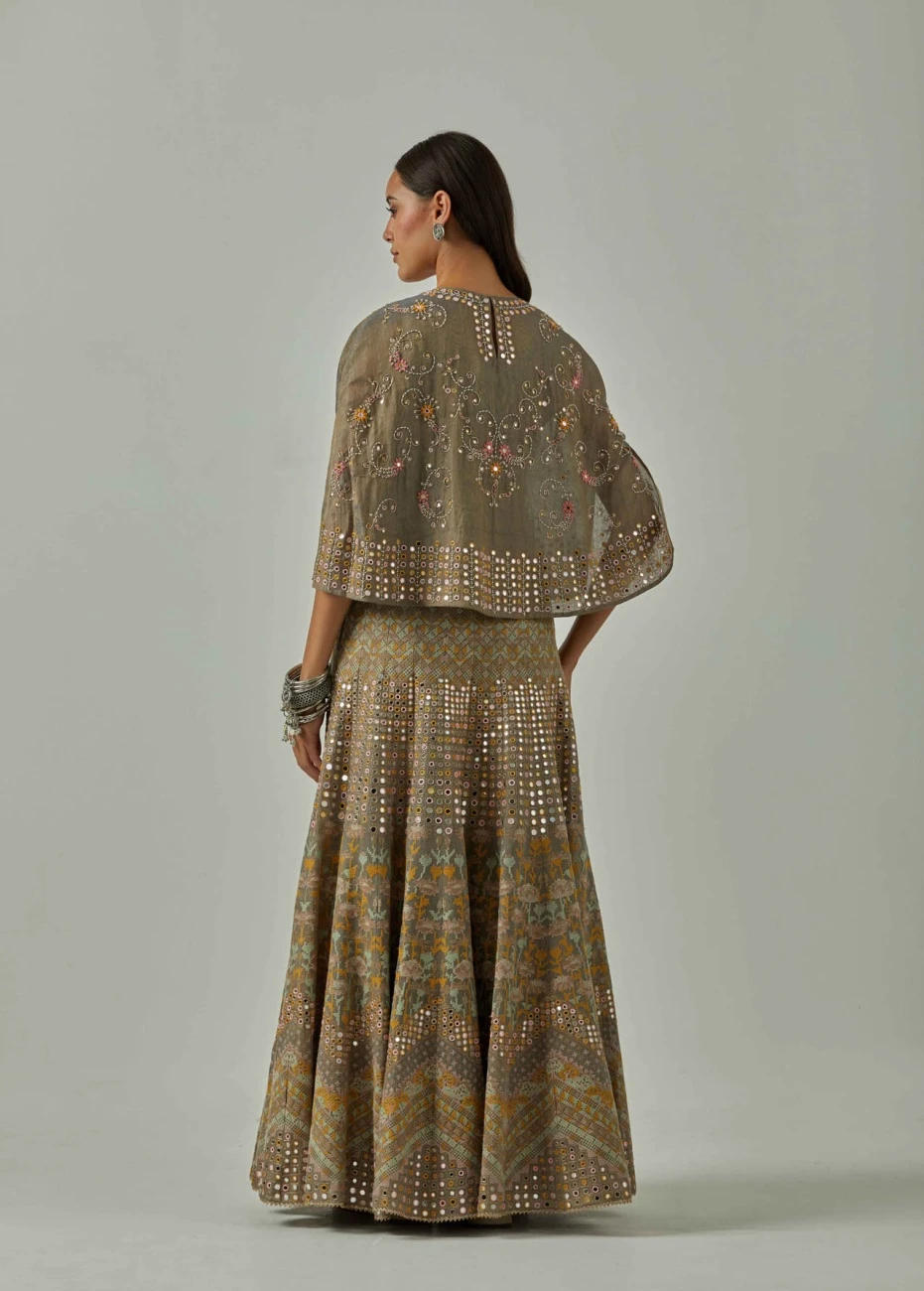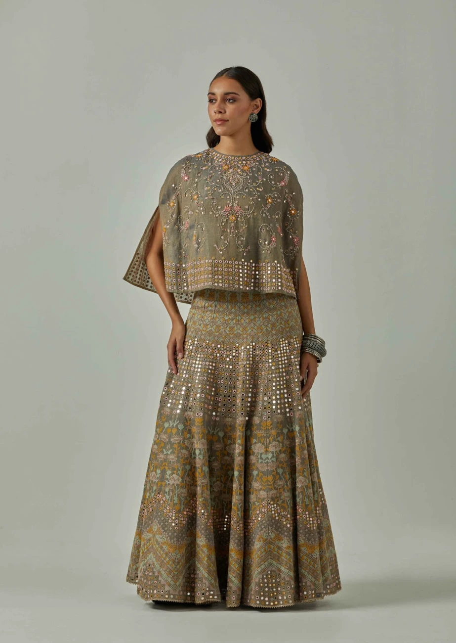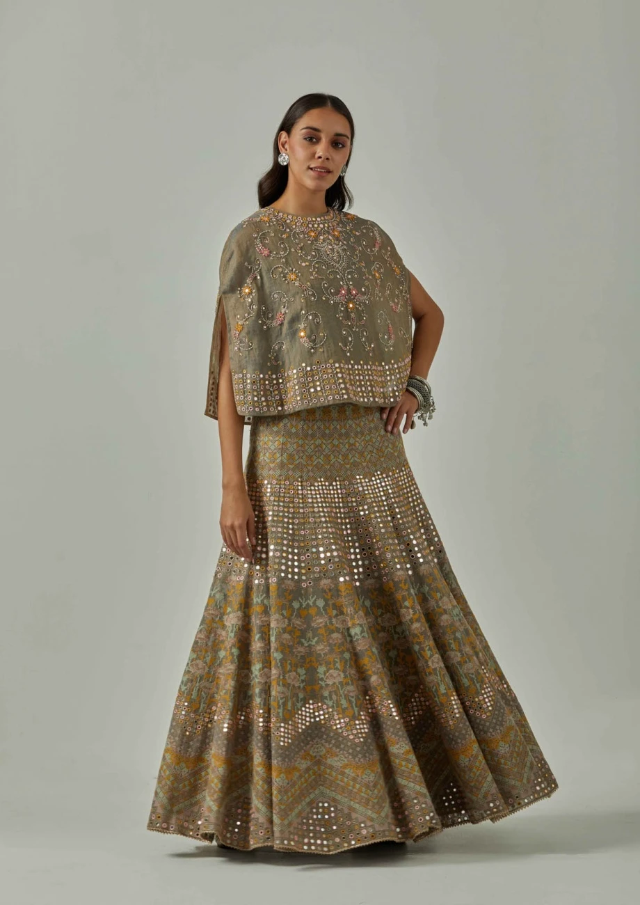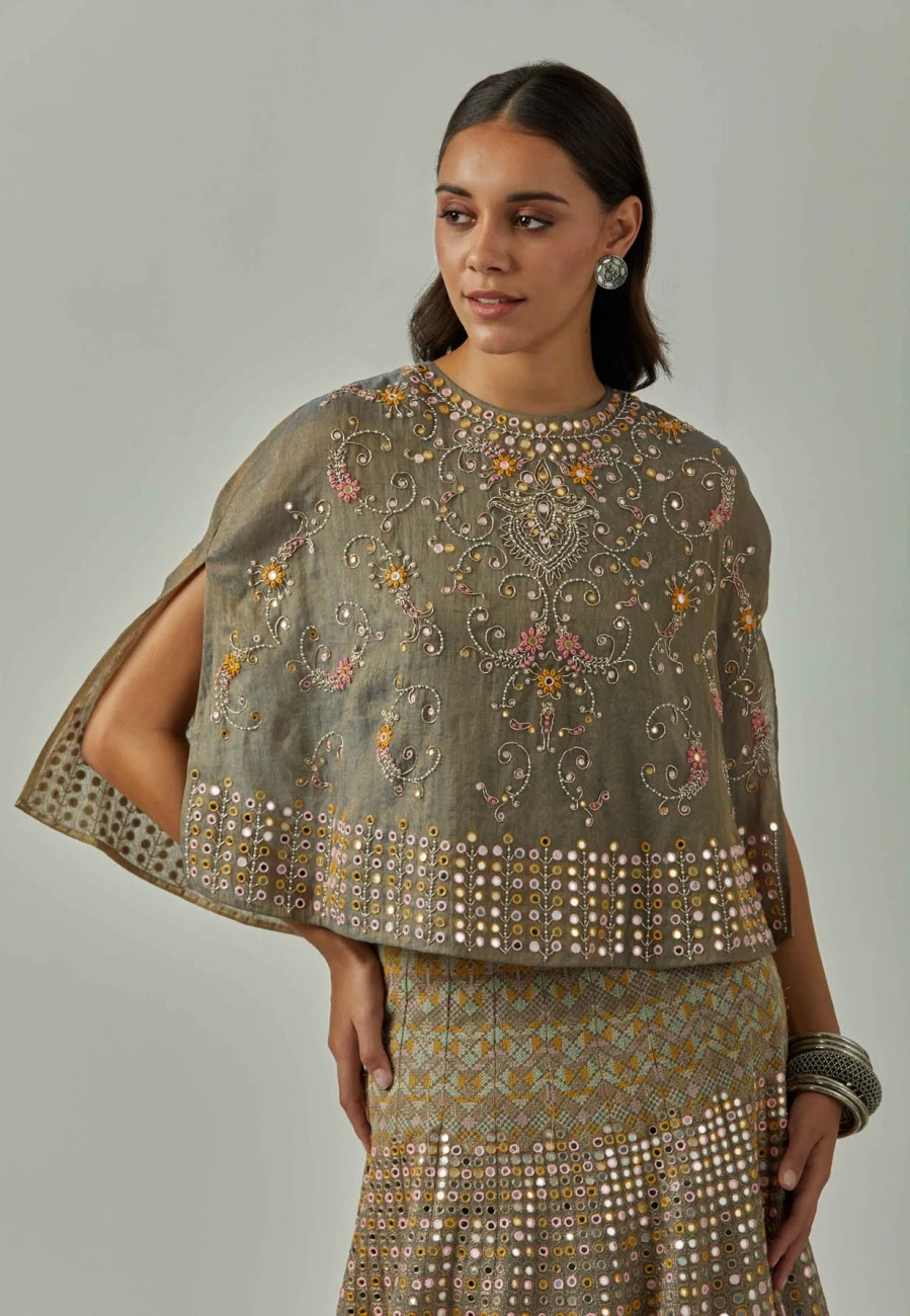 - Tissue chanderi hand embellished cape paired with mirror and cross stitch embroidered skirt