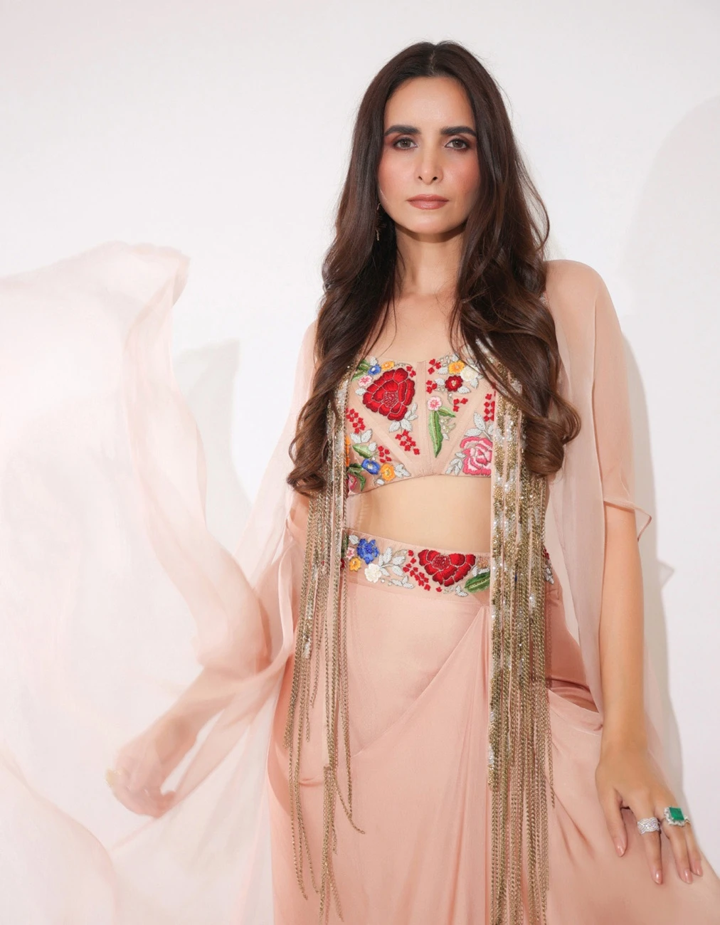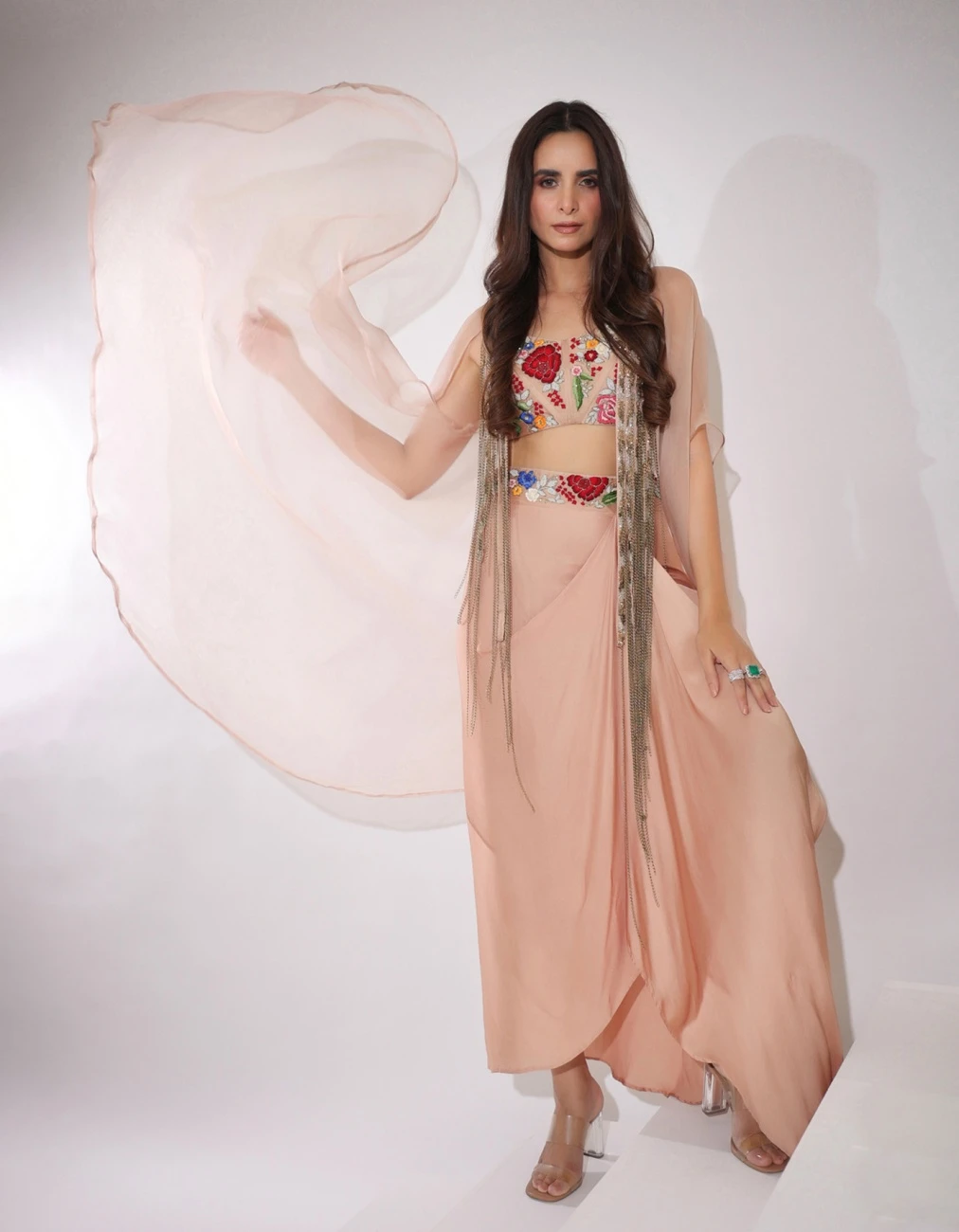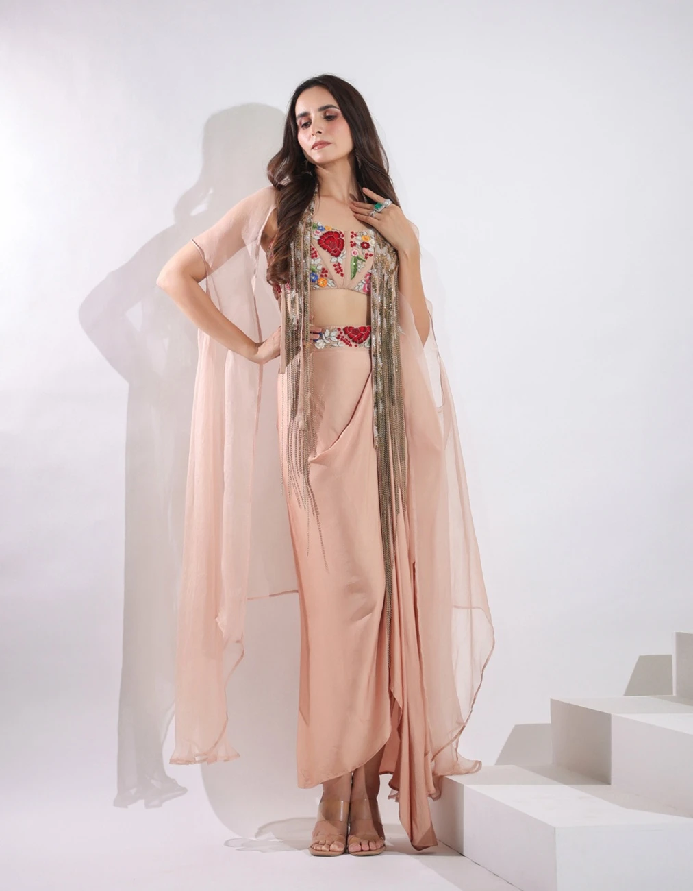 - Featuring our caramel brown 3 piece set with colorful embossed resham & sequin work corset paired with a drapeskirt and a beaded chain cape