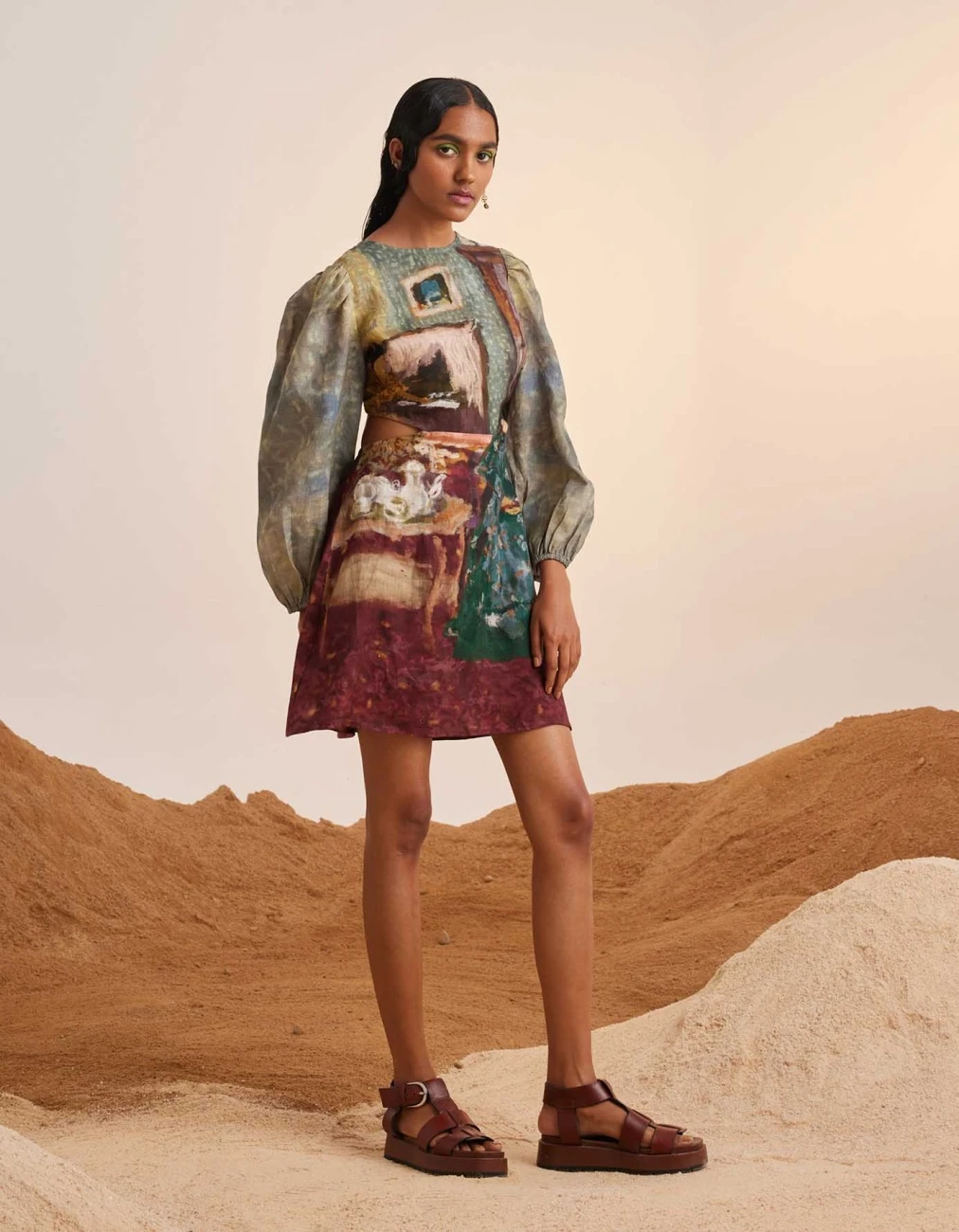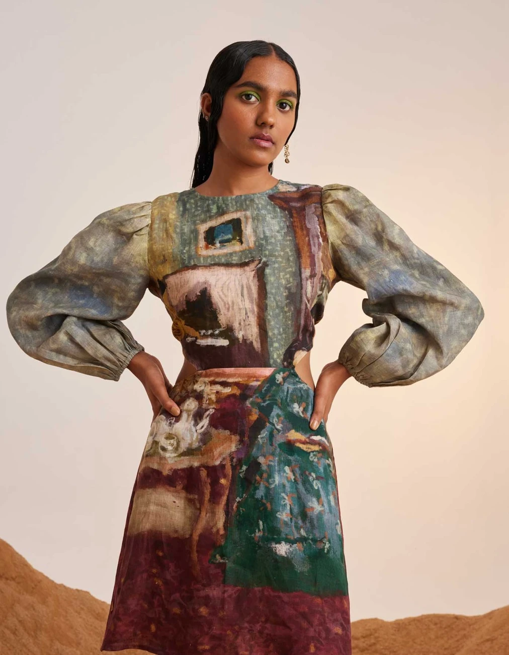 - mid-thigh length summer dress accentuates the body silhouette with cuts along the waist