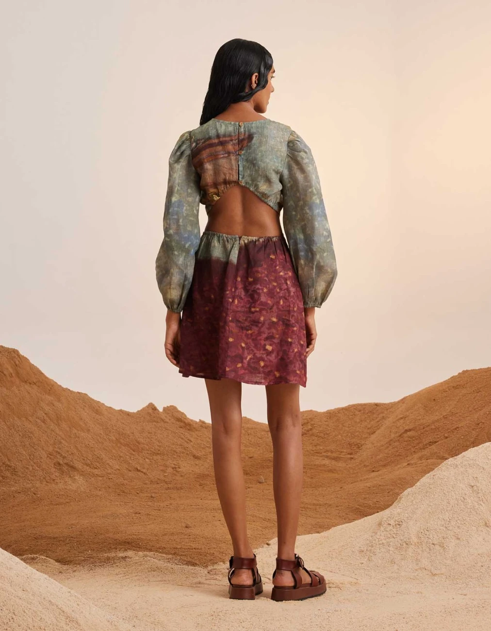 - the dress has a backless pattern with a flared skirt