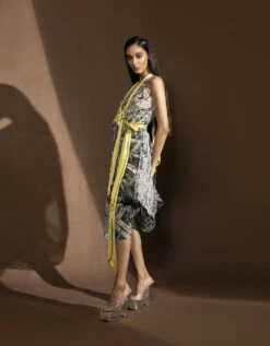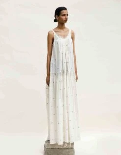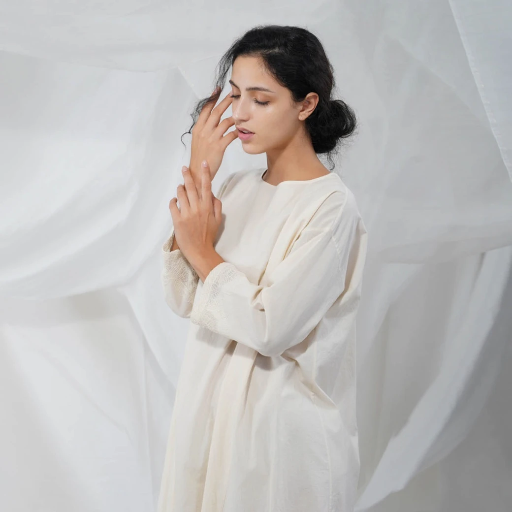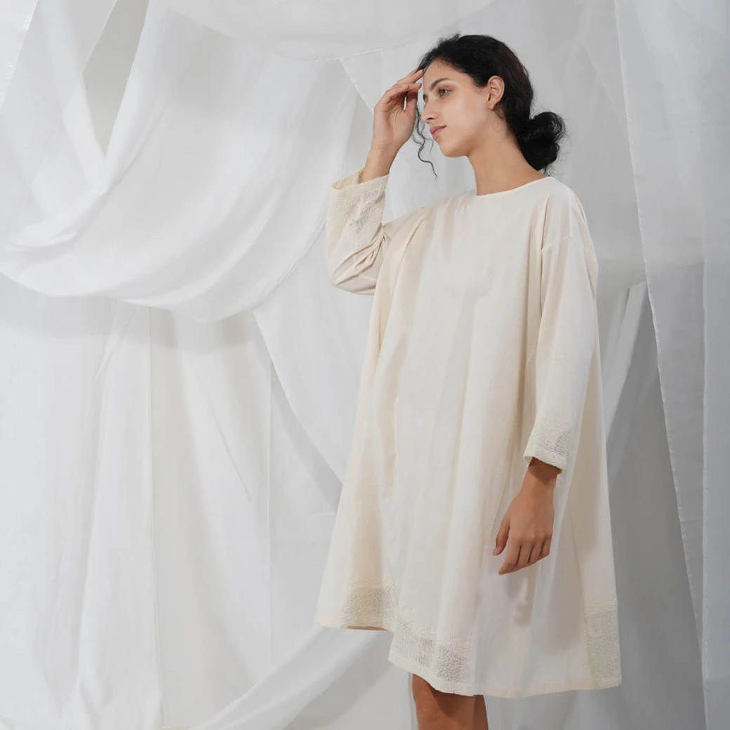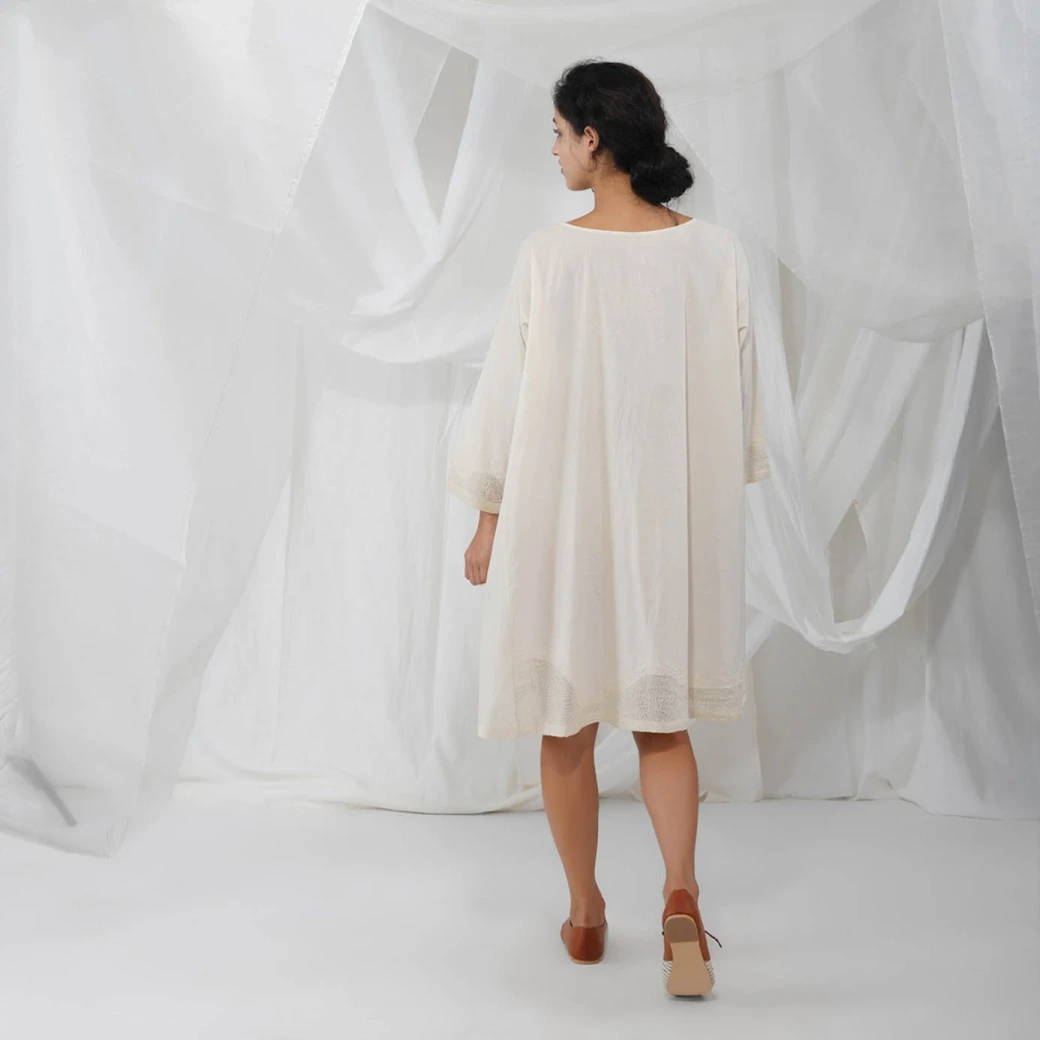 - Short round-neck Ivory dress with hand-embroidered organza patches