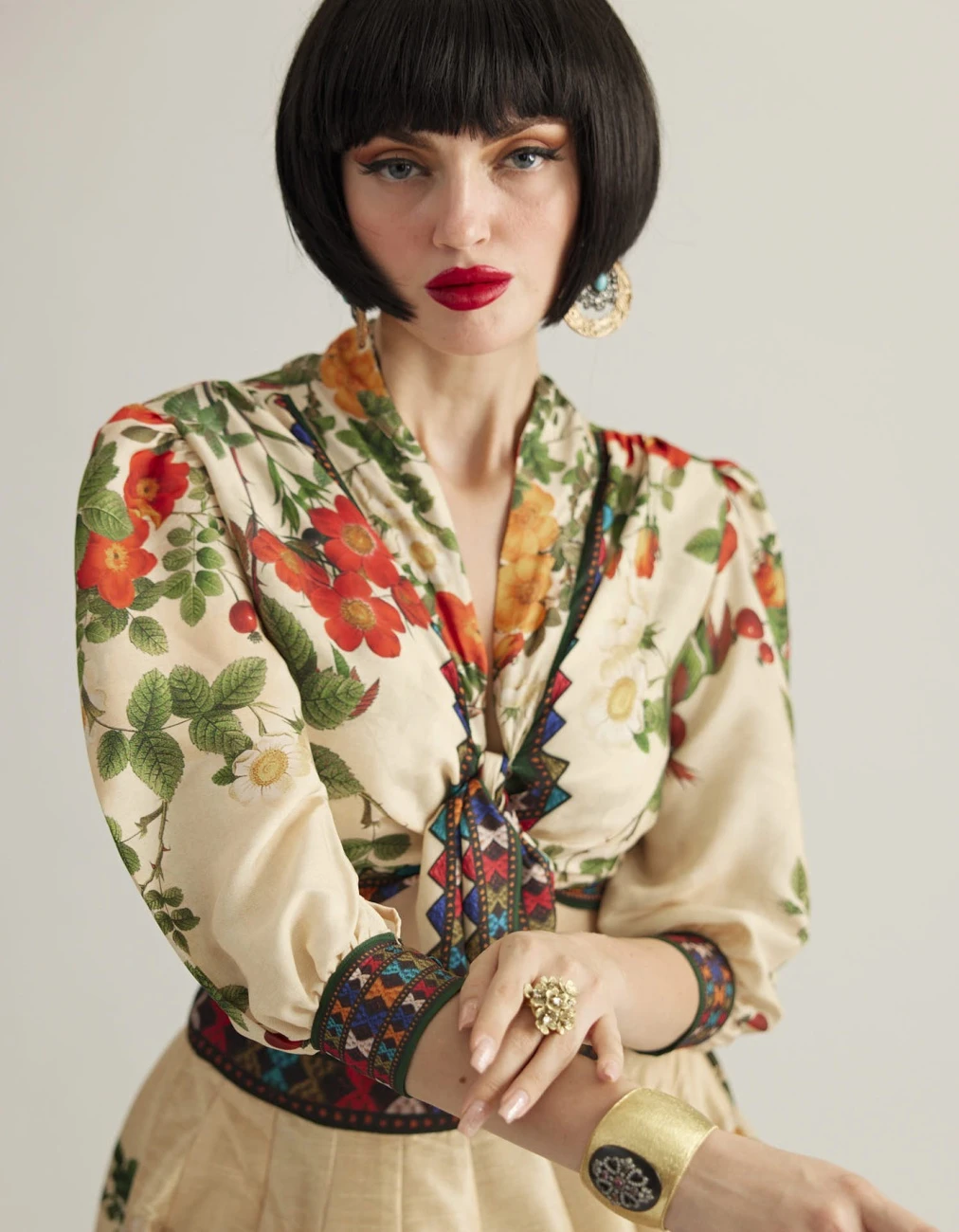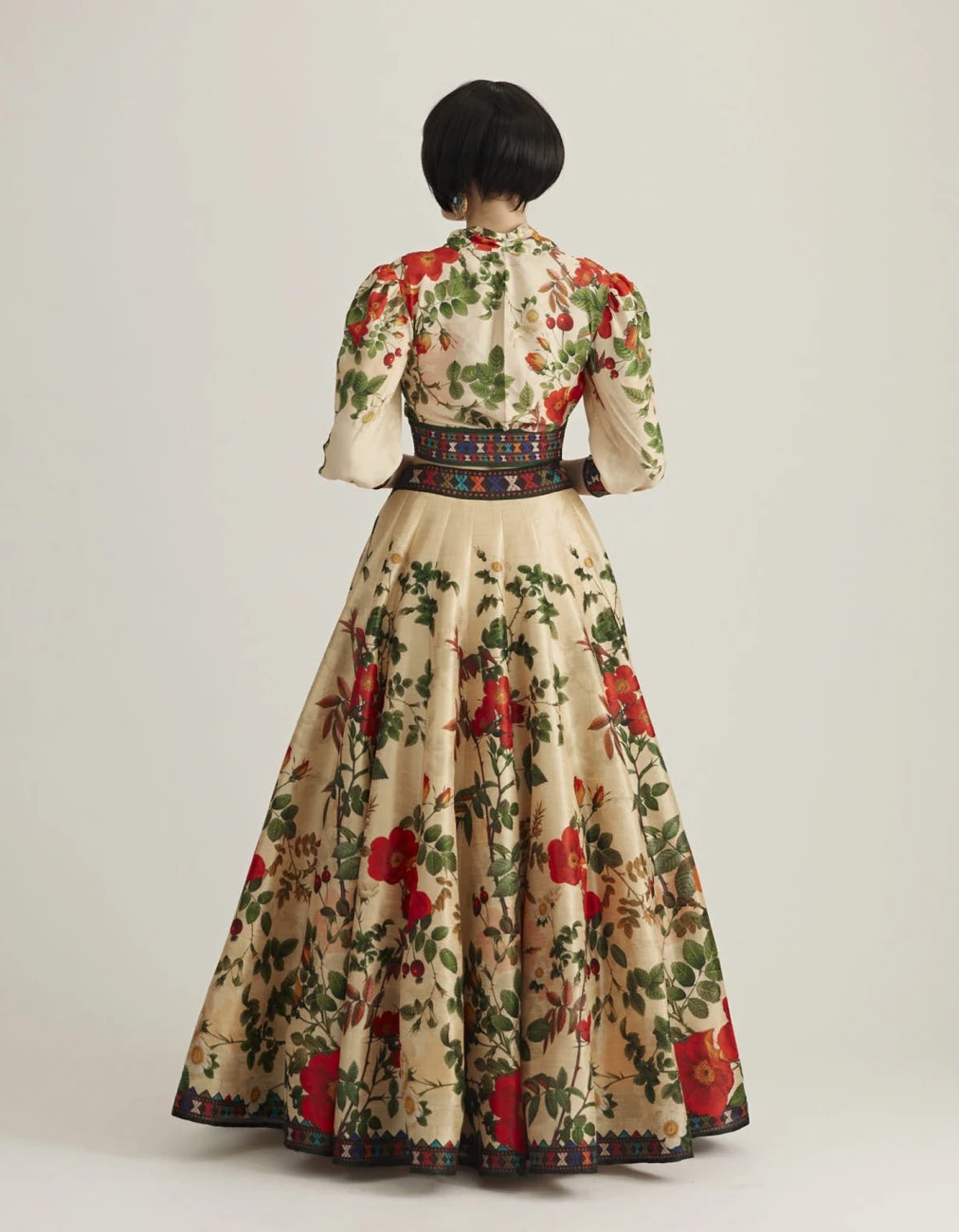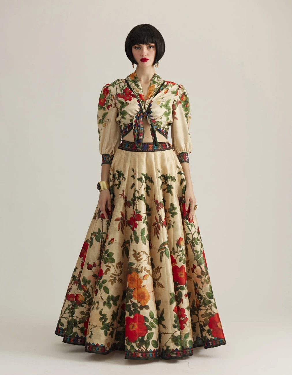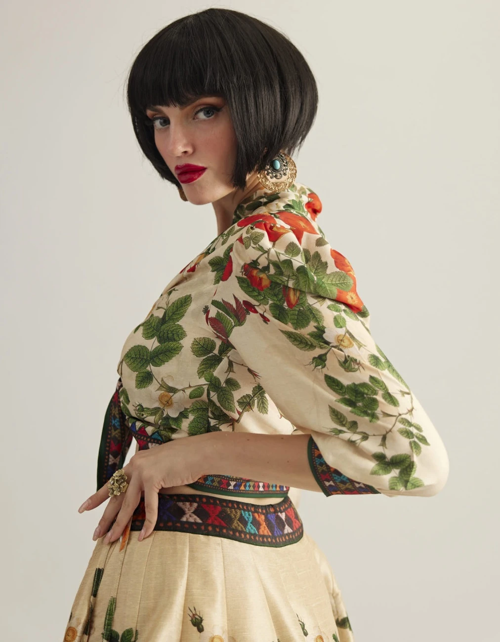 - Printed duppion skirt with drawstring and lining with can-can, & Crop top with front tie up And sleeve with cuff