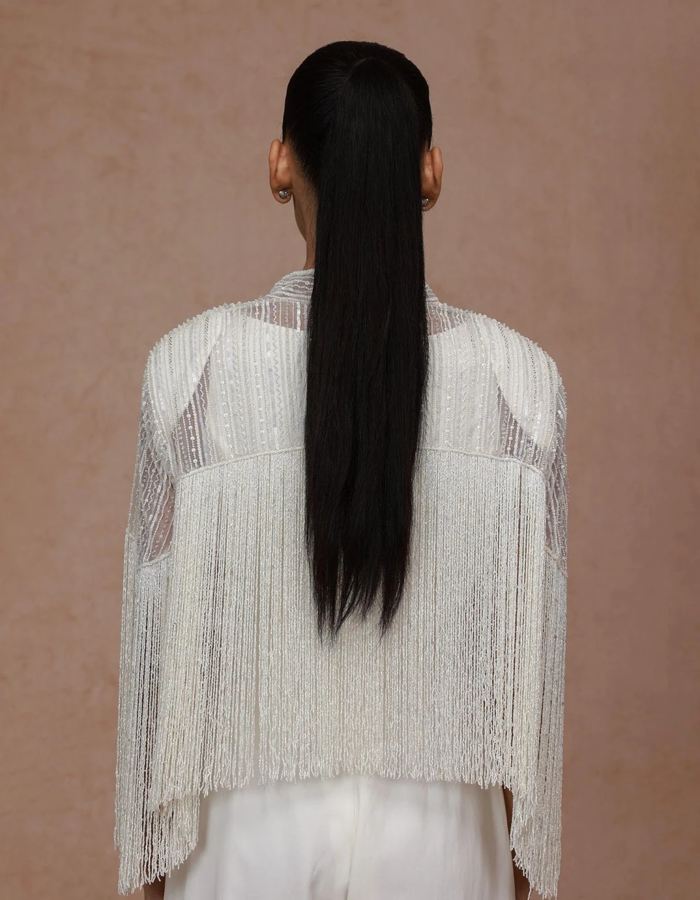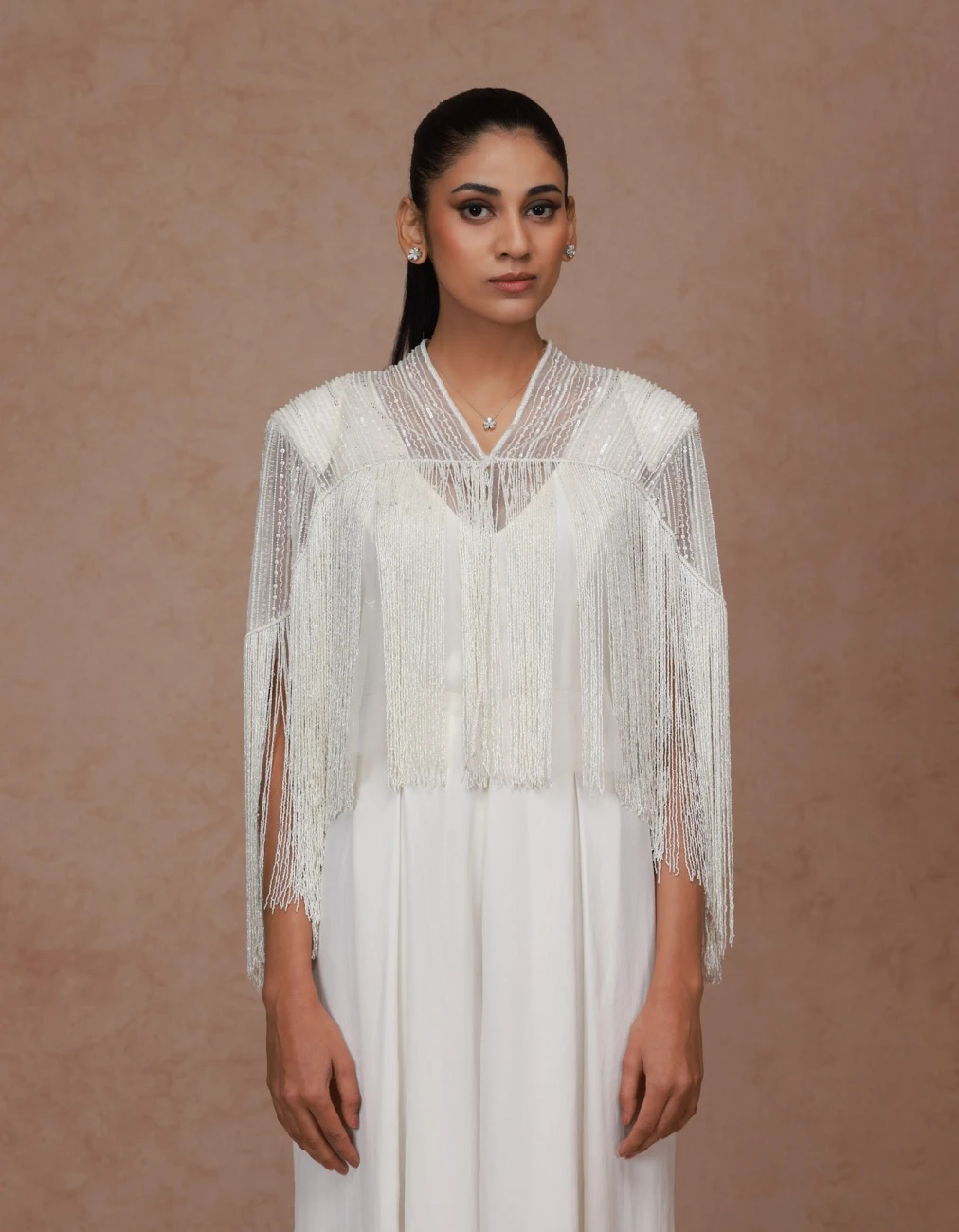 - Fringe cape with beaded embroidery detailed yoke with Georgette jumpsuit with pleat detail