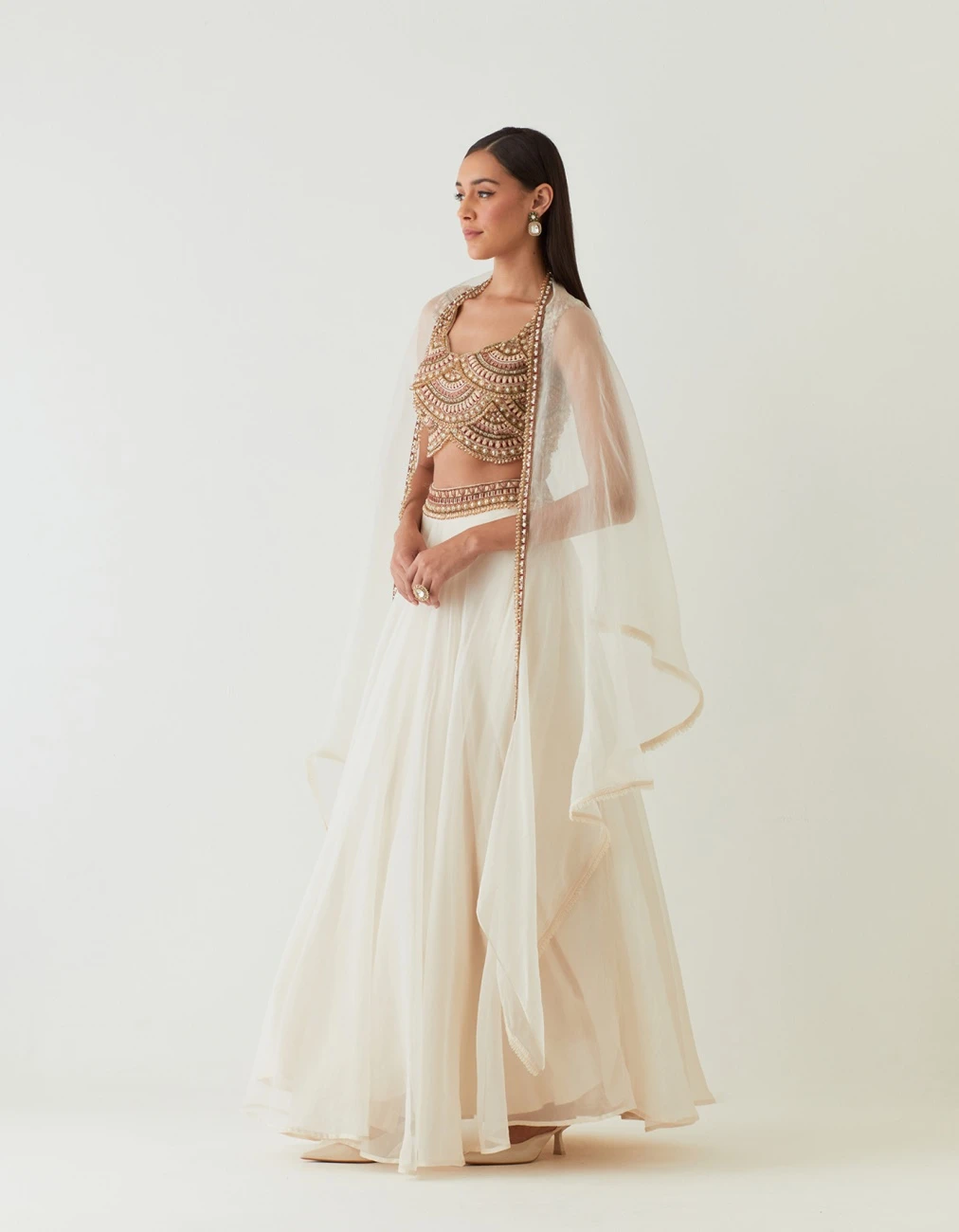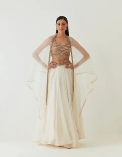 - Scallop Embellished Blouse Paired With Organza Skirt With Embellished Detailing On Belt And Solid Plum Cape