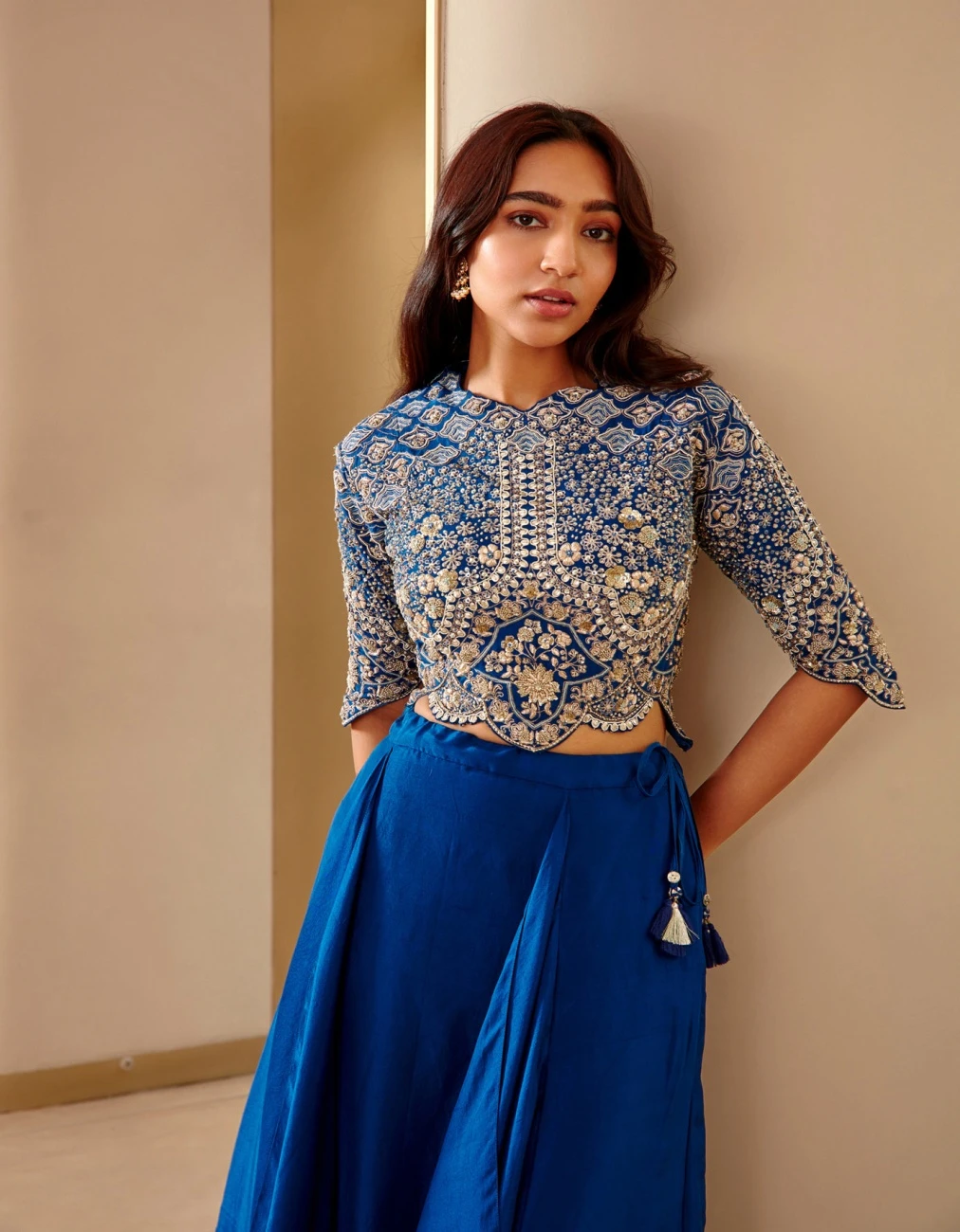 - Zardose embroidered crop top with french knot details, paired with a skirt