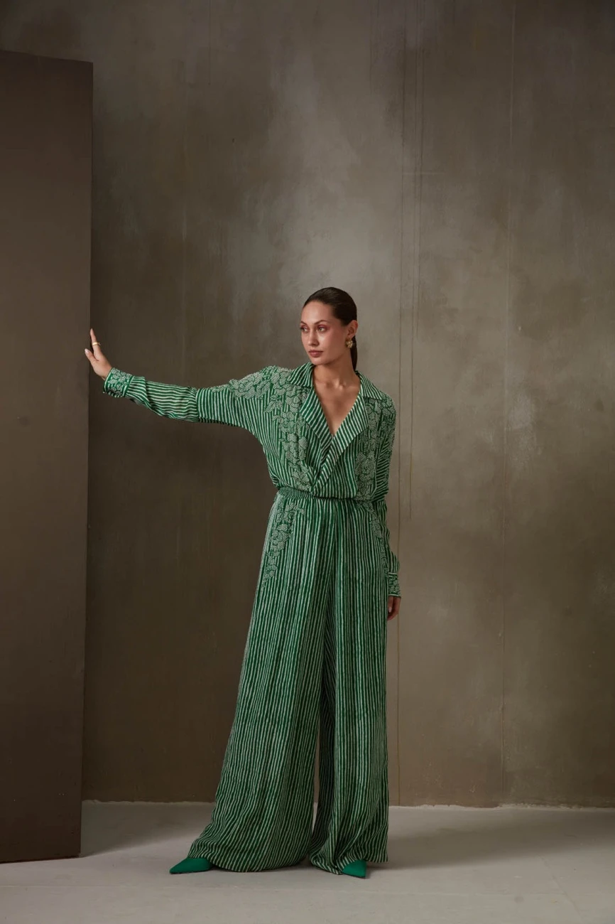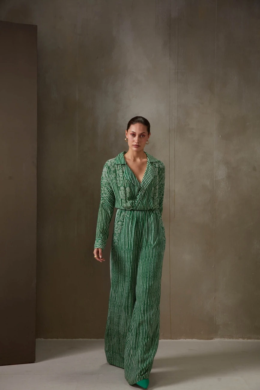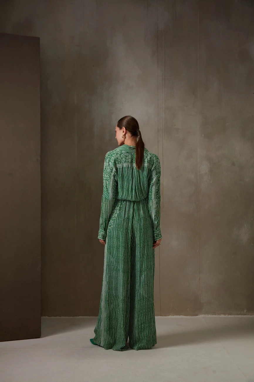- Kelly green bandhej stripes wide collar jumpsuit