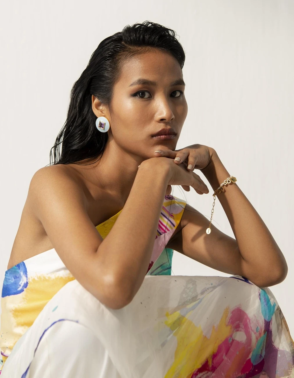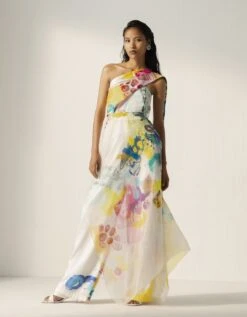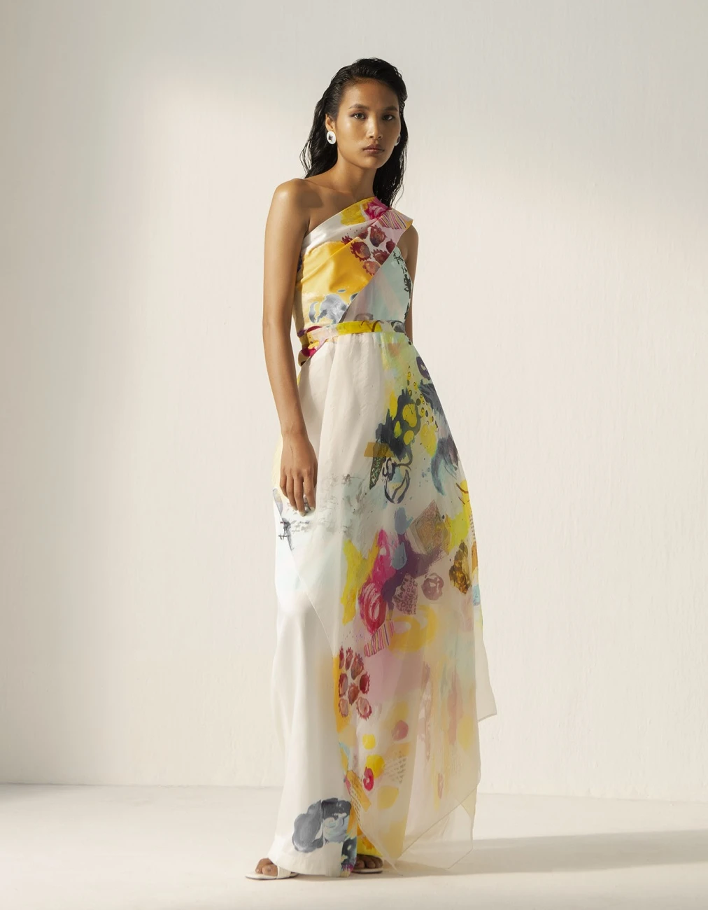 - Colourful Printed Jumpsuit With Sheer Panel And Drape