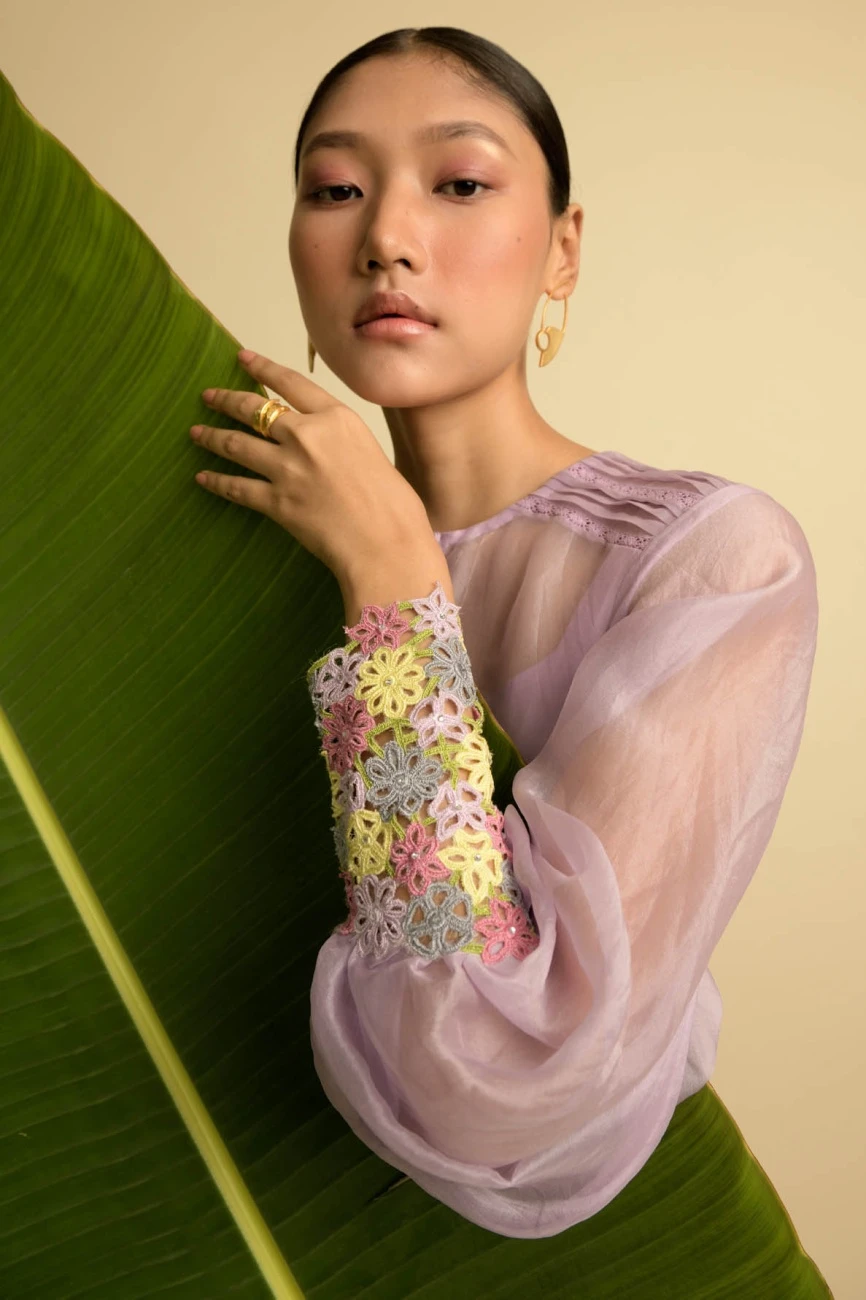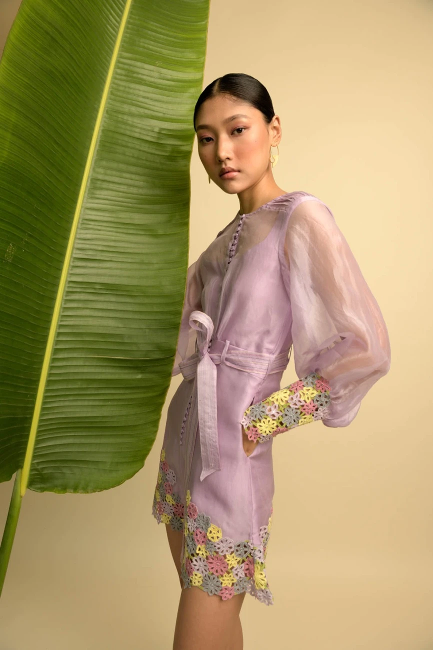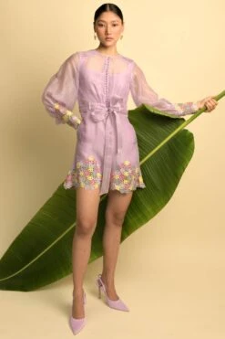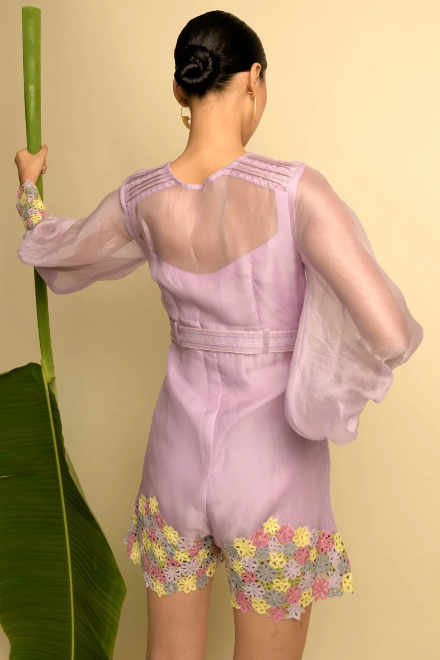 - Mauve organza playsuit with multicoloured michaelmas daisy inspired embroidery