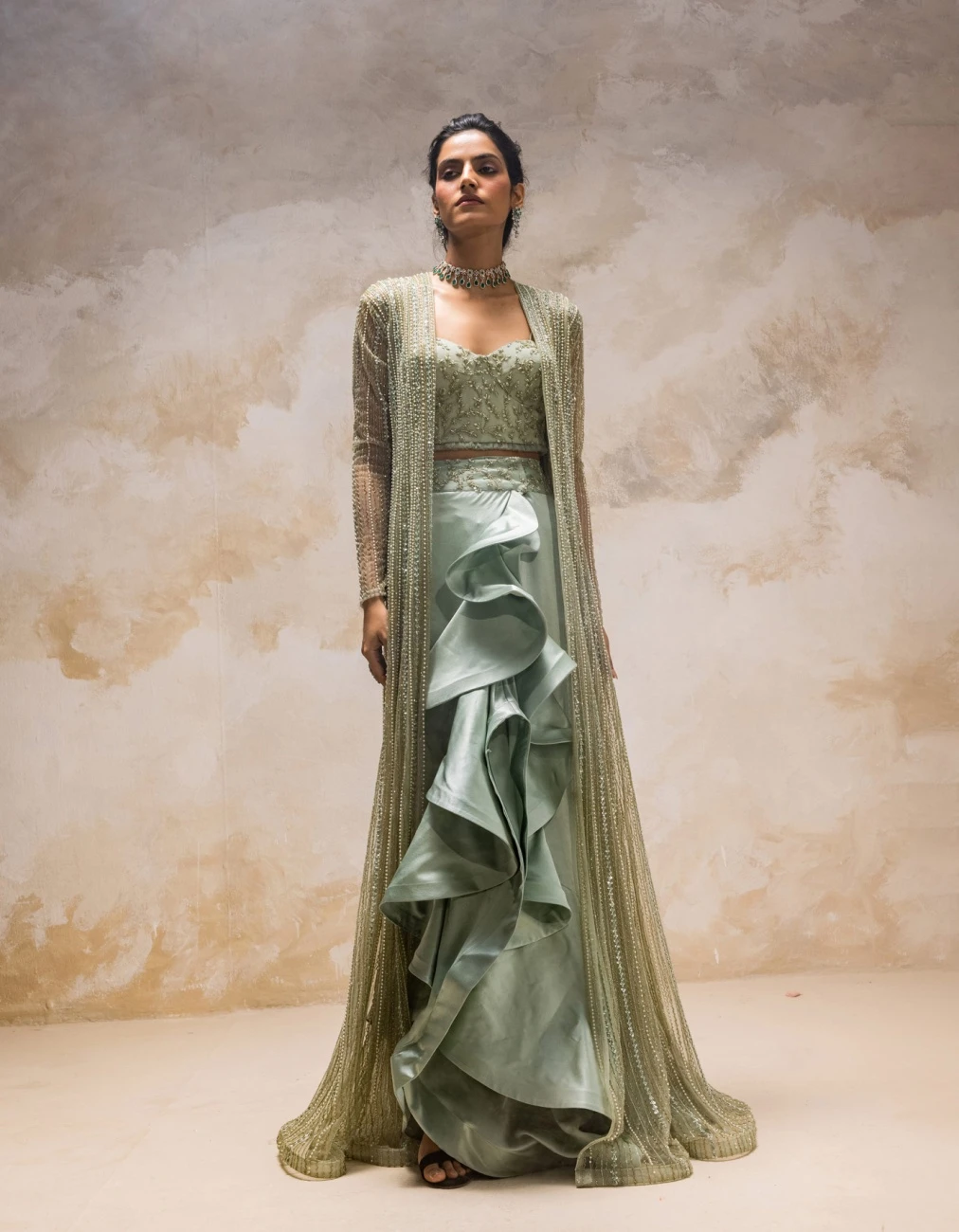 - Heavily embroidered floor lenght jacket paired with gold and green combination jaal corset and satin flouncy ruffled skirt.