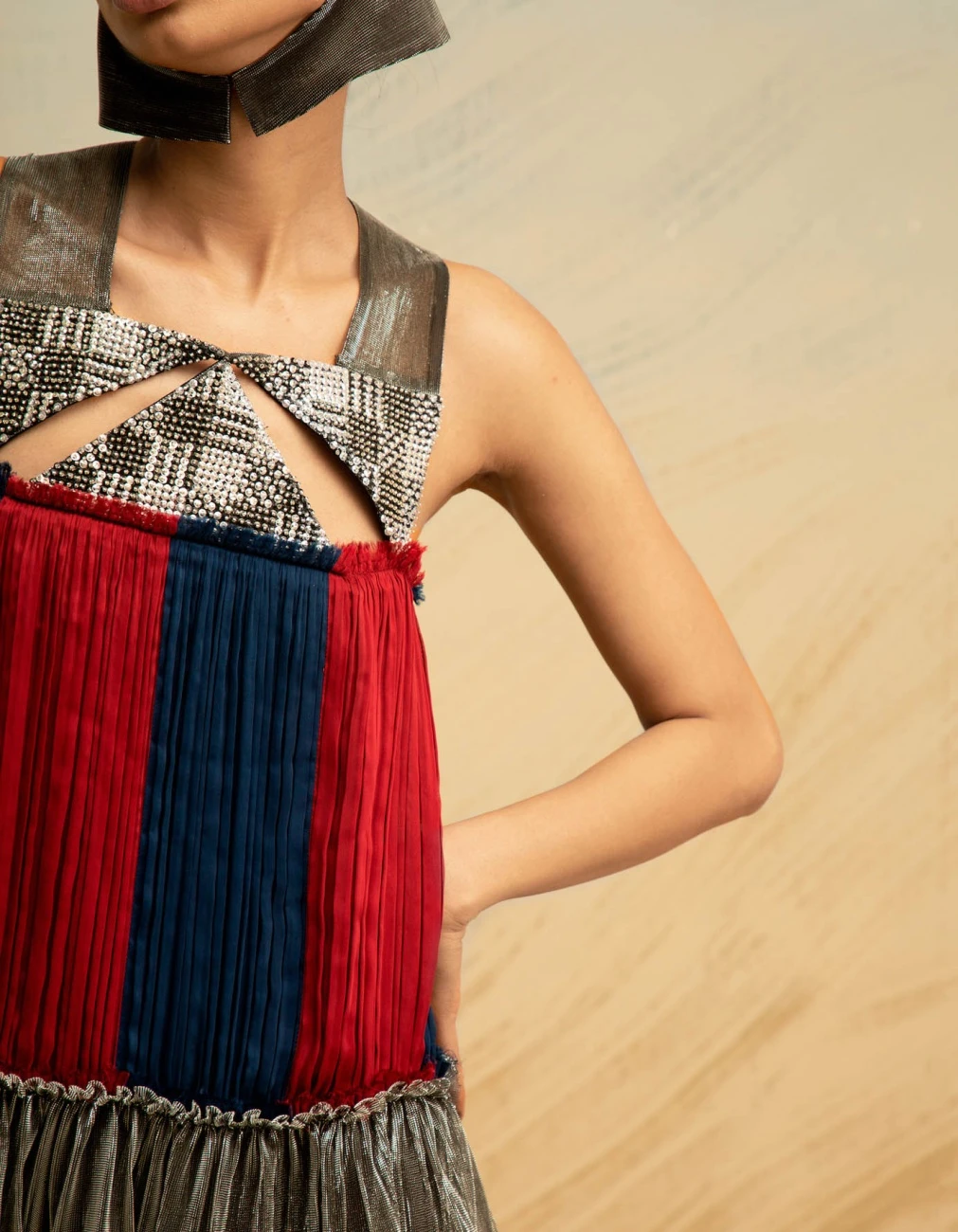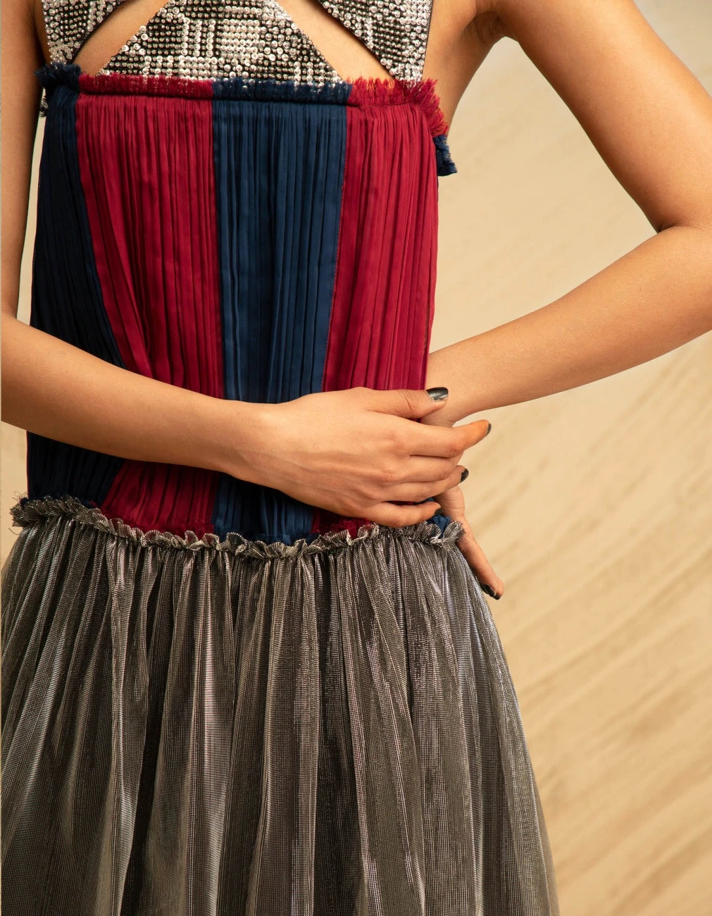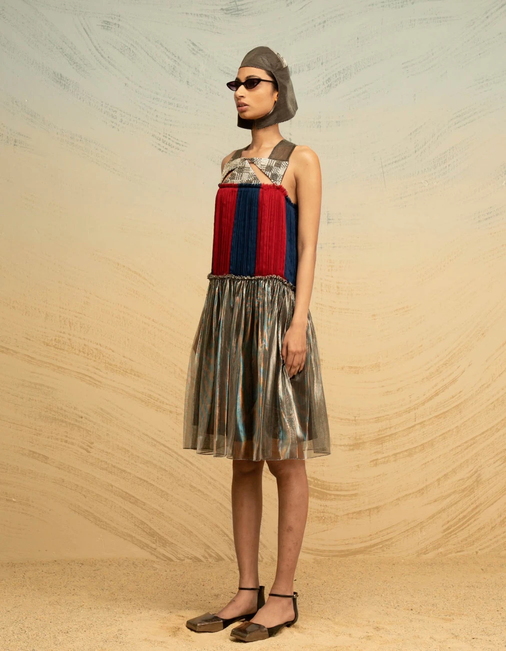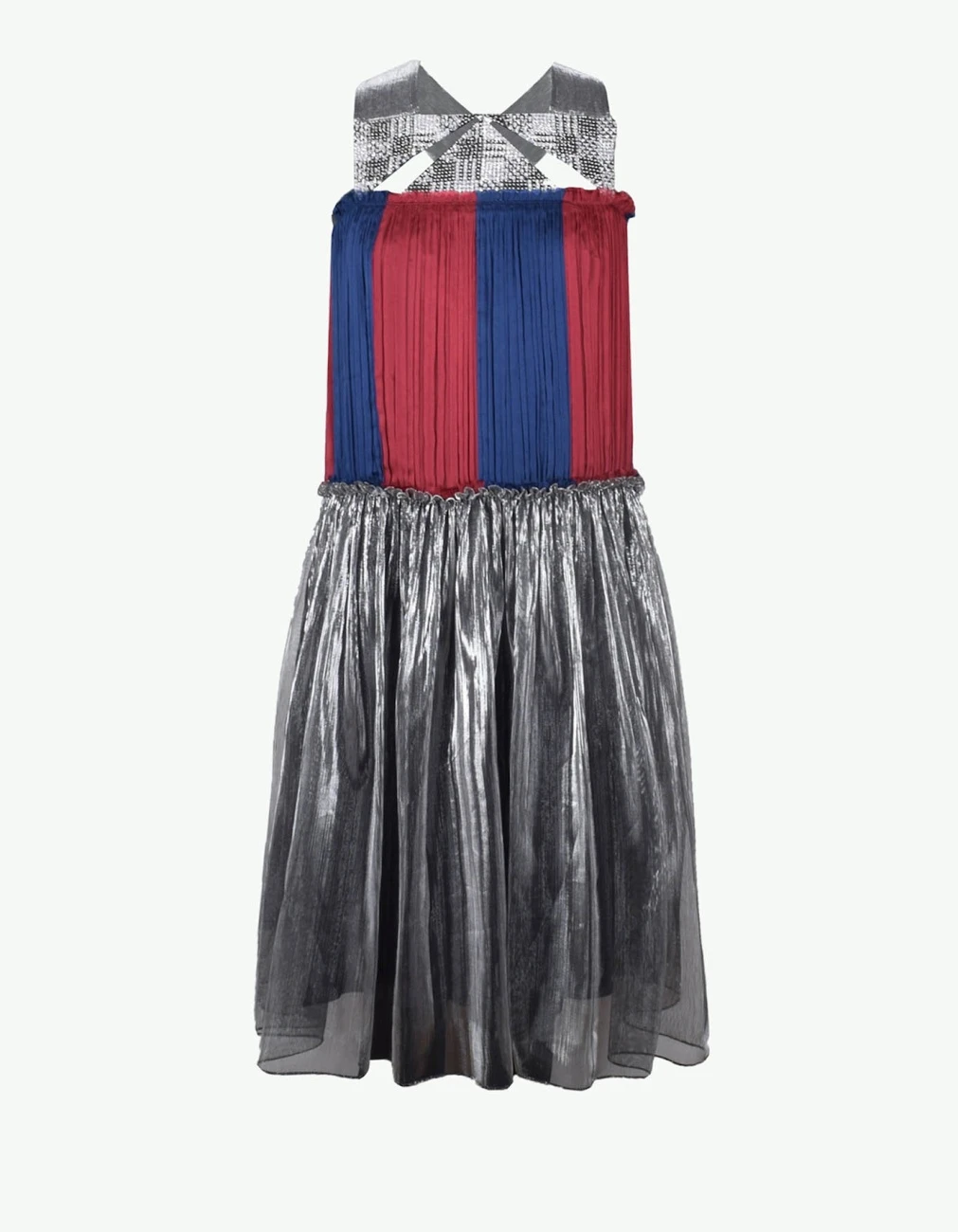 - Knee length dress crafted in gathered chiffon bands and lurex tulle