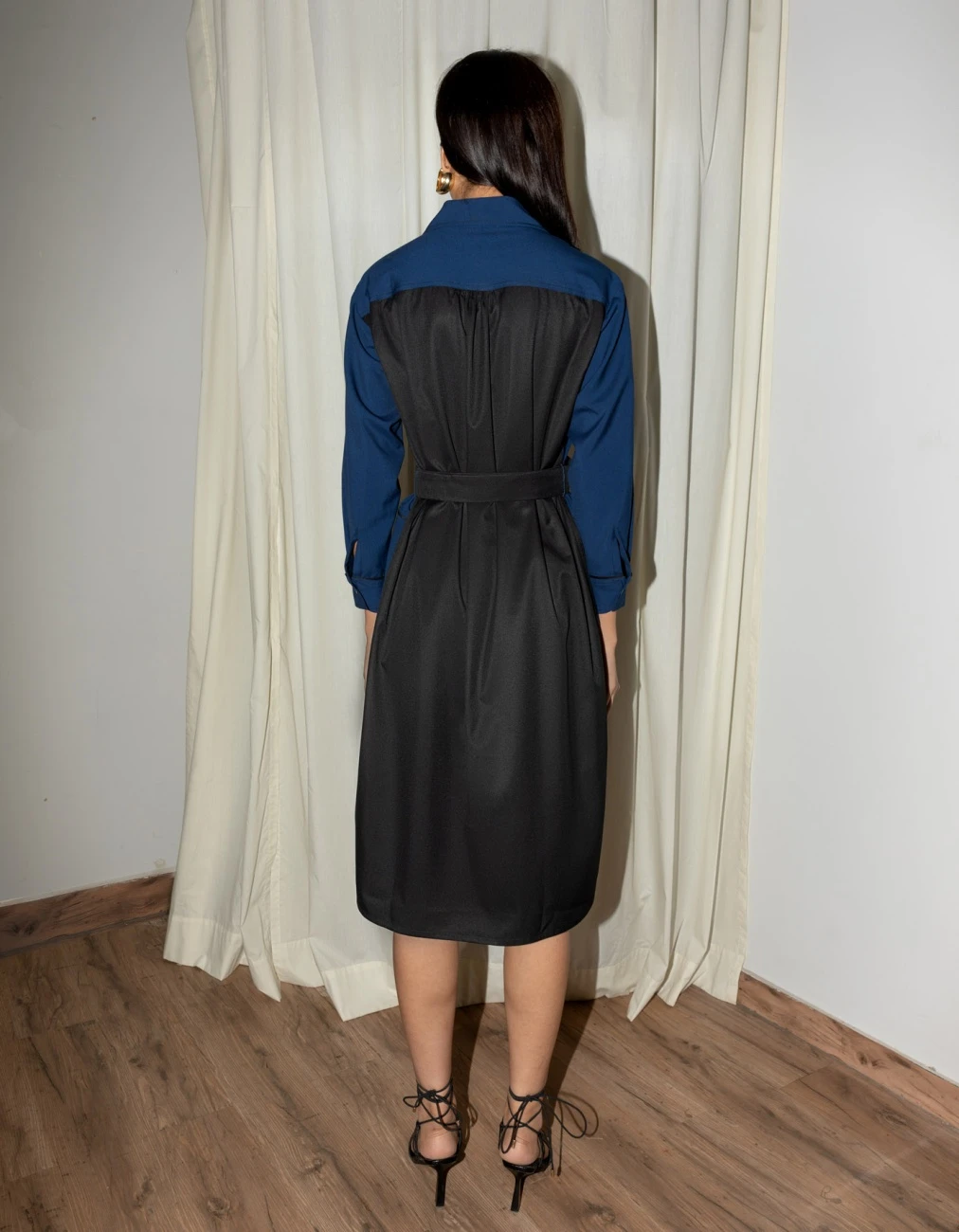 - This dress is cut in 100% Rayon Suiting highlighted with piping details creating checkered pattern and colourblocked towards the hem and the back