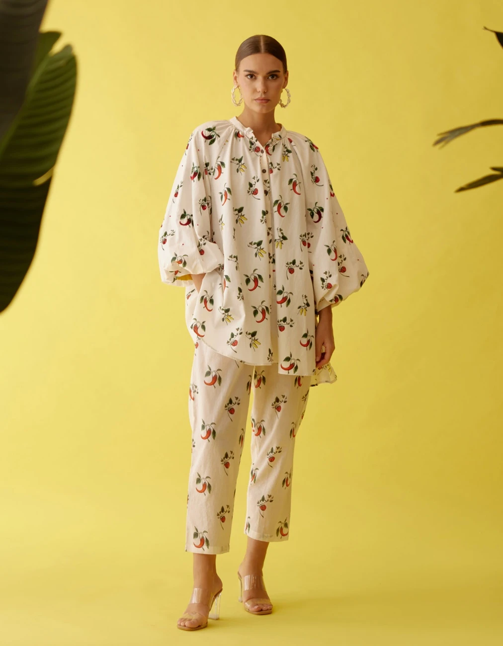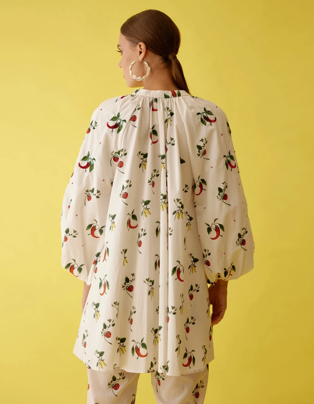 - Off-white hand painted chilli print raglan sleeve shirt with hand embroidered chillies highlighted with sequin, thread and hand-stitched details in 100% cotton