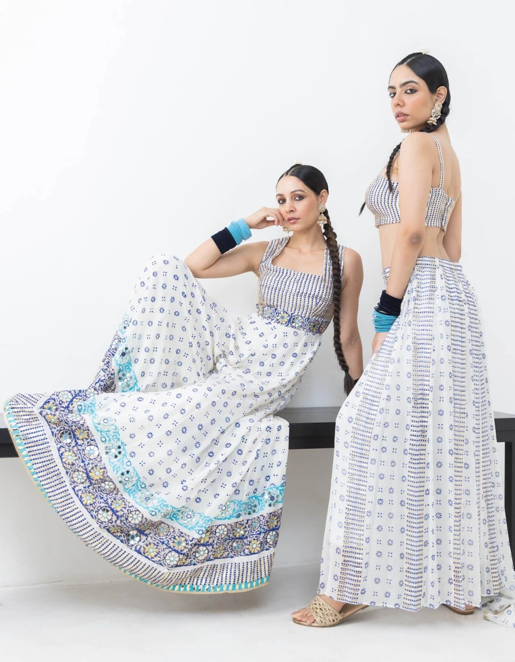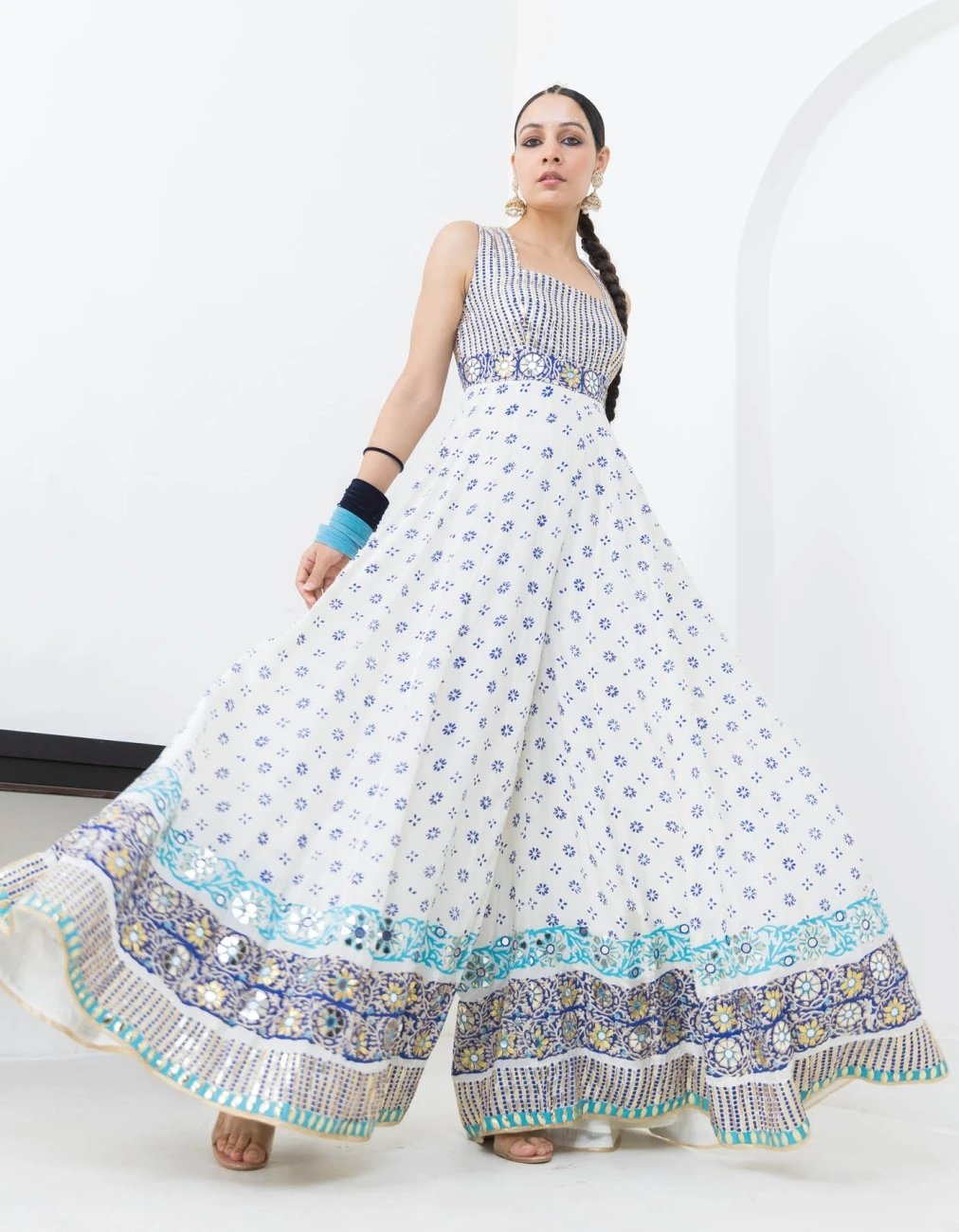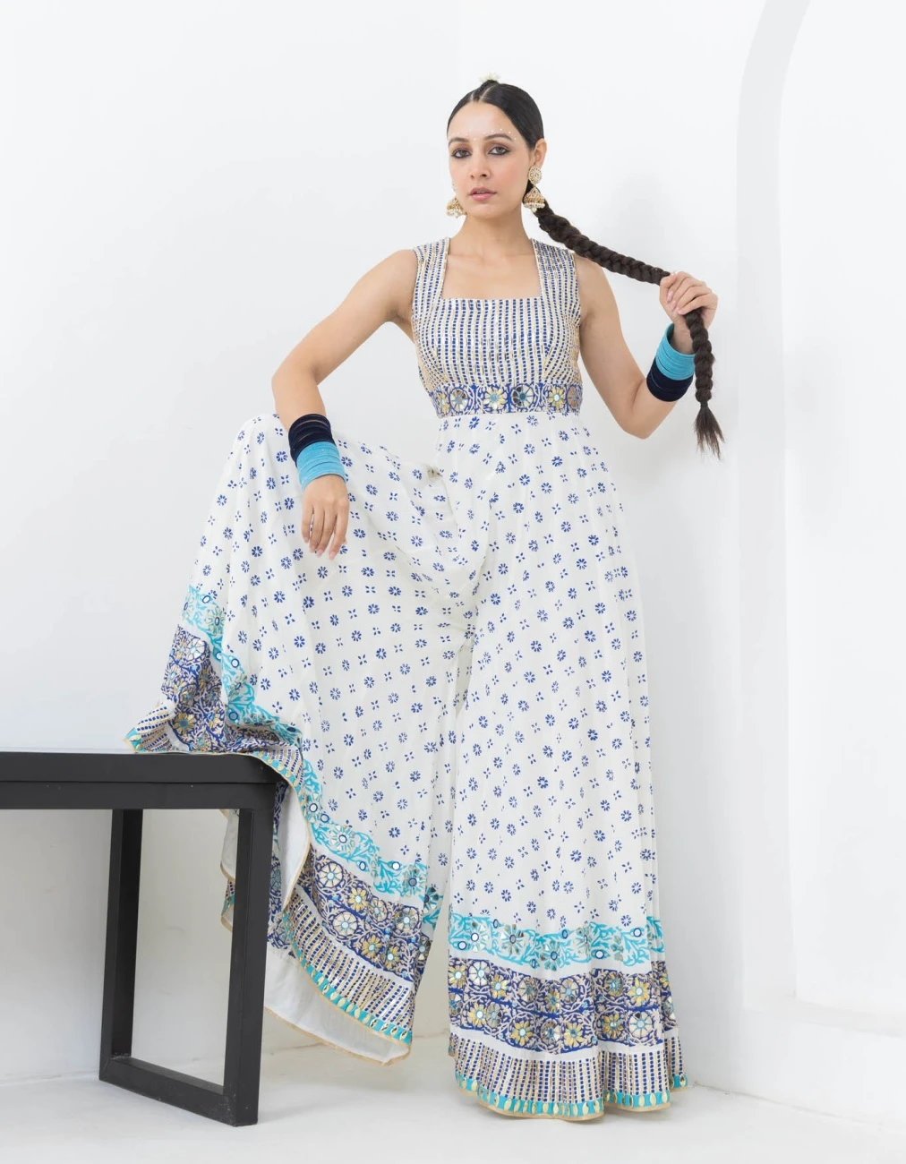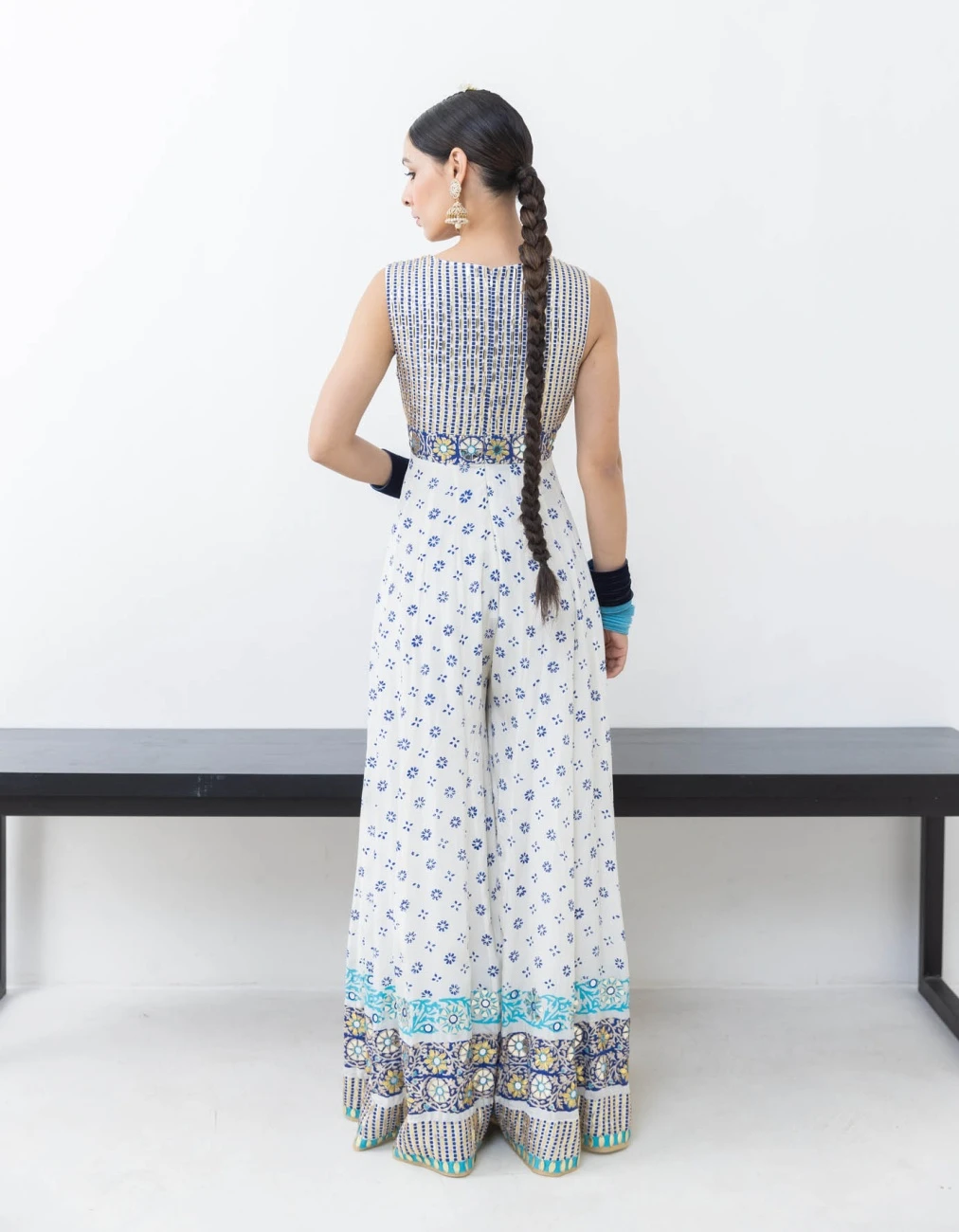 - The jumpsuit is padded and has an interesting rectangular sequin hand work on the yoke and placement print with mirror and sequin embelishment at the base