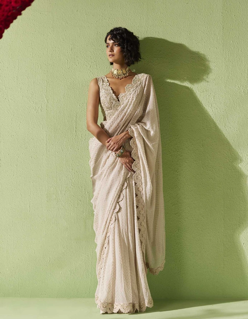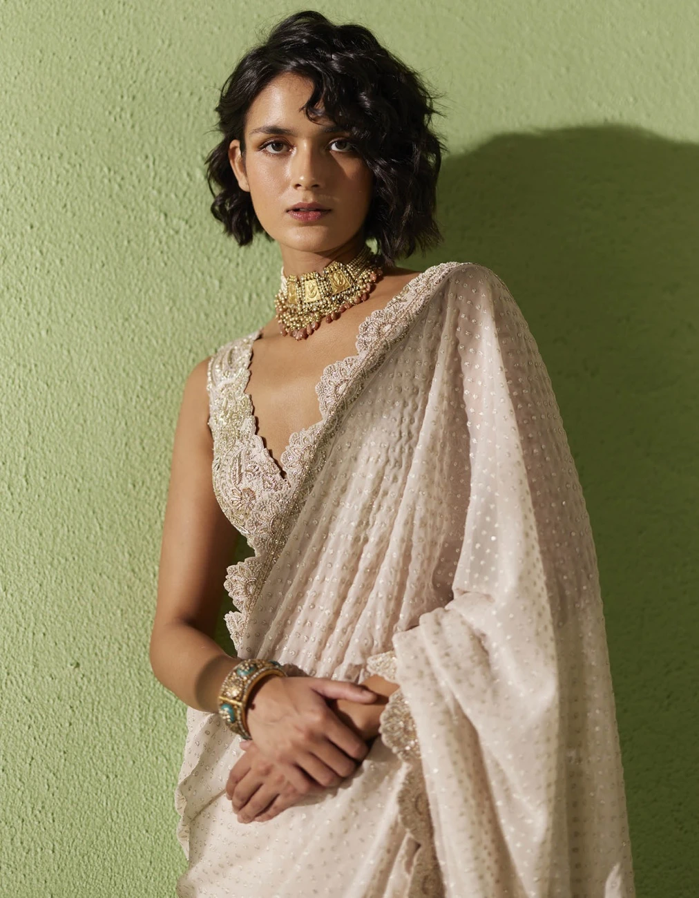 - Ivory sleeveless blouse with plunge neckline and ivory resham, zardozi and pearls hand embroidery