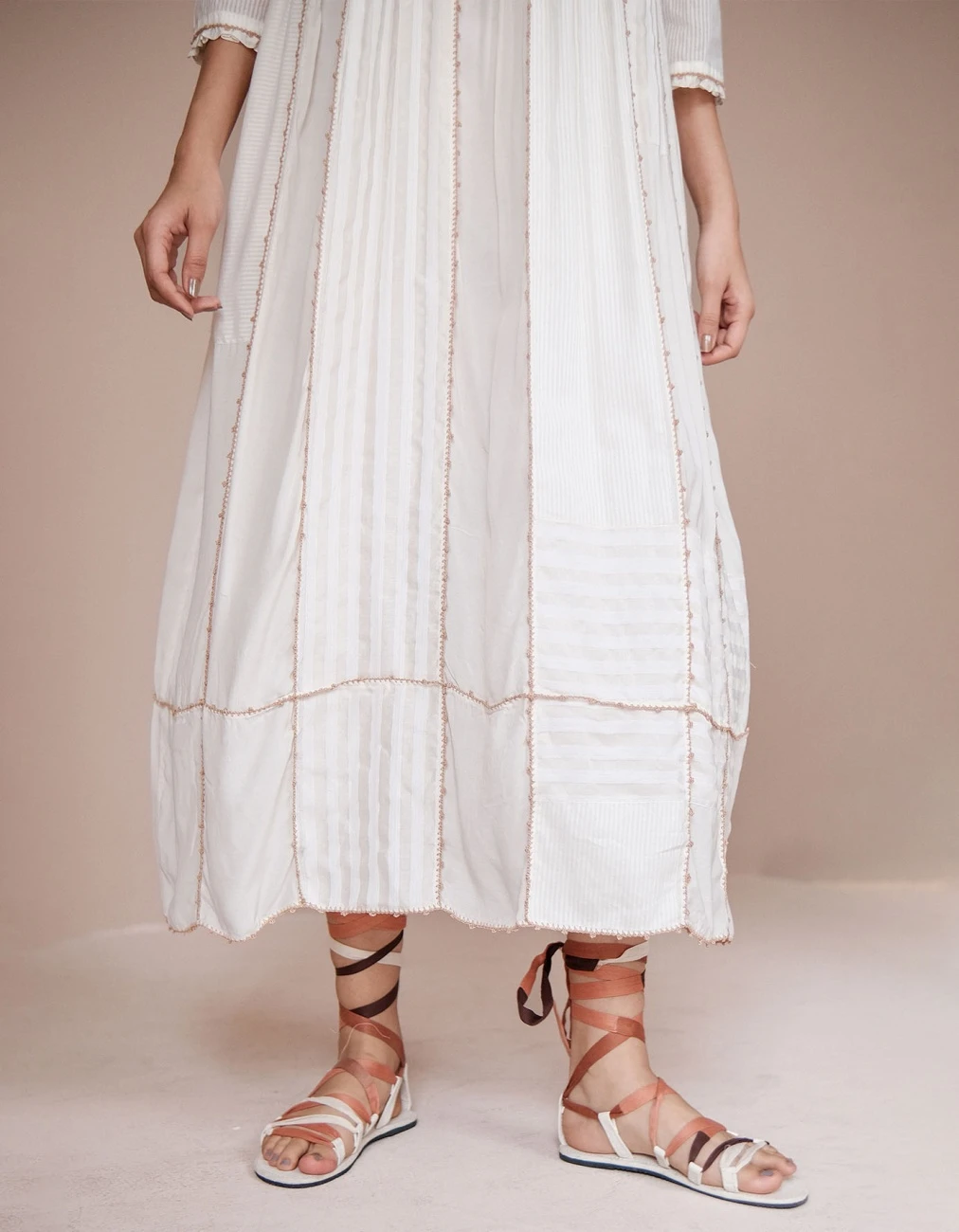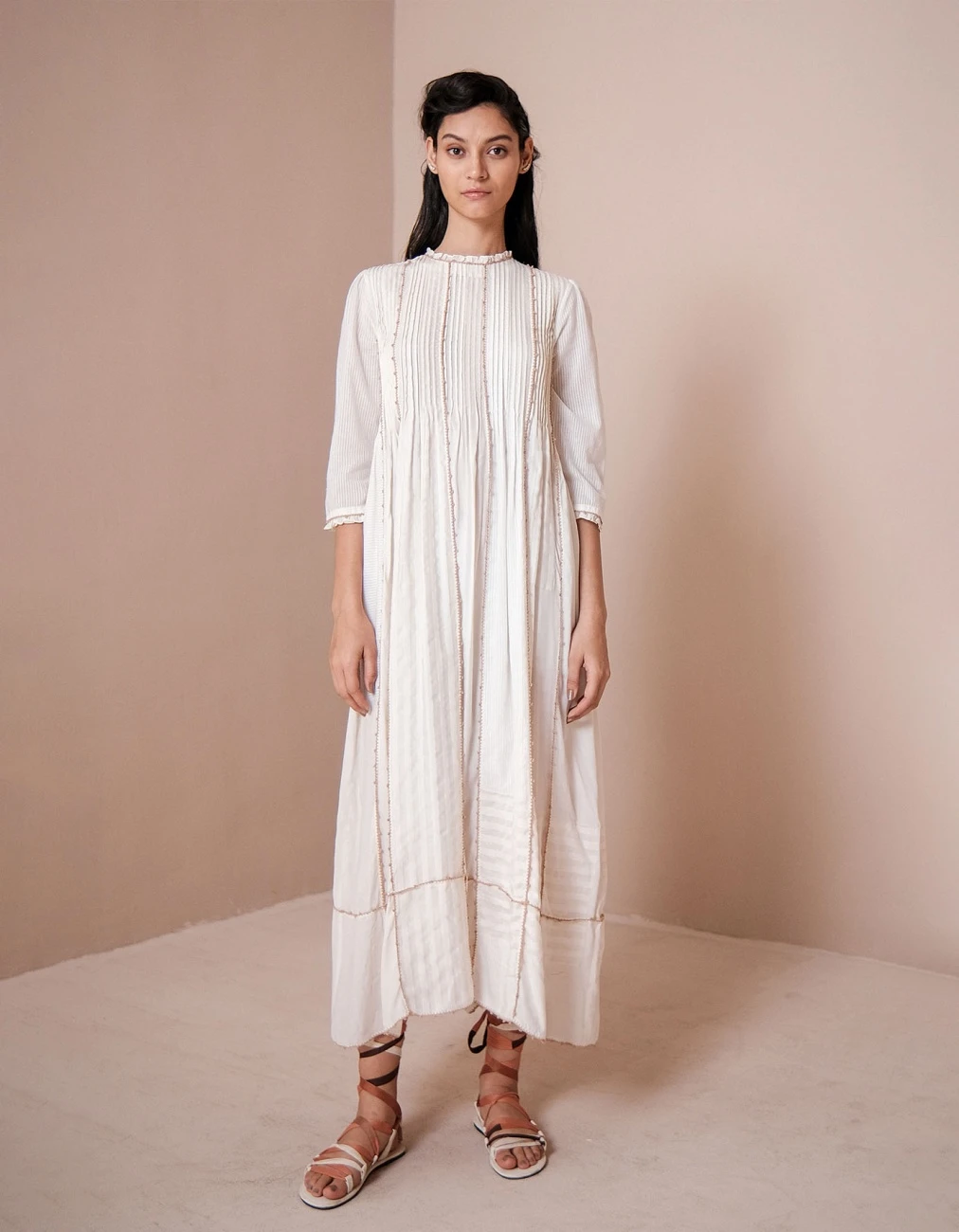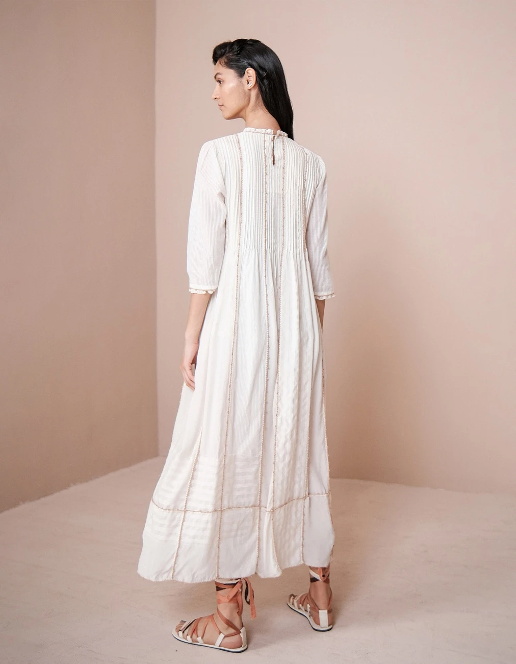 - Breathable lounge dress with pinctucks, frills and hand crochet button details