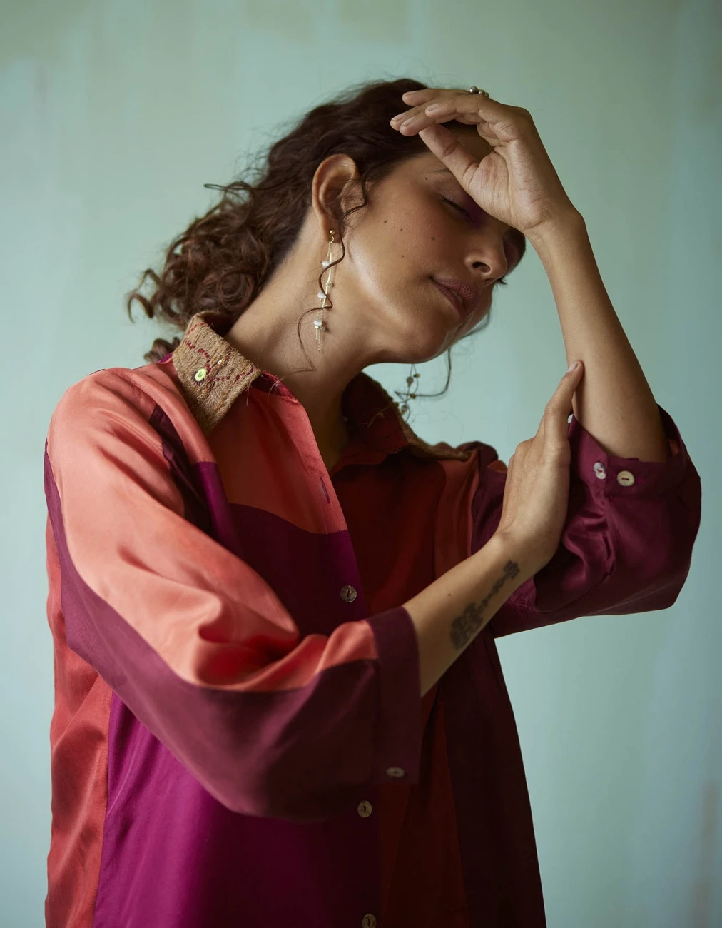 - Plum asymmetrical shirt featuring hand embroideryroidered collar