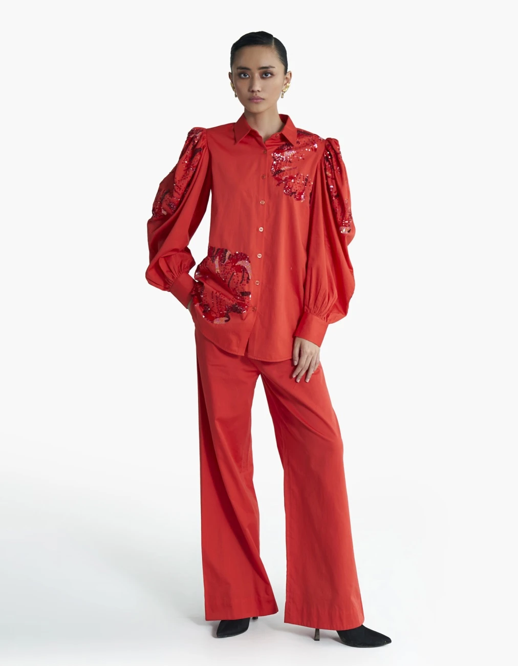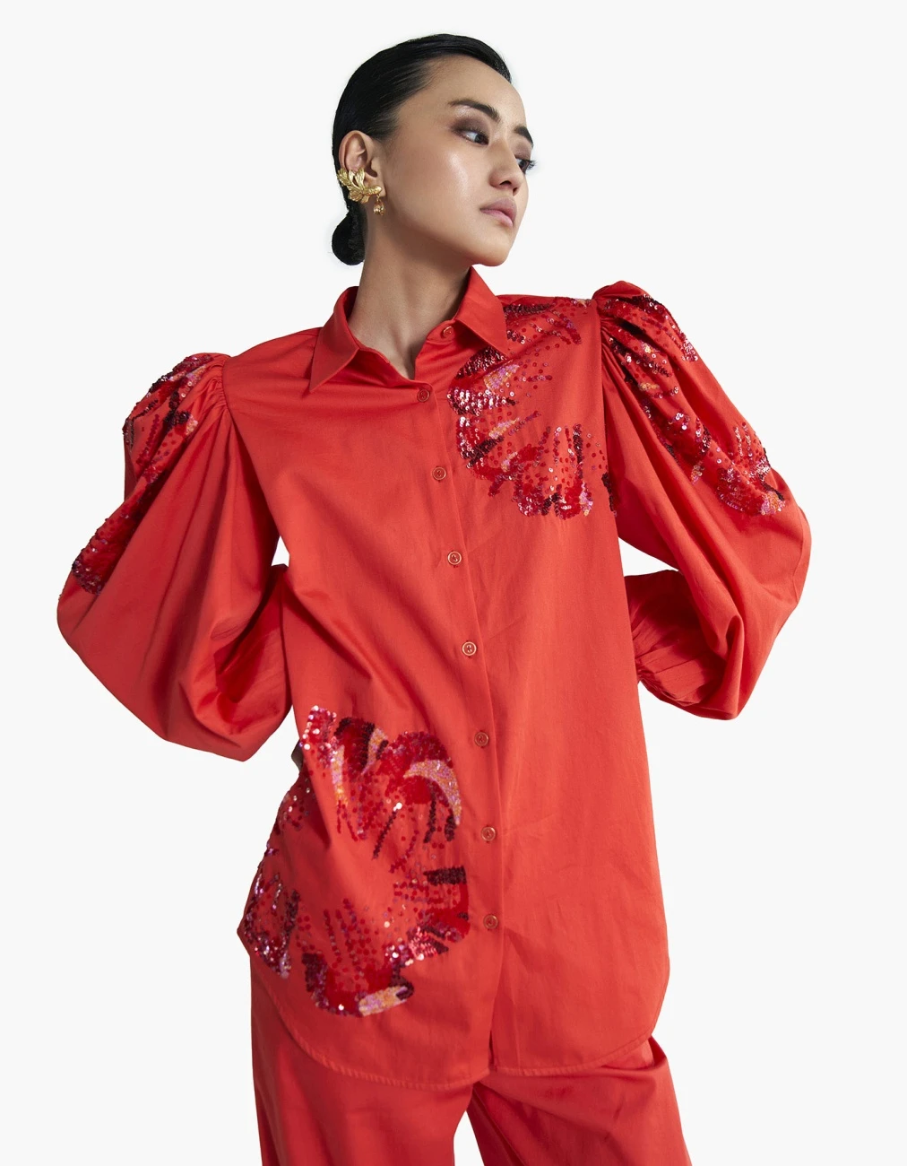 - Poppy Red Egyptian Giza Cotton Embrodiered Puffed Sleeve Shirt