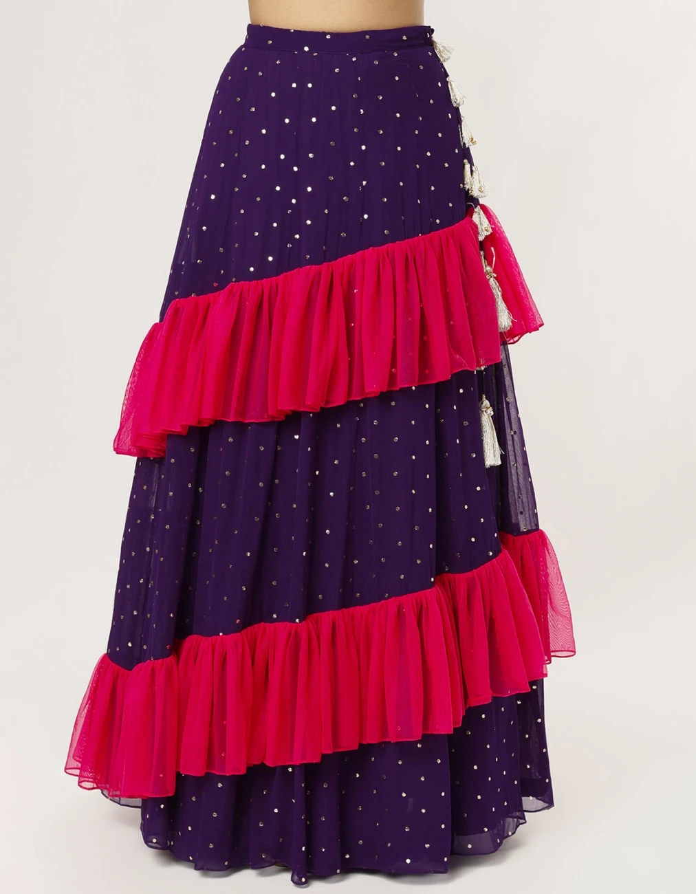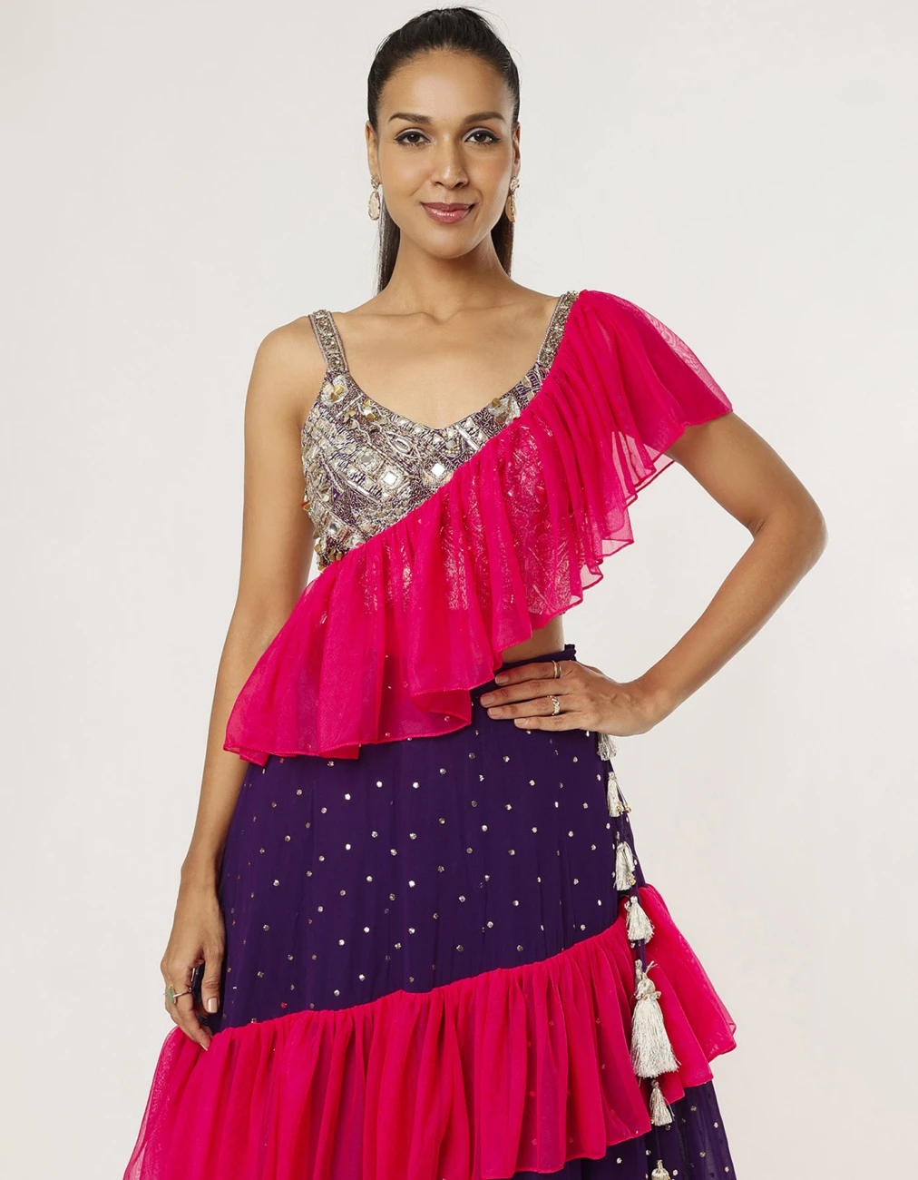 - Purple georgette embroidered choli wand mukaish georgette lehenga with attached hot pink Soft net frills