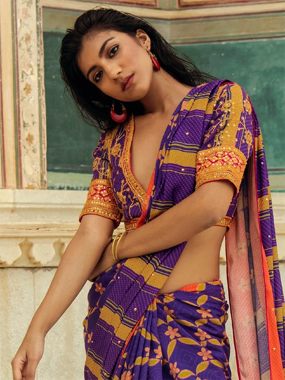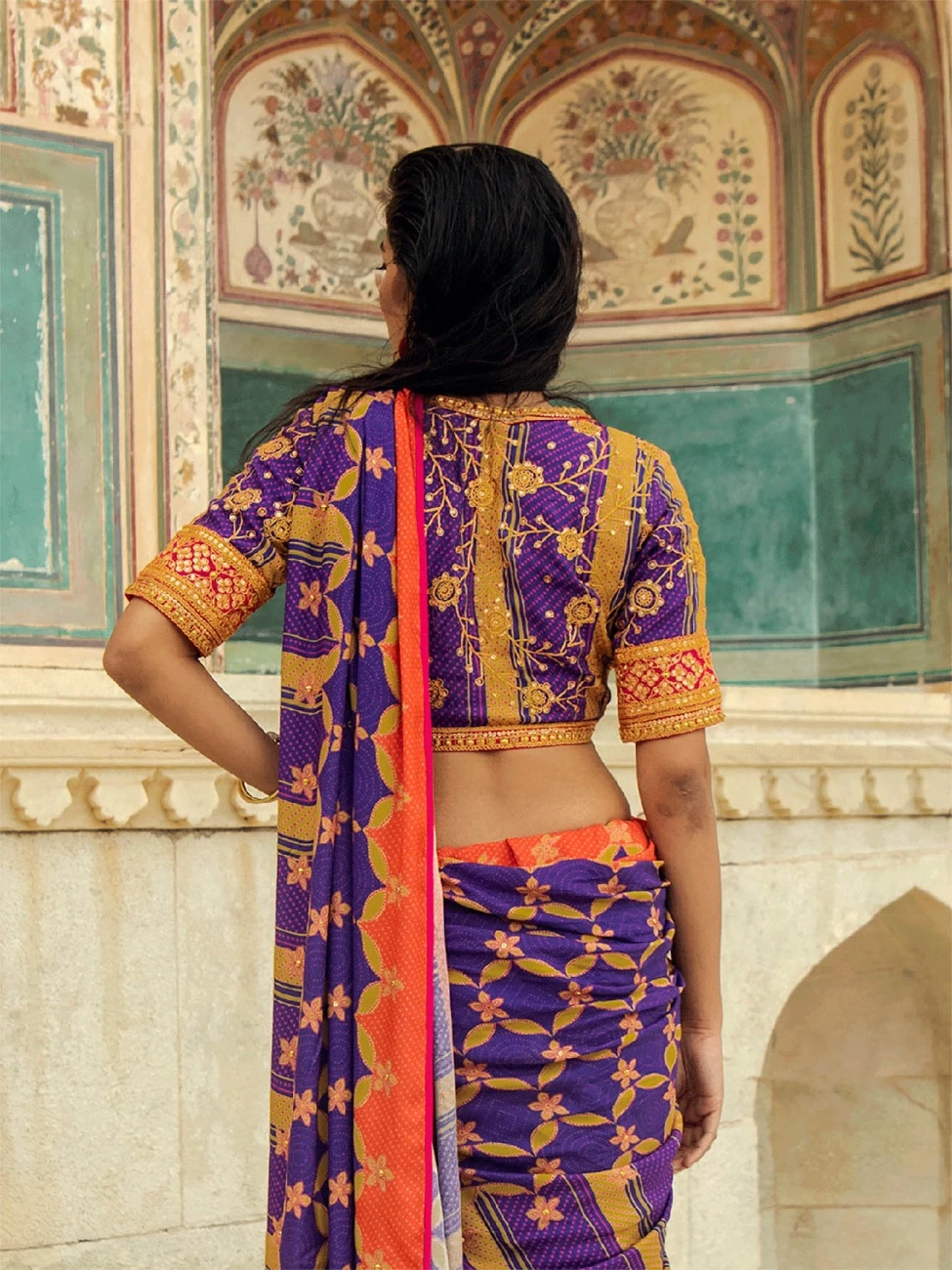 - Makrana blouse is beautifully hand embroidered with applique and marodi work on hand printed striped modal silk fabric