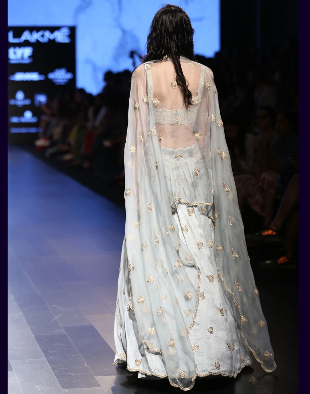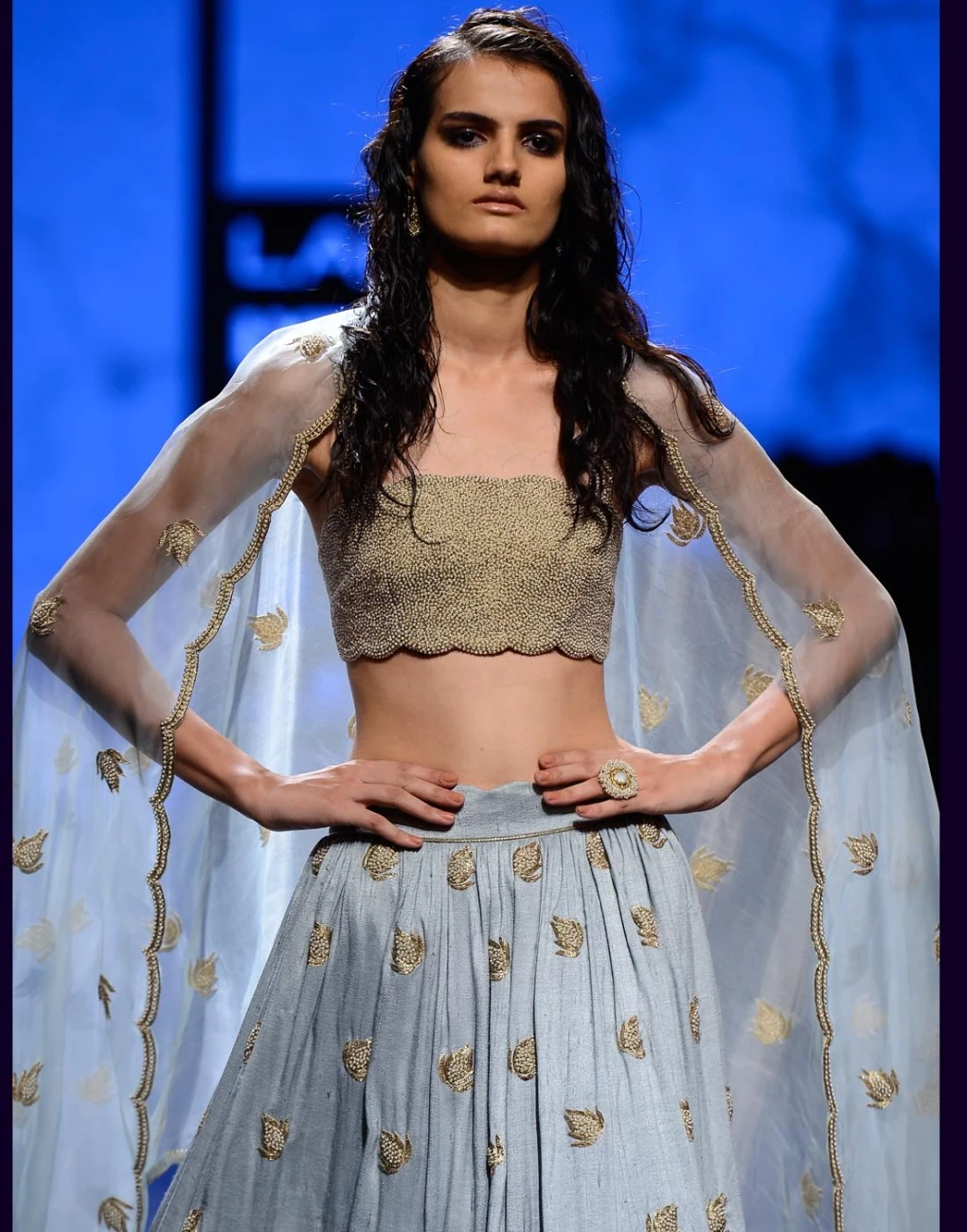 Payal Singhal combines clean and minimalist cuts with exquisite pearl and mukaish embroidery. The silhouettes seamlessly merge the traditional and the modern by pairing off-shoulder cholis with lehengas, and featuring cold shoulder kurtas and scalloped hemlines.