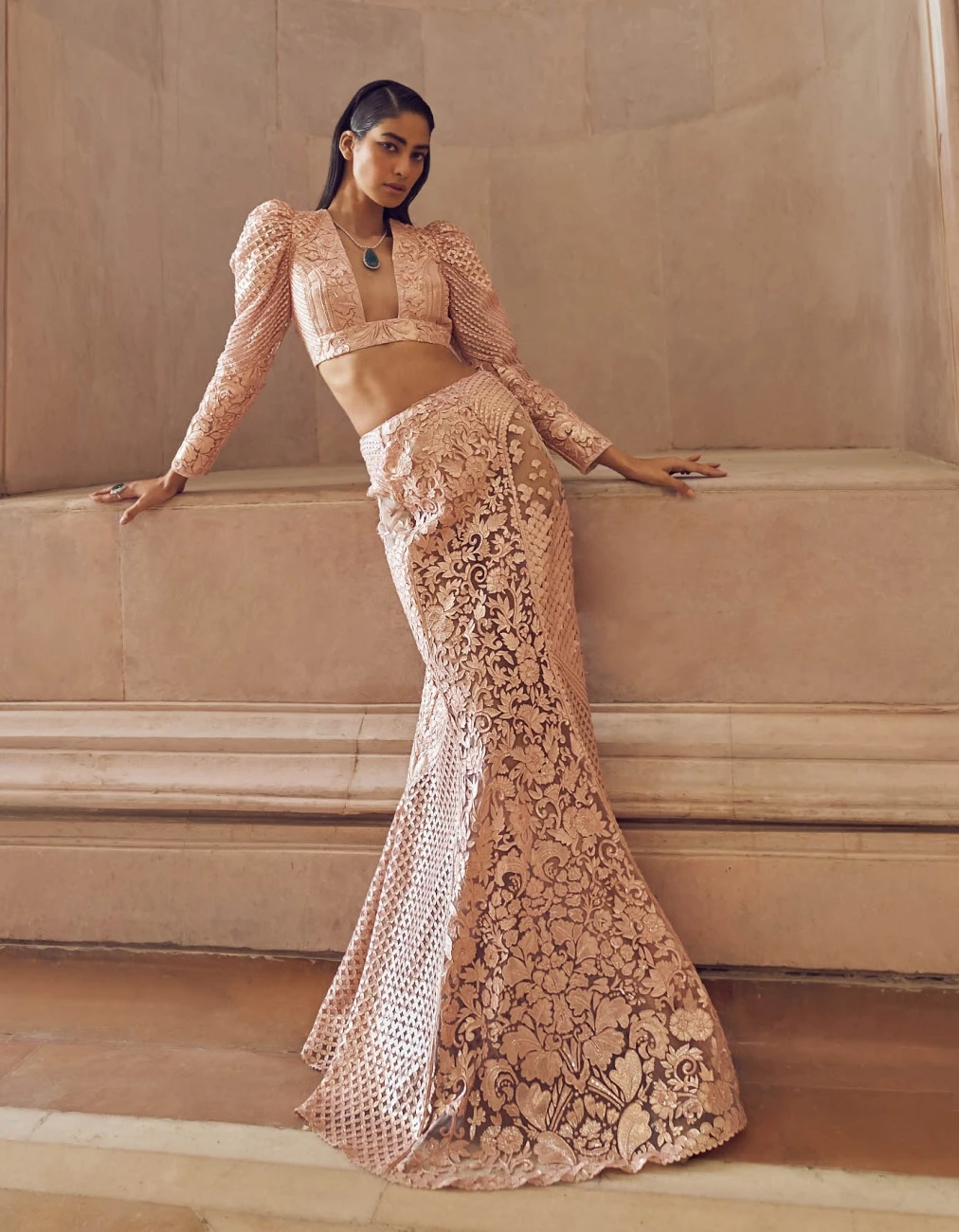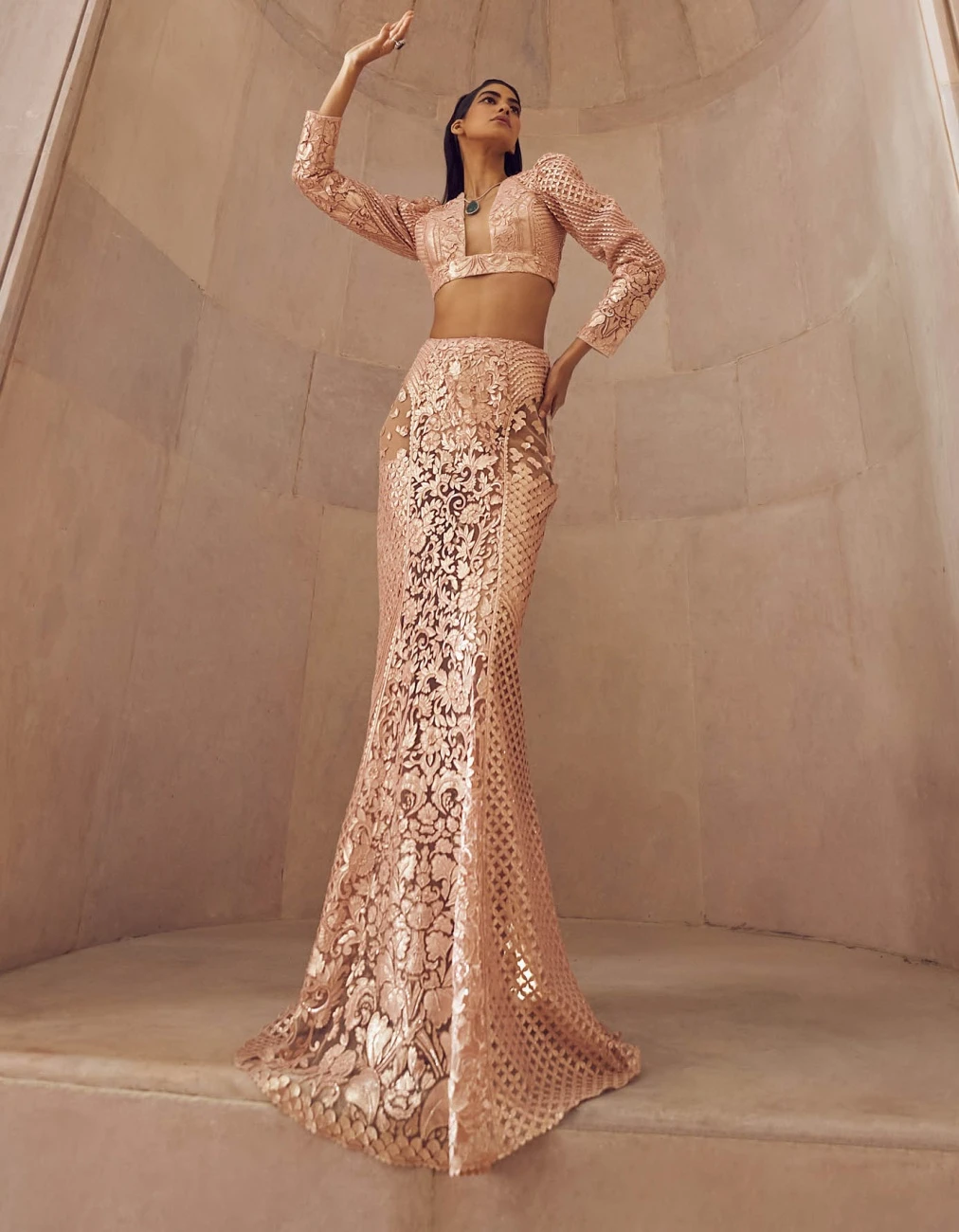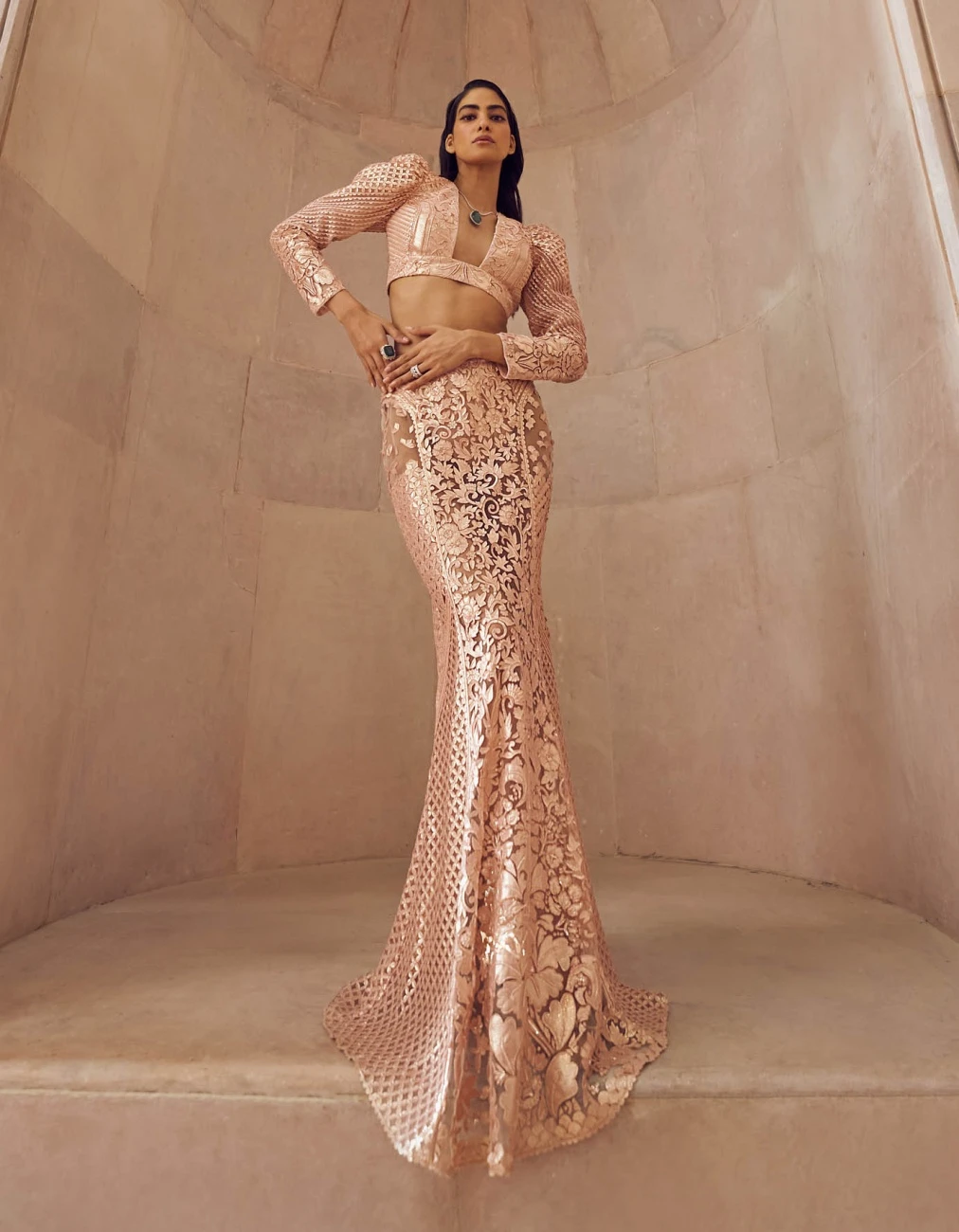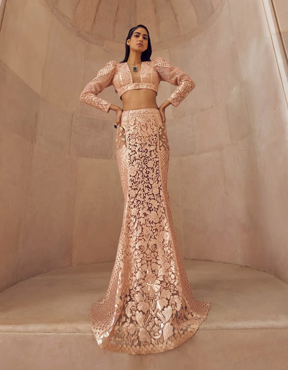 - Rose Gold Solarium Hand Embellished Blouse And Skirt Set